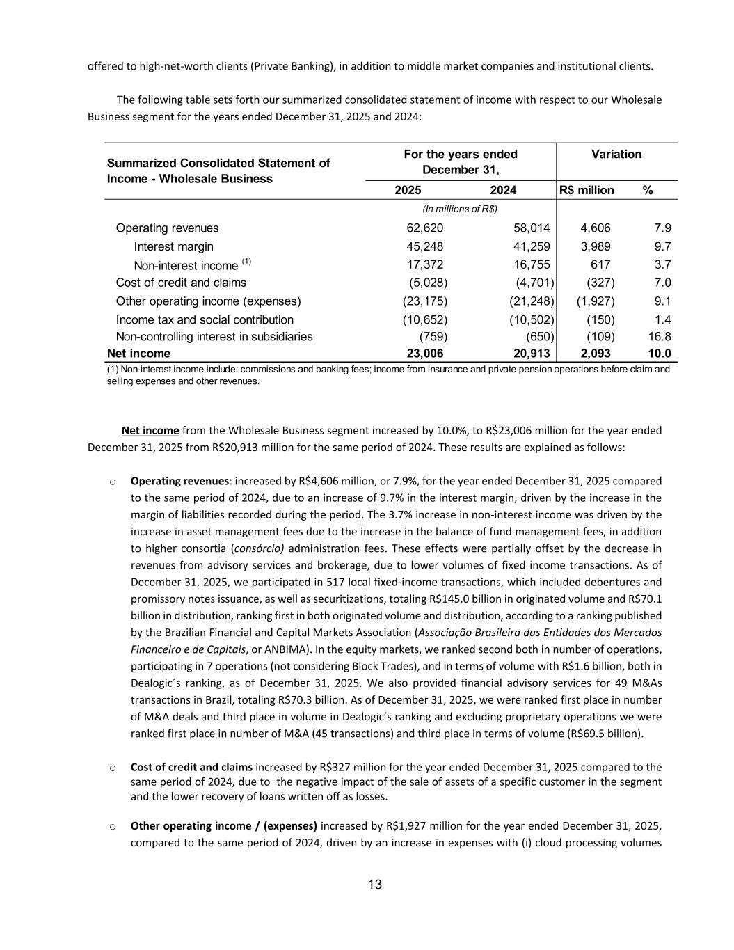 13 offered to high-net-worth clients (Private Banking), in addition to middle market companies and institutional clients. The following table sets forth our summarized consolidated statement of income with respect to our Wholesale Business segment for the years ended December 31, 2025 and 2024: Net income from the Wholesale Business segment increased by 10.0%, to R$23,006 million for the year ended December 31, 2025 from R$20,913 million for the same period of 2024. These results are explained as follows: o Operating revenues: increased by R$4,606 million, or 7.9%, for the year ended December 31, 2025 compared to the same period of 2024, due to an increase of 9.7% in the interest margin, driven by the increase in the margin of liabilities recorded during the period. The 3.7% increase in non-interest income was driven by the increase in asset management fees due to the increase in the balance of fund management fees, in addition to higher consortia (consórcio) administration fees. These effects were partially offset by the decrease in revenues from advisory services and brokerage, due to lower volumes of fixed income transactions. As of December 31, 2025, we participated in 517 local fixed-income transactions, which included debentures and promissory notes issuance, as well as securitizations, totaling R$145.0 billion in originated volume and R$70.1 billion in distribution, ranking first in both originated volume and distribution, according to a ranking published by the Brazilian Financial and Capital Markets Association (Associação Brasileira das Entidades dos Mercados Financeiro e de Capitais, or ANBIMA). In the equity markets, we ranked second both in number of operations, participating in 7 operations (not considering Block Trades), and in terms of volume with R$1.6 billion, both in Dealogic´s ranking, as of December 31, 2025. We also provided financial advisory services for 49 M&As transactions in Brazil, totaling R$70.3 billion. As of December 31, 2025, we were ranked first place in number of M&A deals and third place in volume in Dealogic’s ranking and excluding proprietary operations we were ranked first place in number of M&A (45 transactions) and third place in terms of volume (R$69.5 billion). o Cost of credit and claims increased by R$327 million for the year ended December 31, 2025 compared to the same period of 2024, due to the negative impact of the sale of assets of a specific customer in the segment and the lower recovery of loans written off as losses. o Other operating income / (expenses) increased by R$1,927 million for the year ended December 31, 2025, compared to the same period of 2024, driven by an increase in expenses with (i) cloud processing volumes 2025 2024 R$ million % Operating revenues 62,620 58,014 4,606 7.9 Interest margin 45,248 41,259 3,989 9.7 Non-interest income (1) 17,372 16,755 617 3.7 Cost of credit and claims (5,028) (4,701) (327) 7.0 Other operating income (expenses) (23,175) (21,248) (1,927) 9.1 Income tax and social contribution (10,652) (10,502) (150) 1.4 Non-controlling interest in subsidiaries (759) (650) (109) 16.8 Net income 23,006 20,913 2,093 10.0 Summarized Consolidated Statement of Income - Wholesale Business For the years ended December 31, Variation (In millions of R$) (1) Non-interest income include: commissions and banking fees; income from insurance and private pension operations before claim and selling expenses and other revenues.