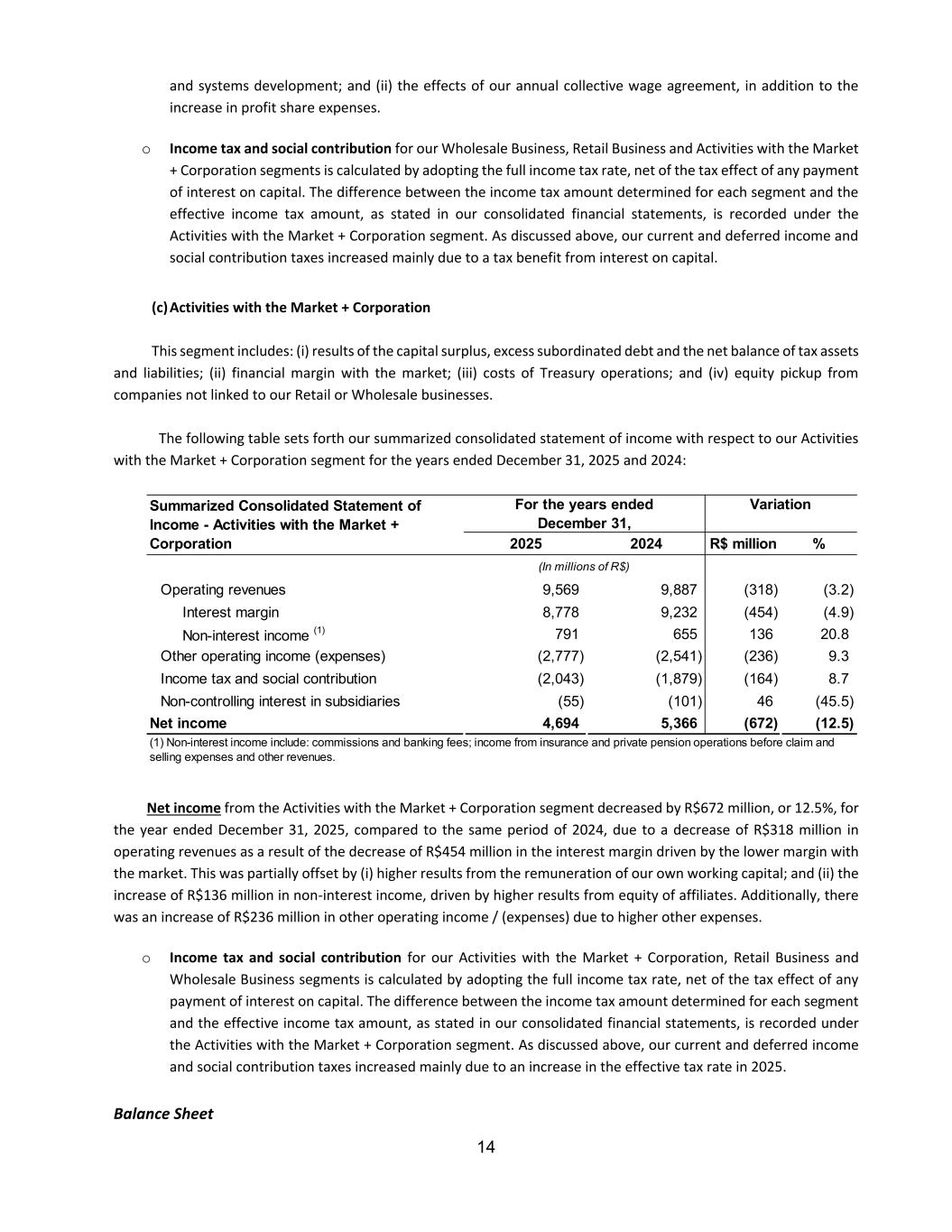 14 and systems development; and (ii) the effects of our annual collective wage agreement, in addition to the increase in profit share expenses. o Income tax and social contribution for our Wholesale Business, Retail Business and Activities with the Market + Corporation segments is calculated by adopting the full income tax rate, net of the tax effect of any payment of interest on capital. The difference between the income tax amount determined for each segment and the effective income tax amount, as stated in our consolidated financial statements, is recorded under the Activities with the Market + Corporation segment. As discussed above, our current and deferred income and social contribution taxes increased mainly due to a tax benefit from interest on capital. (c) Activities with the Market + Corporation This segment includes: (i) results of the capital surplus, excess subordinated debt and the net balance of tax assets and liabilities; (ii) financial margin with the market; (iii) costs of Treasury operations; and (iv) equity pickup from companies not linked to our Retail or Wholesale businesses. The following table sets forth our summarized consolidated statement of income with respect to our Activities with the Market + Corporation segment for the years ended December 31, 2025 and 2024: Net income from the Activities with the Market + Corporation segment decreased by R$672 million, or 12.5%, for the year ended December 31, 2025, compared to the same period of 2024, due to a decrease of R$318 million in operating revenues as a result of the decrease of R$454 million in the interest margin driven by the lower margin with the market. This was partially offset by (i) higher results from the remuneration of our own working capital; and (ii) the increase of R$136 million in non-interest income, driven by higher results from equity of affiliates. Additionally, there was an increase of R$236 million in other operating income / (expenses) due to higher other expenses. o Income tax and social contribution for our Activities with the Market + Corporation, Retail Business and Wholesale Business segments is calculated by adopting the full income tax rate, net of the tax effect of any payment of interest on capital. The difference between the income tax amount determined for each segment and the effective income tax amount, as stated in our consolidated financial statements, is recorded under the Activities with the Market + Corporation segment. As discussed above, our current and deferred income and social contribution taxes increased mainly due to an increase in the effective tax rate in 2025. Balance Sheet 2025 2024 R$ million % Operating revenues 9,569 9,887 (318) (3.2) Interest margin 8,778 9,232 (454) (4.9) Non-interest income (1) 791 655 136 20.8 Other operating income (expenses) (2,777) (2,541) (236) 9.3 Income tax and social contribution (2,043) (1,879) (164) 8.7 Non-controlling interest in subsidiaries (55) (101) 46 (45.5) Net income 4,694 5,366 (672) (12.5) Summarized Consolidated Statement of Income - Activities with the Market + Corporation For the years ended December 31, Variation (In millions of R$) (1) Non-interest income include: commissions and banking fees; income from insurance and private pension operations before claim and selling expenses and other revenues.