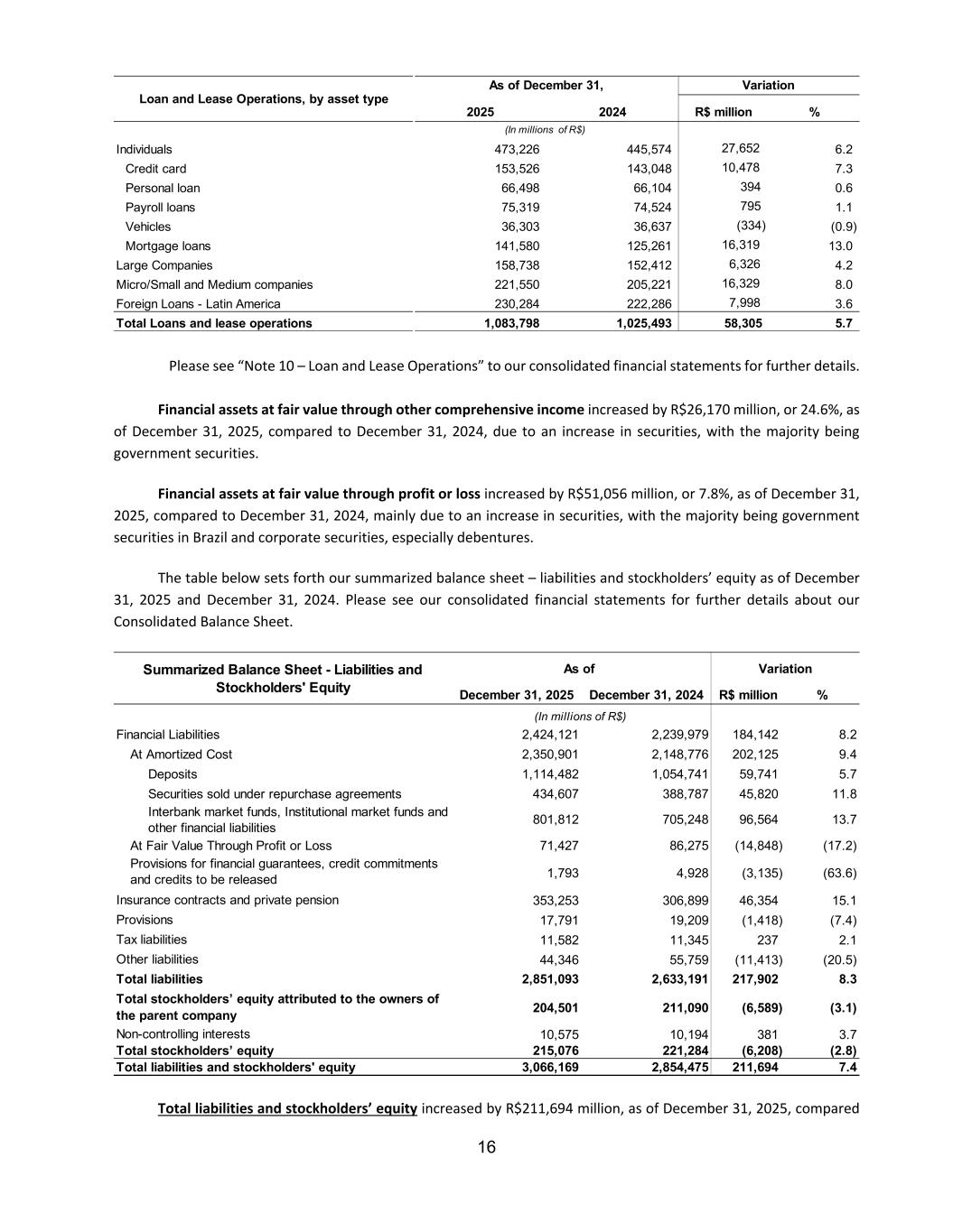 16 Please see “Note 10 – Loan and Lease Operations” to our consolidated financial statements for further details. Financial assets at fair value through other comprehensive income increased by R$26,170 million, or 24.6%, as of December 31, 2025, compared to December 31, 2024, due to an increase in securities, with the majority being government securities. Financial assets at fair value through profit or loss increased by R$51,056 million, or 7.8%, as of December 31, 2025, compared to December 31, 2024, mainly due to an increase in securities, with the majority being government securities in Brazil and corporate securities, especially debentures. The table below sets forth our summarized balance sheet – liabilities and stockholders’ equity as of December 31, 2025 and December 31, 2024. Please see our consolidated financial statements for further details about our Consolidated Balance Sheet. Total liabilities and stockholders’ equity increased by R$211,694 million, as of December 31, 2025, compared 2025 2024 R$ million % Individuals 473,226 445,574 27,652 6.2 Credit card 153,526 143,048 10,478 7.3 Personal loan 66,498 66,104 394 0.6 Payroll loans 75,319 74,524 795 1.1 Vehicles 36,303 36,637 (334) (0.9) Mortgage loans 141,580 125,261 16,319 13.0 Large Companies 158,738 152,412 6,326 4.2 Micro/Small and Medium companies 221,550 205,221 16,329 8.0 Foreign Loans - Latin America 230,284 222,286 7,998 3.6 Total Loans and lease operations 1,083,798 1,025,493 58,305 5.7 Variation (In millions of R$) As of December 31, Loan and Lease Operations, by asset type December 31, 2025 December 31, 2024 R$ million % Financial Liabilities 2,424,121 2,239,979 184,142 8.2 At Amortized Cost 2,350,901 2,148,776 202,125 9.4 Deposits 1,114,482 1,054,741 59,741 5.7 Securities sold under repurchase agreements 434,607 388,787 45,820 11.8 Interbank market funds, Institutional market funds and other financial liabilities 801,812 705,248 96,564 13.7 At Fair Value Through Profit or Loss 71,427 86,275 (14,848) (17.2) 1,793 4,928 (3,135) (63.6) 353,253 306,899 46,354 15.1 17,791 19,209 (1,418) (7.4) 11,582 11,345 237 2.1 44,346 55,759 (11,413) (20.5) 2,851,093 2,633,191 217,902 8.3 204,501 211,090 (6,589) (3.1) 10,575 10,194 381 3.7 215,076 221,284 (6,208) (2.8) 3,066,169 2,854,475 211,694 7.4 Total stockholders’ equity Total liabilities and stockholders' equity Provisions Tax liabilities Other liabilities Total liabilities Total stockholders’ equity attributed to the owners of the parent company Non-controlling interests Insurance contracts and private pension Summarized Balance Sheet - Liabilities and Stockholders' Equity (In millions of R$) As of Variation Provisions for financial guarantees, credit commitments and credits to be released