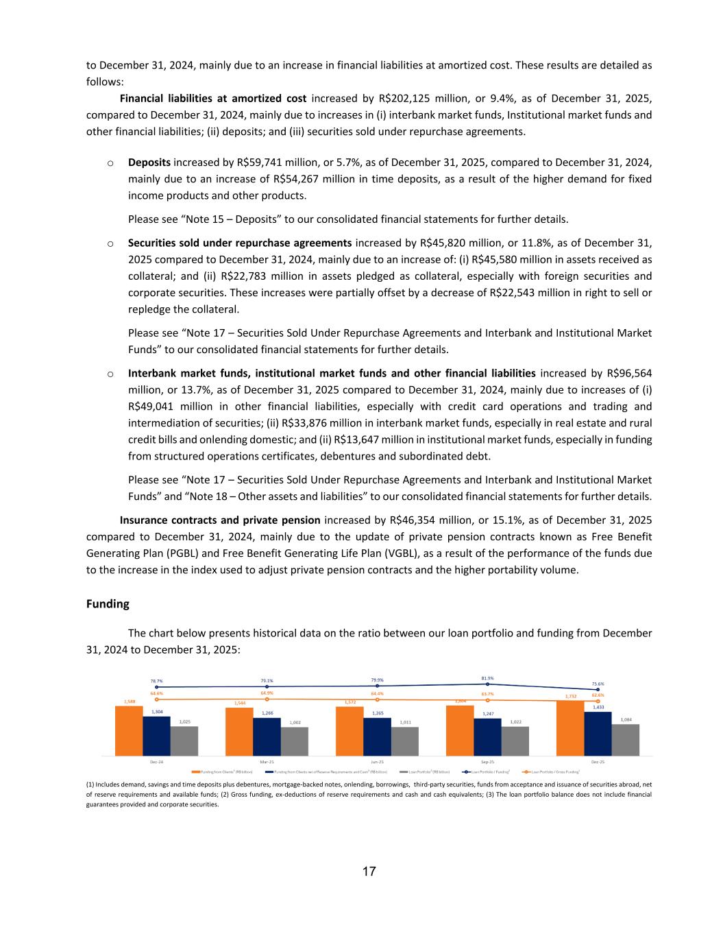 17 to December 31, 2024, mainly due to an increase in financial liabilities at amortized cost. These results are detailed as follows: Financial liabilities at amortized cost increased by R$202,125 million, or 9.4%, as of December 31, 2025, compared to December 31, 2024, mainly due to increases in (i) interbank market funds, Institutional market funds and other financial liabilities; (ii) deposits; and (iii) securities sold under repurchase agreements. o Deposits increased by R$59,741 million, or 5.7%, as of December 31, 2025, compared to December 31, 2024, mainly due to an increase of R$54,267 million in time deposits, as a result of the higher demand for fixed income products and other products. Please see “Note 15 – Deposits” to our consolidated financial statements for further details. o Securities sold under repurchase agreements increased by R$45,820 million, or 11.8%, as of December 31, 2025 compared to December 31, 2024, mainly due to an increase of: (i) R$45,580 million in assets received as collateral; and (ii) R$22,783 million in assets pledged as collateral, especially with foreign securities and corporate securities. These increases were partially offset by a decrease of R$22,543 million in right to sell or repledge the collateral. Please see “Note 17 – Securities Sold Under Repurchase Agreements and Interbank and Institutional Market Funds” to our consolidated financial statements for further details. o Interbank market funds, institutional market funds and other financial liabilities increased by R$96,564 million, or 13.7%, as of December 31, 2025 compared to December 31, 2024, mainly due to increases of (i) R$49,041 million in other financial liabilities, especially with credit card operations and trading and intermediation of securities; (ii) R$33,876 million in interbank market funds, especially in real estate and rural credit bills and onlending domestic; and (ii) R$13,647 million in institutional market funds, especially in funding from structured operations certificates, debentures and subordinated debt. Please see “Note 17 – Securities Sold Under Repurchase Agreements and Interbank and Institutional Market Funds” and “Note 18 – Other assets and liabilities” to our consolidated financial statements for further details. Insurance contracts and private pension increased by R$46,354 million, or 15.1%, as of December 31, 2025 compared to December 31, 2024, mainly due to the update of private pension contracts known as Free Benefit Generating Plan (PGBL) and Free Benefit Generating Life Plan (VGBL), as a result of the performance of the funds due to the increase in the index used to adjust private pension contracts and the higher portability volume. Funding The chart below presents historical data on the ratio between our loan portfolio and funding from December 31, 2024 to December 31, 2025: (1) Includes demand, savings and time deposits plus debentures, mortgage-backed notes, onlending, borrowings, third-party securities, funds from acceptance and issuance of securities abroad, net of reserve requirements and available funds; (2) Gross funding, ex-deductions of reserve requirements and cash and cash equivalents; (3) The loan portfolio balance does not include financial guarantees provided and corporate securities.