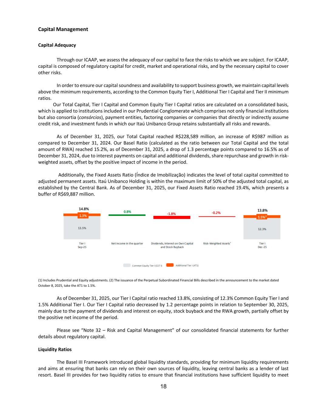 18 Capital Management Capital Adequacy Through our ICAAP, we assess the adequacy of our capital to face the risks to which we are subject. For ICAAP, capital is composed of regulatory capital for credit, market and operational risks, and by the necessary capital to cover other risks. In order to ensure our capital soundness and availability to support business growth, we maintain capital levels above the minimum requirements, according to the Common Equity Tier I, Additional Tier I Capital and Tier II minimum ratios. Our Total Capital, Tier I Capital and Common Equity Tier I Capital ratios are calculated on a consolidated basis, which is applied to institutions included in our Prudential Conglomerate which comprises not only financial institutions but also consortia (consórcios), payment entities, factoring companies or companies that directly or indirectly assume credit risk, and investment funds in which our Itaú Unibanco Group retains substantially all risks and rewards. As of December 31, 2025, our Total Capital reached R$228,589 million, an increase of R$987 million as compared to December 31, 2024. Our Basel Ratio (calculated as the ratio between our Total Capital and the total amount of RWA) reached 15.2%, as of December 31, 2025, a drop of 1.3 percentage points compared to 16.5% as of December 31, 2024, due to interest payments on capital and additional dividends, share repurchase and growth in risk- weighted assets, offset by the positive impact of income in the period. Additionally, the Fixed Assets Ratio (Índice de Imobilização) indicates the level of total capital committed to adjusted permanent assets. Itaú Unibanco Holding is within the maximum limit of 50% of the adjusted total capital, as established by the Central Bank. As of December 31, 2025, our Fixed Assets Ratio reached 19.4%, which presents a buffer of R$69,887 million. (1) Includes Prudential and Equity adjustments. (2) The issuance of the Perpetual Subordinated Financial Bills described in the announcement to the market dated October 8, 2025, take the AT1 to 1.5%. As of December 31, 2025, our Tier I Capital ratio reached 13.8%, consisting of 12.3% Common Equity Tier I and 1.5% Additional Tier I. Our Tier I Capital ratio decreased by 1.2 percentage points in relation to September 30, 2025, mainly due to the payment of dividends and interest on equity, stock buyback and the RWA growth, partially offset by the positive net income of the period. Please see “Note 32 – Risk and Capital Management” of our consolidated financial statements for further details about regulatory capital. Liquidity Ratios The Basel III Framework introduced global liquidity standards, providing for minimum liquidity requirements and aims at ensuring that banks can rely on their own sources of liquidity, leaving central banks as a lender of last resort. Basel III provides for two liquidity ratios to ensure that financial institutions have sufficient liquidity to meet