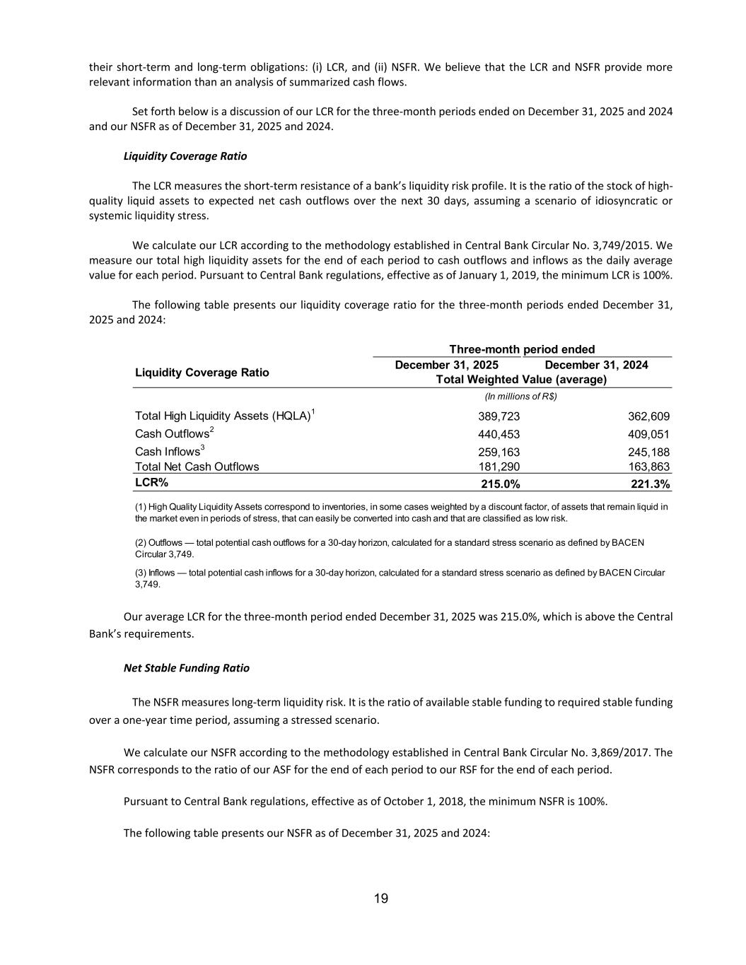 19 their short-term and long-term obligations: (i) LCR, and (ii) NSFR. We believe that the LCR and NSFR provide more relevant information than an analysis of summarized cash flows. Set forth below is a discussion of our LCR for the three-month periods ended on December 31, 2025 and 2024 and our NSFR as of December 31, 2025 and 2024. Liquidity Coverage Ratio The LCR measures the short-term resistance of a bank’s liquidity risk profile. It is the ratio of the stock of high- quality liquid assets to expected net cash outflows over the next 30 days, assuming a scenario of idiosyncratic or systemic liquidity stress. We calculate our LCR according to the methodology established in Central Bank Circular No. 3,749/2015. We measure our total high liquidity assets for the end of each period to cash outflows and inflows as the daily average value for each period. Pursuant to Central Bank regulations, effective as of January 1, 2019, the minimum LCR is 100%. The following table presents our liquidity coverage ratio for the three-month periods ended December 31, 2025 and 2024: Our average LCR for the three-month period ended December 31, 2025 was 215.0%, which is above the Central Bank’s requirements. Net Stable Funding Ratio The NSFR measures long-term liquidity risk. It is the ratio of available stable funding to required stable funding over a one-year time period, assuming a stressed scenario. We calculate our NSFR according to the methodology established in Central Bank Circular No. 3,869/2017. The NSFR corresponds to the ratio of our ASF for the end of each period to our RSF for the end of each period. Pursuant to Central Bank regulations, effective as of October 1, 2018, the minimum NSFR is 100%. The following table presents our NSFR as of December 31, 2025 and 2024: December 31, 2025 December 31, 2024 Total High Liquidity Assets (HQLA) 1 389,723 362,609 Cash Outflows 2 440,453 409,051 Cash Inflows 3 259,163 245,188 Total Net Cash Outflows 181,290 163,863 LCR% 215.0% 221.3% (2) Outflows — total potential cash outflows for a 30-day horizon, calculated for a standard stress scenario as defined by BACEN Circular 3,749. (3) Inflows — total potential cash inflows for a 30-day horizon, calculated for a standard stress scenario as defined by BACEN Circular 3,749. Three-month period ended Liquidity Coverage Ratio Total Weighted Value (average) (In millions of R$) (1) High Quality Liquidity Assets correspond to inventories, in some cases weighted by a discount factor, of assets that remain liquid in the market even in periods of stress, that can easily be converted into cash and that are classified as low risk.