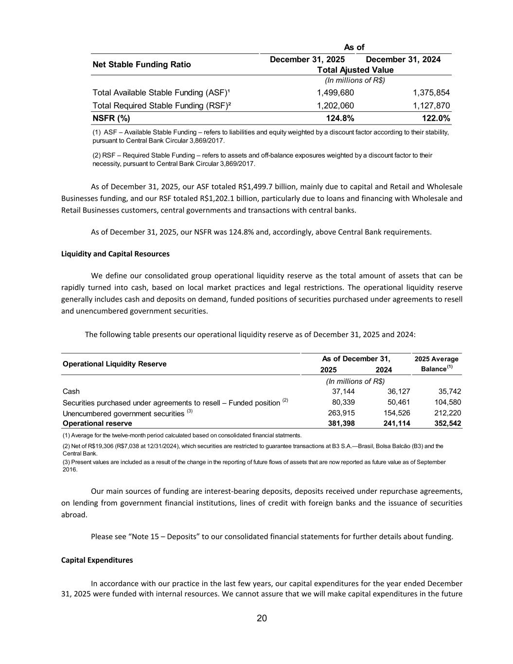 20 As of December 31, 2025, our ASF totaled R$1,499.7 billion, mainly due to capital and Retail and Wholesale Businesses funding, and our RSF totaled R$1,202.1 billion, particularly due to loans and financing with Wholesale and Retail Businesses customers, central governments and transactions with central banks. As of December 31, 2025, our NSFR was 124.8% and, accordingly, above Central Bank requirements. Liquidity and Capital Resources We define our consolidated group operational liquidity reserve as the total amount of assets that can be rapidly turned into cash, based on local market practices and legal restrictions. The operational liquidity reserve generally includes cash and deposits on demand, funded positions of securities purchased under agreements to resell and unencumbered government securities. The following table presents our operational liquidity reserve as of December 31, 2025 and 2024: Our main sources of funding are interest-bearing deposits, deposits received under repurchase agreements, on lending from government financial institutions, lines of credit with foreign banks and the issuance of securities abroad. Please see “Note 15 – Deposits” to our consolidated financial statements for further details about funding. Capital Expenditures In accordance with our practice in the last few years, our capital expenditures for the year ended December 31, 2025 were funded with internal resources. We cannot assure that we will make capital expenditures in the future December 31, 2025 December 31, 2024 Total Available Stable Funding (ASF)¹ 1,499,680 1,375,854 Total Required Stable Funding (RSF)² 1,202,060 1,127,870 NSFR (%) 124.8% 122.0% (2) RSF – Required Stable Funding – refers to assets and off-balance exposures weighted by a discount factor to their necessity, pursuant to Central Bank Circular 3,869/2017. As of Net Stable Funding Ratio Total Ajusted Value (In millions of R$) (1) ASF – Available Stable Funding – refers to liabilities and equity weighted by a discount factor according to their stability, pursuant to Central Bank Circular 3,869/2017. 2025 2024 Cash 37,144 36,127 35,742 Securities purchased under agreements to resell – Funded position (2) 80,339 50,461 104,580 Unencumbered government securities (3) 263,915 154,526 212,220 Operational reserve 381,398 241,114 352,542 (1) Average for the twelve-month period calculated based on consolidated financial statments. (2) Net of R$19,306 (R$7,038 at 12/31/2024), which securities are restricted to guarantee transactions at B3 S.A.—Brasil, Bolsa Balcão (B3) and the Central Bank. (3) Present values are included as a result of the change in the reporting of future flows of assets that are now reported as future value as of September 2016. Operational Liquidity Reserve As of December 31, 2025 Average Balance (1) (In millions of R$)