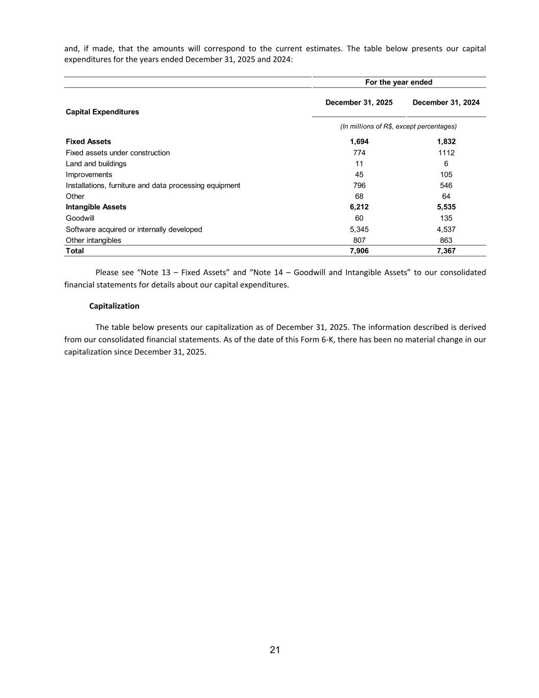 21 and, if made, that the amounts will correspond to the current estimates. The table below presents our capital expenditures for the years ended December 31, 2025 and 2024: Please see “Note 13 – Fixed Assets” and “Note 14 – Goodwill and Intangible Assets” to our consolidated financial statements for details about our capital expenditures. Capitalization The table below presents our capitalization as of December 31, 2025. The information described is derived from our consolidated financial statements. As of the date of this Form 6-K, there has been no material change in our capitalization since December 31, 2025. December 31, 2025 December 31, 2024 Fixed Assets 1,694 1,832 Fixed assets under construction 774 1112 Land and buildings 11 6 Improvements 45 105 Installations, furniture and data processing equipment 796 546 Other 68 64 Intangible Assets 6,212 5,535 Goodwill 60 135 Software acquired or internally developed 5,345 4,537 Other intangibles 807 863 Total 7,906 7,367 Capital Expenditures (In millions of R$, except percentages) For the year ended