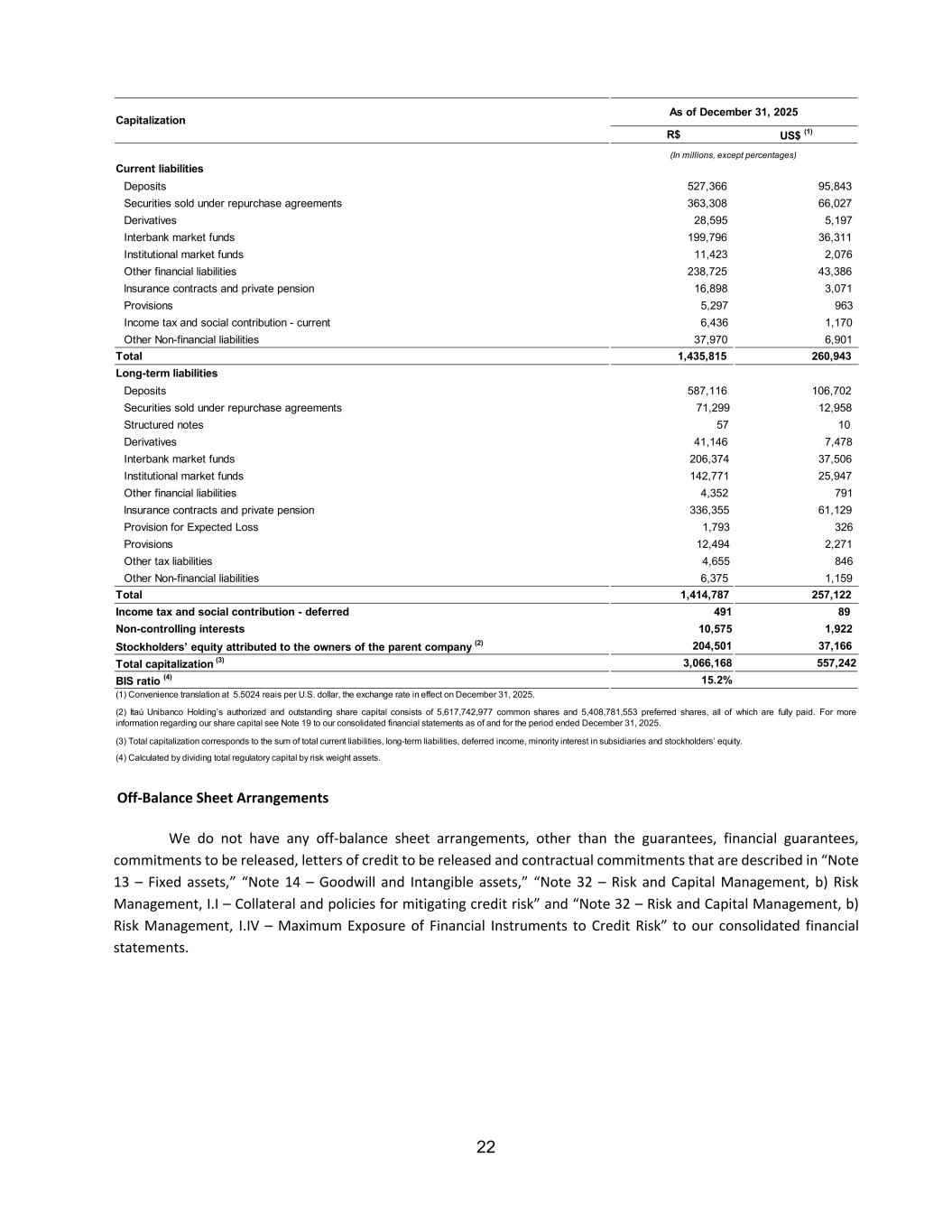 22 Off-Balance Sheet Arrangements We do not have any off-balance sheet arrangements, other than the guarantees, financial guarantees, commitments to be released, letters of credit to be released and contractual commitments that are described in “Note 13 – Fixed assets,” “Note 14 – Goodwill and Intangible assets,” “Note 32 – Risk and Capital Management, b) Risk Management, I.I – Collateral and policies for mitigating credit risk” and “Note 32 – Risk and Capital Management, b) Risk Management, I.IV – Maximum Exposure of Financial Instruments to Credit Risk” to our consolidated financial statements. R$ US$ (1) Current liabilities Deposits 527,366 95,843 Securities sold under repurchase agreements 363,308 66,027 Derivatives 28,595 5,197 Interbank market funds 199,796 36,311 Institutional market funds 11,423 2,076 Other financial liabilities 238,725 43,386 lnsurance contracts and private pension 16,898 3,071 Provisions 5,297 963 Income tax and social contribution - current 6,436 1,170 Other Non-financial liabilities 37,970 6,901 Total 1,435,815 260,943 Long-term liabilities Deposits 587,116 106,702 Securities sold under repurchase agreements 71,299 12,958 Structured notes 57 10 Derivatives 41,146 7,478 Interbank market funds 206,374 37,506 Institutional market funds 142,771 25,947 Other financial liabilities 4,352 791 lnsurance contracts and private pension 336,355 61,129 Provision for Expected Loss 1,793 326 Provisions 12,494 2,271 Other tax liabilities 4,655 846 Other Non-financial liabilities 6,375 1,159 Total 1,414,787 257,122 Income tax and social contribution - deferred 491 89 Non-controlling interests 10,575 1,922 Stockholders’ equity attributed to the owners of the parent company (2) 204,501 37,166 Total capitalization (3) 3,066,168 557,242 BIS ratio (4) 15.2% (1) Convenience translation at 5.5024 reais per U.S. dollar, the exchange rate in effect on December 31, 2025. 5.5024 (3) Total capitalization corresponds to the sum of total current liabilities, long-term liabilities, deferred income, minority interest in subsidiaries and stockholders’ equity. (4) Calculated by dividing total regulatory capital by risk weight assets. Capitalization As of December 31, 2025 (In millions, except percentages) (2) Itaú Unibanco Holding’s authorized and outstanding share capital consists of 5,617,742,977 common shares and 5,408,781,553 preferred shares, all of which are fully paid. For more information regarding our share capital see Note 19 to our consolidated financial statements as of and for the period ended December 31, 2025.