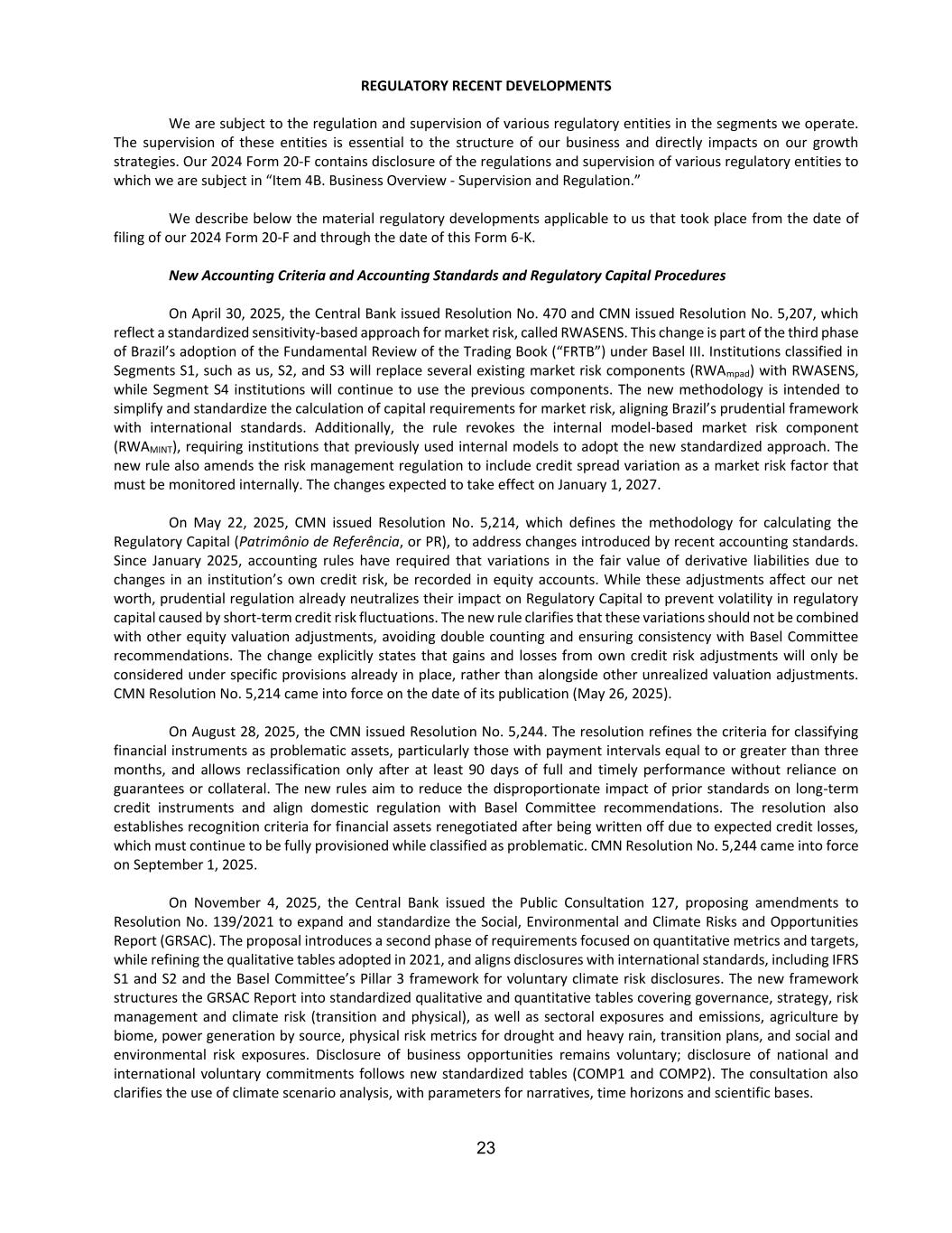 23 REGULATORY RECENT DEVELOPMENTS We are subject to the regulation and supervision of various regulatory entities in the segments we operate. The supervision of these entities is essential to the structure of our business and directly impacts on our growth strategies. Our 2024 Form 20-F contains disclosure of the regulations and supervision of various regulatory entities to which we are subject in “Item 4B. Business Overview - Supervision and Regulation.” We describe below the material regulatory developments applicable to us that took place from the date of filing of our 2024 Form 20-F and through the date of this Form 6-K. New Accounting Criteria and Accounting Standards and Regulatory Capital Procedures On April 30, 2025, the Central Bank issued Resolution No. 470 and CMN issued Resolution No. 5,207, which reflect a standardized sensitivity-based approach for market risk, called RWASENS. This change is part of the third phase of Brazil’s adoption of the Fundamental Review of the Trading Book (“FRTB”) under Basel III. Institutions classified in Segments S1, such as us, S2, and S3 will replace several existing market risk components (RWAmpad) with RWASENS, while Segment S4 institutions will continue to use the previous components. The new methodology is intended to simplify and standardize the calculation of capital requirements for market risk, aligning Brazil’s prudential framework with international standards. Additionally, the rule revokes the internal model-based market risk component (RWAMINT), requiring institutions that previously used internal models to adopt the new standardized approach. The new rule also amends the risk management regulation to include credit spread variation as a market risk factor that must be monitored internally. The changes expected to take effect on January 1, 2027. On May 22, 2025, CMN issued Resolution No. 5,214, which defines the methodology for calculating the Regulatory Capital (Patrimônio de Referência, or PR), to address changes introduced by recent accounting standards. Since January 2025, accounting rules have required that variations in the fair value of derivative liabilities due to changes in an institution’s own credit risk, be recorded in equity accounts. While these adjustments affect our net worth, prudential regulation already neutralizes their impact on Regulatory Capital to prevent volatility in regulatory capital caused by short-term credit risk fluctuations. The new rule clarifies that these variations should not be combined with other equity valuation adjustments, avoiding double counting and ensuring consistency with Basel Committee recommendations. The change explicitly states that gains and losses from own credit risk adjustments will only be considered under specific provisions already in place, rather than alongside other unrealized valuation adjustments. CMN Resolution No. 5,214 came into force on the date of its publication (May 26, 2025). On August 28, 2025, the CMN issued Resolution No. 5,244. The resolution refines the criteria for classifying financial instruments as problematic assets, particularly those with payment intervals equal to or greater than three months, and allows reclassification only after at least 90 days of full and timely performance without reliance on guarantees or collateral. The new rules aim to reduce the disproportionate impact of prior standards on long-term credit instruments and align domestic regulation with Basel Committee recommendations. The resolution also establishes recognition criteria for financial assets renegotiated after being written off due to expected credit losses, which must continue to be fully provisioned while classified as problematic. CMN Resolution No. 5,244 came into force on September 1, 2025. On November 4, 2025, the Central Bank issued the Public Consultation 127, proposing amendments to Resolution No. 139/2021 to expand and standardize the Social, Environmental and Climate Risks and Opportunities Report (GRSAC). The proposal introduces a second phase of requirements focused on quantitative metrics and targets, while refining the qualitative tables adopted in 2021, and aligns disclosures with international standards, including IFRS S1 and S2 and the Basel Committee’s Pillar 3 framework for voluntary climate risk disclosures. The new framework structures the GRSAC Report into standardized qualitative and quantitative tables covering governance, strategy, risk management and climate risk (transition and physical), as well as sectoral exposures and emissions, agriculture by biome, power generation by source, physical risk metrics for drought and heavy rain, transition plans, and social and environmental risk exposures. Disclosure of business opportunities remains voluntary; disclosure of national and international voluntary commitments follows new standardized tables (COMP1 and COMP2). The consultation also clarifies the use of climate scenario analysis, with parameters for narratives, time horizons and scientific bases.
