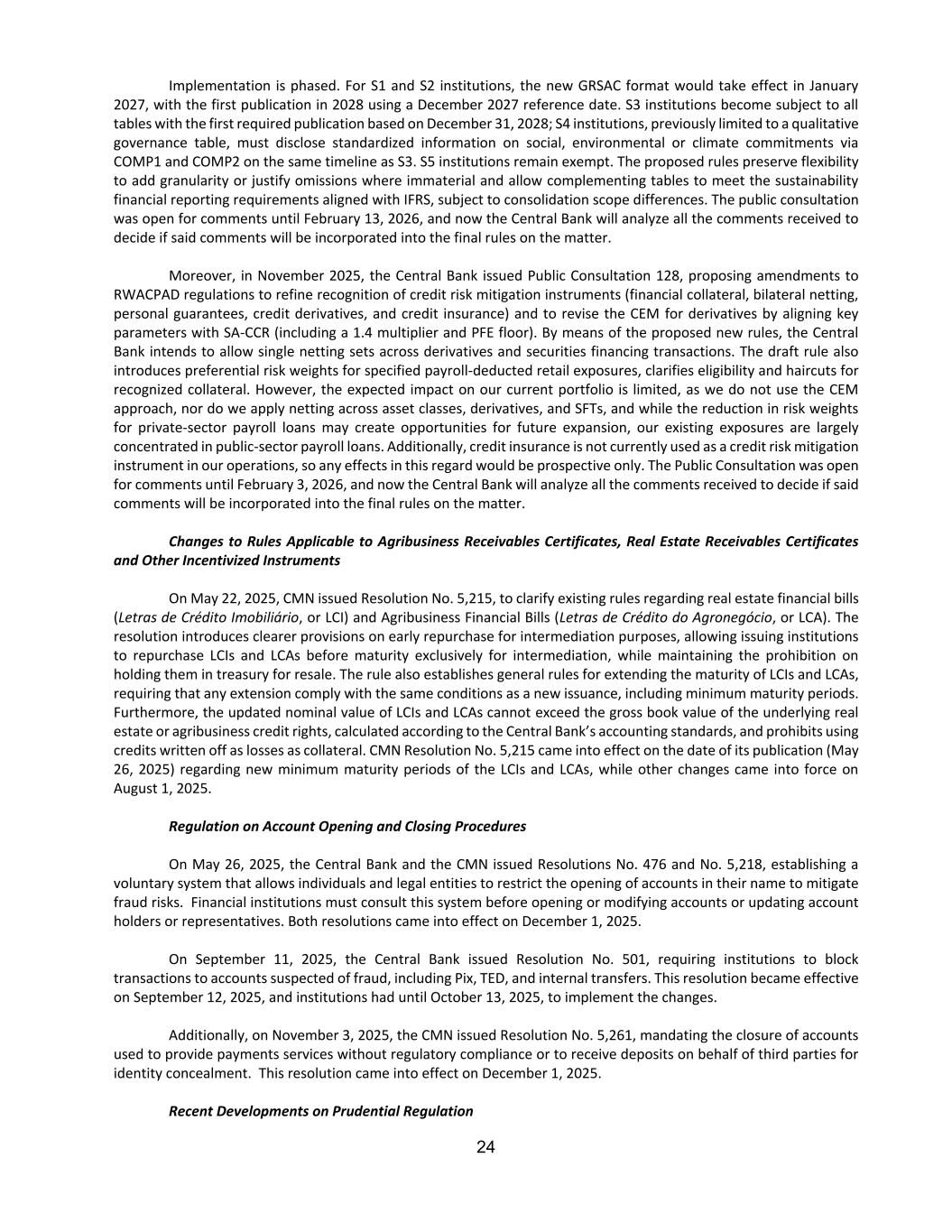 24 Implementation is phased. For S1 and S2 institutions, the new GRSAC format would take effect in January 2027, with the first publication in 2028 using a December 2027 reference date. S3 institutions become subject to all tables with the first required publication based on December 31, 2028; S4 institutions, previously limited to a qualitative governance table, must disclose standardized information on social, environmental or climate commitments via COMP1 and COMP2 on the same timeline as S3. S5 institutions remain exempt. The proposed rules preserve flexibility to add granularity or justify omissions where immaterial and allow complementing tables to meet the sustainability financial reporting requirements aligned with IFRS, subject to consolidation scope differences. The public consultation was open for comments until February 13, 2026, and now the Central Bank will analyze all the comments received to decide if said comments will be incorporated into the final rules on the matter. Moreover, in November 2025, the Central Bank issued Public Consultation 128, proposing amendments to RWACPAD regulations to refine recognition of credit risk mitigation instruments (financial collateral, bilateral netting, personal guarantees, credit derivatives, and credit insurance) and to revise the CEM for derivatives by aligning key parameters with SA-CCR (including a 1.4 multiplier and PFE floor). By means of the proposed new rules, the Central Bank intends to allow single netting sets across derivatives and securities financing transactions. The draft rule also introduces preferential risk weights for specified payroll-deducted retail exposures, clarifies eligibility and haircuts for recognized collateral. However, the expected impact on our current portfolio is limited, as we do not use the CEM approach, nor do we apply netting across asset classes, derivatives, and SFTs, and while the reduction in risk weights for private-sector payroll loans may create opportunities for future expansion, our existing exposures are largely concentrated in public-sector payroll loans. Additionally, credit insurance is not currently used as a credit risk mitigation instrument in our operations, so any effects in this regard would be prospective only. The Public Consultation was open for comments until February 3, 2026, and now the Central Bank will analyze all the comments received to decide if said comments will be incorporated into the final rules on the matter. Changes to Rules Applicable to Agribusiness Receivables Certificates, Real Estate Receivables Certificates and Other Incentivized Instruments On May 22, 2025, CMN issued Resolution No. 5,215, to clarify existing rules regarding real estate financial bills (Letras de Crédito Imobiliário, or LCI) and Agribusiness Financial Bills (Letras de Crédito do Agronegócio, or LCA). The resolution introduces clearer provisions on early repurchase for intermediation purposes, allowing issuing institutions to repurchase LCIs and LCAs before maturity exclusively for intermediation, while maintaining the prohibition on holding them in treasury for resale. The rule also establishes general rules for extending the maturity of LCIs and LCAs, requiring that any extension comply with the same conditions as a new issuance, including minimum maturity periods. Furthermore, the updated nominal value of LCIs and LCAs cannot exceed the gross book value of the underlying real estate or agribusiness credit rights, calculated according to the Central Bank’s accounting standards, and prohibits using credits written off as losses as collateral. CMN Resolution No. 5,215 came into effect on the date of its publication (May 26, 2025) regarding new minimum maturity periods of the LCIs and LCAs, while other changes came into force on August 1, 2025. Regulation on Account Opening and Closing Procedures On May 26, 2025, the Central Bank and the CMN issued Resolutions No. 476 and No. 5,218, establishing a voluntary system that allows individuals and legal entities to restrict the opening of accounts in their name to mitigate fraud risks. Financial institutions must consult this system before opening or modifying accounts or updating account holders or representatives. Both resolutions came into effect on December 1, 2025. On September 11, 2025, the Central Bank issued Resolution No. 501, requiring institutions to block transactions to accounts suspected of fraud, including Pix, TED, and internal transfers. This resolution became effective on September 12, 2025, and institutions had until October 13, 2025, to implement the changes. Additionally, on November 3, 2025, the CMN issued Resolution No. 5,261, mandating the closure of accounts used to provide payments services without regulatory compliance or to receive deposits on behalf of third parties for identity concealment. This resolution came into effect on December 1, 2025. Recent Developments on Prudential Regulation