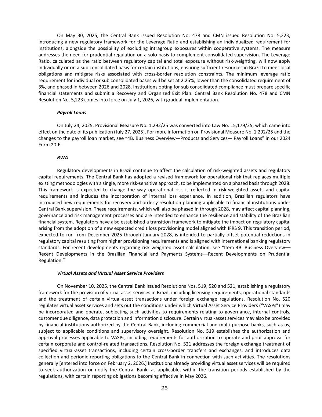 25 On May 30, 2025, the Central Bank issued Resolution No. 478 and CMN issued Resolution No. 5,223, introducing a new regulatory framework for the Leverage Ratio and establishing an individualized requirement for institutions, alongside the possibility of excluding intragroup exposures within cooperative systems. The measure addresses the need for prudential regulation on a solo basis to complement consolidated supervision. The Leverage Ratio, calculated as the ratio between regulatory capital and total exposure without risk-weighting, will now apply individually or on a sub consolidated basis for certain institutions, ensuring sufficient resources in Brazil to meet local obligations and mitigate risks associated with cross-border resolution constraints. The minimum leverage ratio requirement for individual or sub consolidated bases will be set at 2.25%, lower than the consolidated requirement of 3%, and phased in between 2026 and 2028. Institutions opting for sub consolidated compliance must prepare specific financial statements and submit a Recovery and Organized Exit Plan. Central Bank Resolution No. 478 and CMN Resolution No. 5,223 comes into force on July 1, 2026, with gradual implementation. Payroll Loans On July 24, 2025, Provisional Measure No. 1,292/25 was converted into Law No. 15,179/25, which came into effect on the date of its publication (July 27, 2025). For more information on Provisional Measure No. 1,292/25 and the changes to the payroll loan market, see “4B. Business Overview—Products and Services— Payroll Loans” in our 2024 Form 20-F. RWA Regulatory developments in Brazil continue to affect the calculation of risk-weighted assets and regulatory capital requirements. The Central Bank has adopted a revised framework for operational risk that replaces multiple existing methodologies with a single, more risk-sensitive approach, to be implemented on a phased basis through 2028. This framework is expected to change the way operational risk is reflected in risk-weighted assets and capital requirements and includes the incorporation of internal loss experience. In addition, Brazilian regulators have introduced new requirements for recovery and orderly resolution planning applicable to financial institutions under Central Bank supervision. These requirements, which will also be phased in through 2028, may affect capital planning, governance and risk management processes and are intended to enhance the resilience and stability of the Brazilian financial system. Regulators have also established a transition framework to mitigate the impact on regulatory capital arising from the adoption of a new expected credit loss provisioning model aligned with IFRS 9. This transition period, expected to run from December 2025 through January 2028, is intended to partially offset potential reductions in regulatory capital resulting from higher provisioning requirements and is aligned with international banking regulatory standards. For recent developments regarding risk weighted asset calculation, see “Item 4B. Business Overview–– Recent Developments in the Brazilian Financial and Payments Systems––Recent Developments on Prudential Regulation.” Virtual Assets and Virtual Asset Service Providers On November 10, 2025, the Central Bank issued Resolutions Nos. 519, 520 and 521, establishing a regulatory framework for the provision of virtual asset services in Brazil, including licensing requirements, operational standards and the treatment of certain virtual-asset transactions under foreign exchange regulations. Resolution No. 520 regulates virtual asset services and sets out the conditions under which Virtual Asset Service Providers (“VASPs”) may be incorporated and operate, subjecting such activities to requirements relating to governance, internal controls, customer due diligence, data protection and information disclosure. Certain virtual-asset services may also be provided by financial institutions authorized by the Central Bank, including commercial and multi-purpose banks, such as us, subject to applicable conditions and supervisory oversight. Resolution No. 519 establishes the authorization and approval processes applicable to VASPs, including requirements for authorization to operate and prior approval for certain corporate and control-related transactions. Resolution No. 521 addresses the foreign exchange treatment of specified virtual-asset transactions, including certain cross-border transfers and exchanges, and introduces data collection and periodic reporting obligations to the Central Bank in connection with such activities. The resolutions generally [entered into force on February 2, 2026.] Institutions already providing virtual asset services will be required to seek authorization or notify the Central Bank, as applicable, within the transition periods established by the regulations, with certain reporting obligations becoming effective in May 2026.