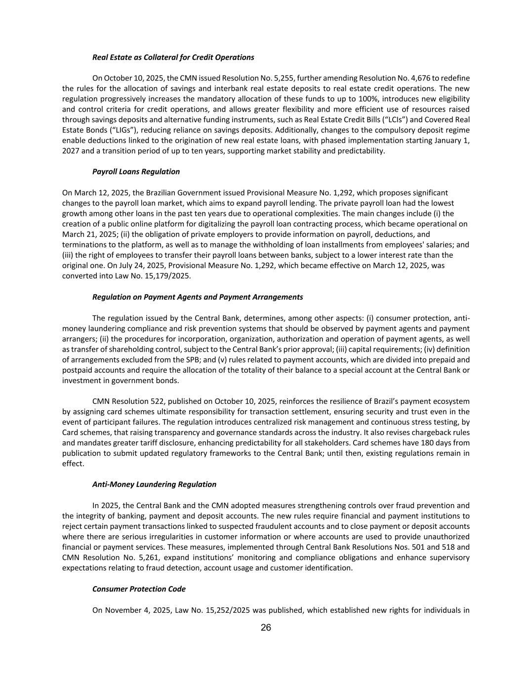 26 Real Estate as Collateral for Credit Operations On October 10, 2025, the CMN issued Resolution No. 5,255, further amending Resolution No. 4,676 to redefine the rules for the allocation of savings and interbank real estate deposits to real estate credit operations. The new regulation progressively increases the mandatory allocation of these funds to up to 100%, introduces new eligibility and control criteria for credit operations, and allows greater flexibility and more efficient use of resources raised through savings deposits and alternative funding instruments, such as Real Estate Credit Bills (“LCIs”) and Covered Real Estate Bonds (“LIGs”), reducing reliance on savings deposits. Additionally, changes to the compulsory deposit regime enable deductions linked to the origination of new real estate loans, with phased implementation starting January 1, 2027 and a transition period of up to ten years, supporting market stability and predictability. Payroll Loans Regulation On March 12, 2025, the Brazilian Government issued Provisional Measure No. 1,292, which proposes significant changes to the payroll loan market, which aims to expand payroll lending. The private payroll loan had the lowest growth among other loans in the past ten years due to operational complexities. The main changes include (i) the creation of a public online platform for digitalizing the payroll loan contracting process, which became operational on March 21, 2025; (ii) the obligation of private employers to provide information on payroll, deductions, and terminations to the platform, as well as to manage the withholding of loan installments from employees' salaries; and (iii) the right of employees to transfer their payroll loans between banks, subject to a lower interest rate than the original one. On July 24, 2025, Provisional Measure No. 1,292, which became effective on March 12, 2025, was converted into Law No. 15,179/2025. Regulation on Payment Agents and Payment Arrangements The regulation issued by the Central Bank, determines, among other aspects: (i) consumer protection, anti- money laundering compliance and risk prevention systems that should be observed by payment agents and payment arrangers; (ii) the procedures for incorporation, organization, authorization and operation of payment agents, as well as transfer of shareholding control, subject to the Central Bank’s prior approval; (iii) capital requirements; (iv) definition of arrangements excluded from the SPB; and (v) rules related to payment accounts, which are divided into prepaid and postpaid accounts and require the allocation of the totality of their balance to a special account at the Central Bank or investment in government bonds. CMN Resolution 522, published on October 10, 2025, reinforces the resilience of Brazil’s payment ecosystem by assigning card schemes ultimate responsibility for transaction settlement, ensuring security and trust even in the event of participant failures. The regulation introduces centralized risk management and continuous stress testing, by Card schemes, that raising transparency and governance standards across the industry. It also revises chargeback rules and mandates greater tariff disclosure, enhancing predictability for all stakeholders. Card schemes have 180 days from publication to submit updated regulatory frameworks to the Central Bank; until then, existing regulations remain in effect. Anti-Money Laundering Regulation In 2025, the Central Bank and the CMN adopted measures strengthening controls over fraud prevention and the integrity of banking, payment and deposit accounts. The new rules require financial and payment institutions to reject certain payment transactions linked to suspected fraudulent accounts and to close payment or deposit accounts where there are serious irregularities in customer information or where accounts are used to provide unauthorized financial or payment services. These measures, implemented through Central Bank Resolutions Nos. 501 and 518 and CMN Resolution No. 5,261, expand institutions’ monitoring and compliance obligations and enhance supervisory expectations relating to fraud detection, account usage and customer identification. Consumer Protection Code On November 4, 2025, Law No. 15,252/2025 was published, which established new rights for individuals in