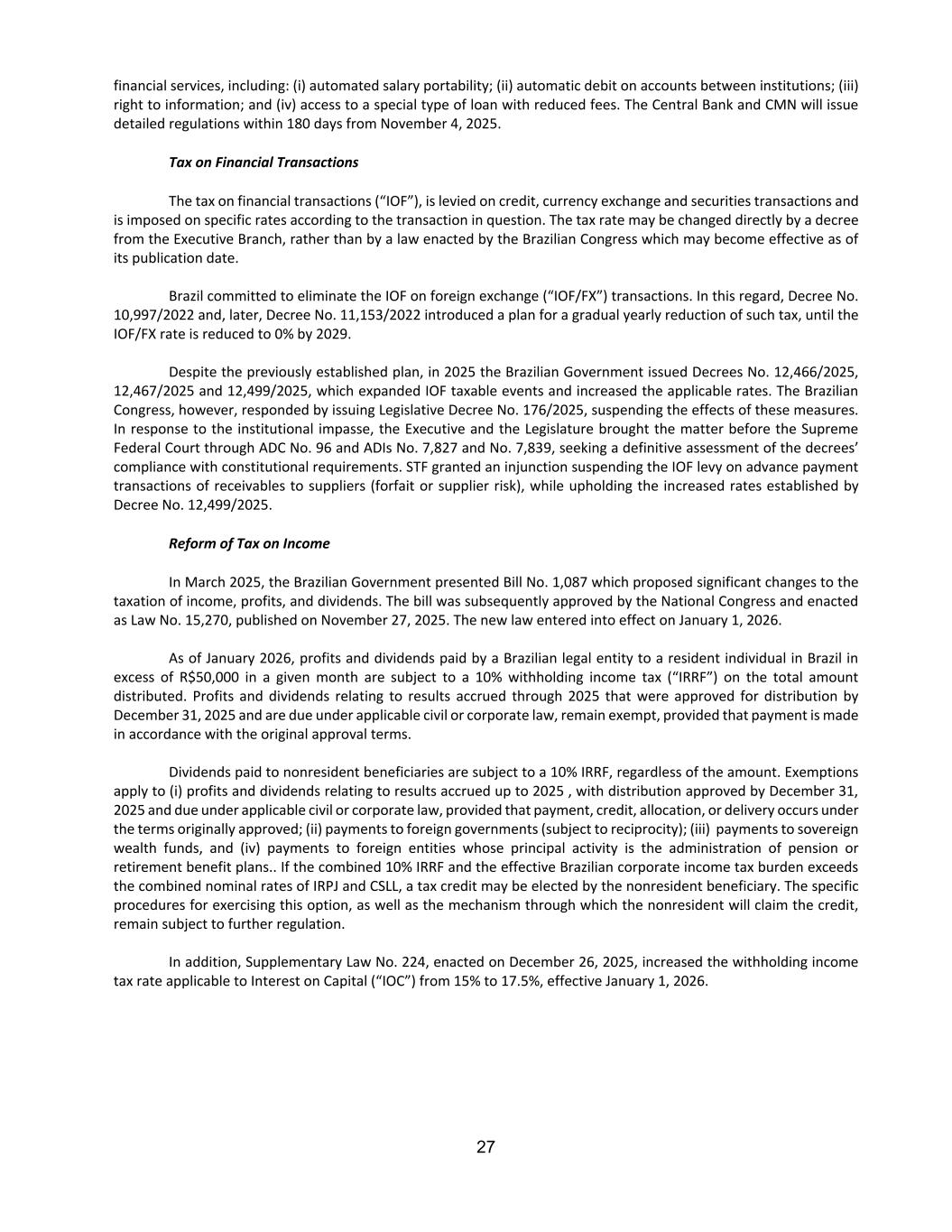 27 financial services, including: (i) automated salary portability; (ii) automatic debit on accounts between institutions; (iii) right to information; and (iv) access to a special type of loan with reduced fees. The Central Bank and CMN will issue detailed regulations within 180 days from November 4, 2025. Tax on Financial Transactions The tax on financial transactions (“IOF”), is levied on credit, currency exchange and securities transactions and is imposed on specific rates according to the transaction in question. The tax rate may be changed directly by a decree from the Executive Branch, rather than by a law enacted by the Brazilian Congress which may become effective as of its publication date. Brazil committed to eliminate the IOF on foreign exchange (“IOF/FX”) transactions. In this regard, Decree No. 10,997/2022 and, later, Decree No. 11,153/2022 introduced a plan for a gradual yearly reduction of such tax, until the IOF/FX rate is reduced to 0% by 2029. Despite the previously established plan, in 2025 the Brazilian Government issued Decrees No. 12,466/2025, 12,467/2025 and 12,499/2025, which expanded IOF taxable events and increased the applicable rates. The Brazilian Congress, however, responded by issuing Legislative Decree No. 176/2025, suspending the effects of these measures. In response to the institutional impasse, the Executive and the Legislature brought the matter before the Supreme Federal Court through ADC No. 96 and ADIs No. 7,827 and No. 7,839, seeking a definitive assessment of the decrees’ compliance with constitutional requirements. STF granted an injunction suspending the IOF levy on advance payment transactions of receivables to suppliers (forfait or supplier risk), while upholding the increased rates established by Decree No. 12,499/2025. Reform of Tax on Income In March 2025, the Brazilian Government presented Bill No. 1,087 which proposed significant changes to the taxation of income, profits, and dividends. The bill was subsequently approved by the National Congress and enacted as Law No. 15,270, published on November 27, 2025. The new law entered into effect on January 1, 2026. As of January 2026, profits and dividends paid by a Brazilian legal entity to a resident individual in Brazil in excess of R$50,000 in a given month are subject to a 10% withholding income tax (“IRRF”) on the total amount distributed. Profits and dividends relating to results accrued through 2025 that were approved for distribution by December 31, 2025 and are due under applicable civil or corporate law, remain exempt, provided that payment is made in accordance with the original approval terms. Dividends paid to nonresident beneficiaries are subject to a 10% IRRF, regardless of the amount. Exemptions apply to (i) profits and dividends relating to results accrued up to 2025 , with distribution approved by December 31, 2025 and due under applicable civil or corporate law, provided that payment, credit, allocation, or delivery occurs under the terms originally approved; (ii) payments to foreign governments (subject to reciprocity); (iii) payments to sovereign wealth funds, and (iv) payments to foreign entities whose principal activity is the administration of pension or retirement benefit plans.. If the combined 10% IRRF and the effective Brazilian corporate income tax burden exceeds the combined nominal rates of IRPJ and CSLL, a tax credit may be elected by the nonresident beneficiary. The specific procedures for exercising this option, as well as the mechanism through which the nonresident will claim the credit, remain subject to further regulation. In addition, Supplementary Law No. 224, enacted on December 26, 2025, increased the withholding income tax rate applicable to Interest on Capital (“IOC”) from 15% to 17.5%, effective January 1, 2026.