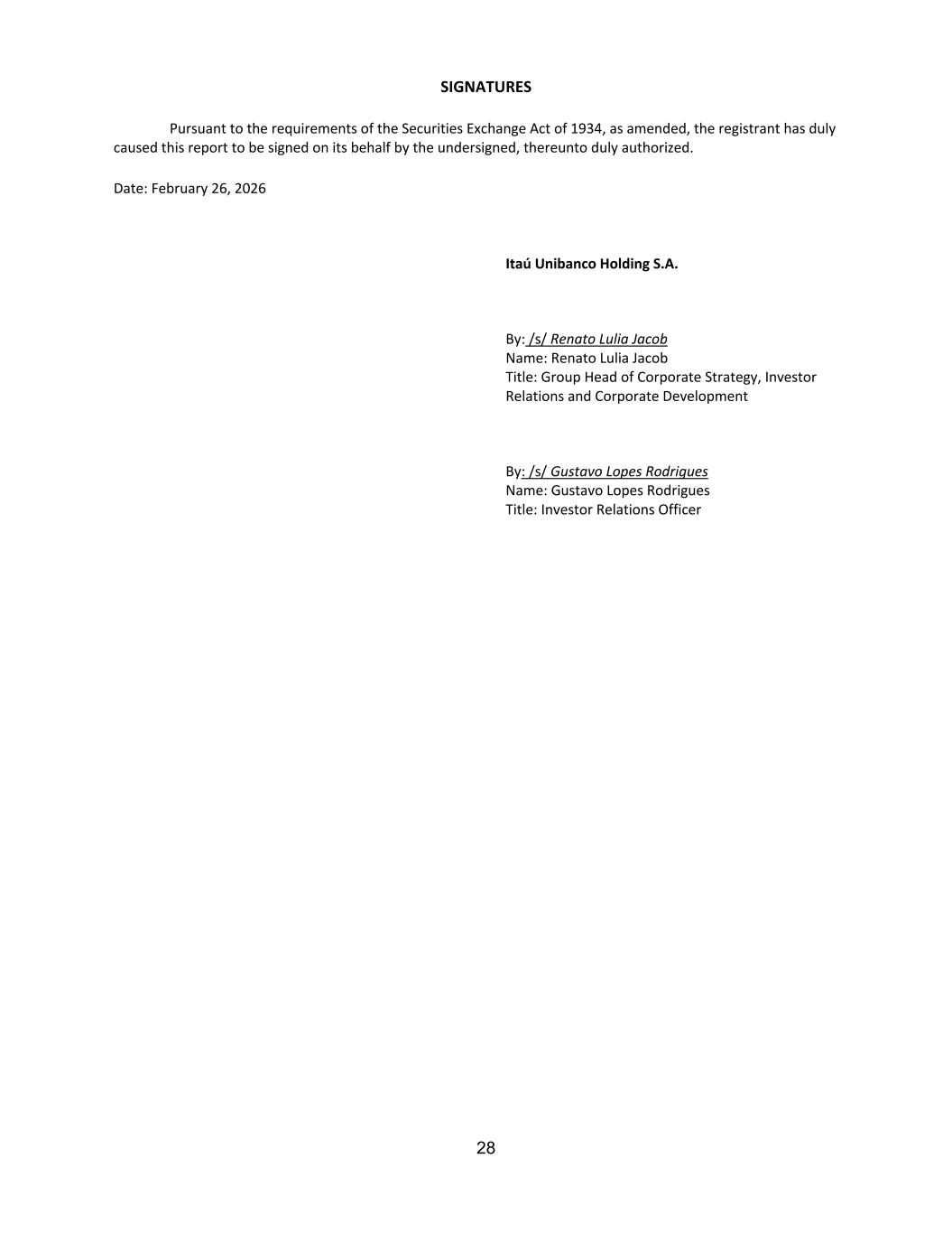 28 SIGNATURES Pursuant to the requirements of the Securities Exchange Act of 1934, as amended, the registrant has duly caused this report to be signed on its behalf by the undersigned, thereunto duly authorized. Date: February 26, 2026 Itaú Unibanco Holding S.A. By: /s/ Renato Lulia Jacob Name: Renato Lulia Jacob Title: Group Head of Corporate Strategy, Investor Relations and Corporate Development By: /s/ Gustavo Lopes Rodrigues Name: Gustavo Lopes Rodrigues Title: Investor Relations Officer