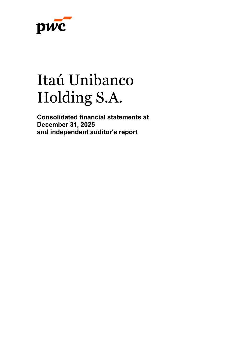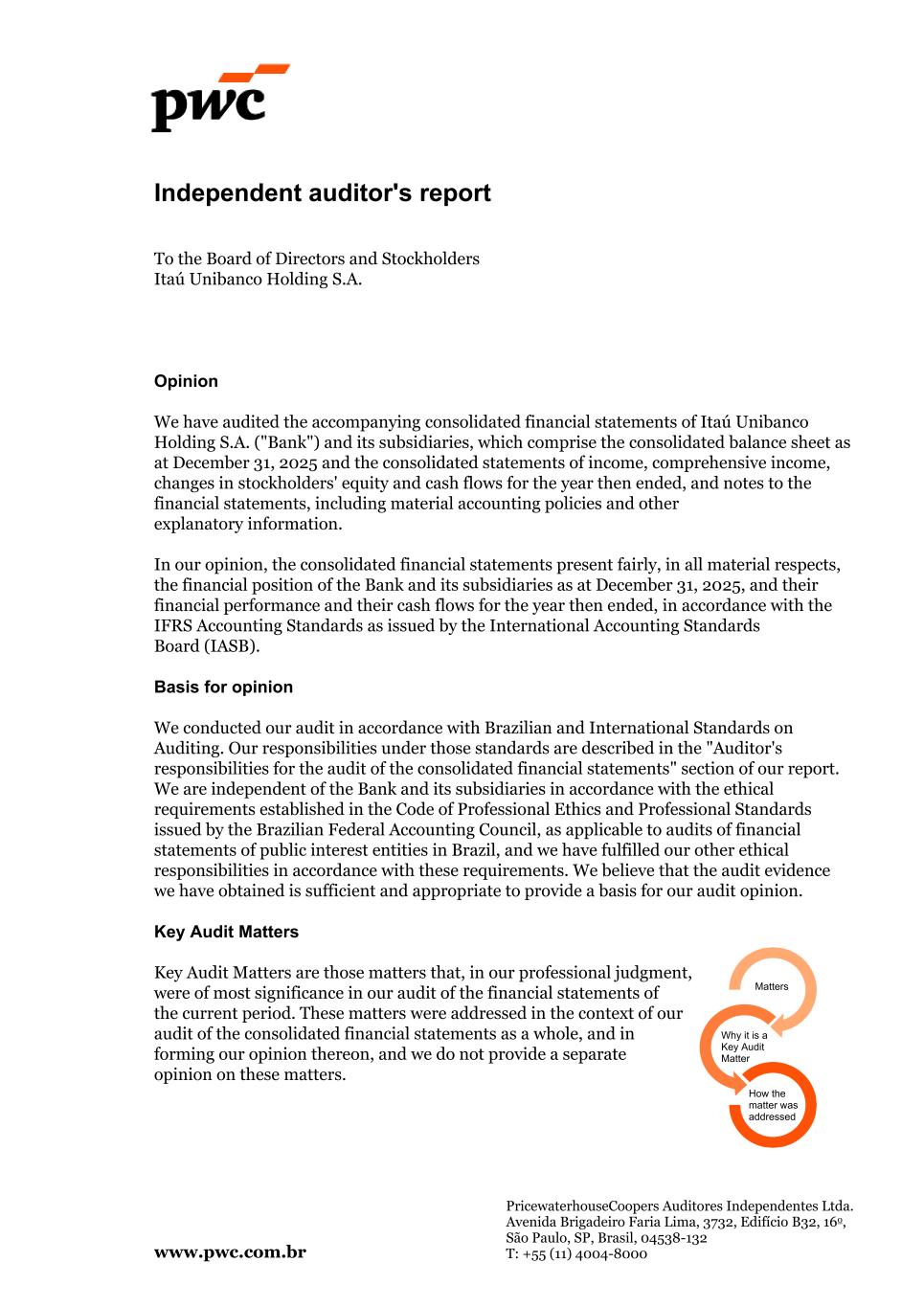 www.pwc.com.br PricewaterhouseCoopers Auditores Independentes Ltda. Avenida Brigadeiro Faria Lima, 3732, Edifício B32, 16o, São Paulo, SP, Brasil, 04538-132 T: +55 (11) 4004-8000 Independent auditor's report To the Board of Directors and Stockholders Itaú Unibanco Holding S.A. Opinion We have audited the accompanying consolidated financial statements of Itaú Unibanco Holding S.A. ("Bank") and its subsidiaries, which comprise the consolidated balance sheet as at December 31, 2025 and the consolidated statements of income, comprehensive income, changes in stockholders' equity and cash flows for the year then ended, and notes to the financial statements, including material accounting policies and other explanatory information. In our opinion, the consolidated financial statements present fairly, in all material respects, the financial position of the Bank and its subsidiaries as at December 31, 2025, and their financial performance and their cash flows for the year then ended, in accordance with the IFRS Accounting Standards as issued by the International Accounting Standards Board (IASB). Basis for opinion We conducted our audit in accordance with Brazilian and International Standards on Auditing. Our responsibilities under those standards are described in the "Auditor's responsibilities for the audit of the consolidated financial statements" section of our report. We are independent of the Bank and its subsidiaries in accordance with the ethical requirements established in the Code of Professional Ethics and Professional Standards issued by the Brazilian Federal Accounting Council, as applicable to audits of financial statements of public interest entities in Brazil, and we have fulfilled our other ethical responsibilities in accordance with these requirements. We believe that the audit evidence we have obtained is sufficient and appropriate to provide a basis for our audit opinion. Key Audit Matters Key Audit Matters are those matters that, in our professional judgment, were of most significance in our audit of the financial statements of the current period. These matters were addressed in the context of our audit of the consolidated financial statements as a whole, and in forming our opinion thereon, and we do not provide a separate opinion on these matters. Matters Why it is a Key Audit Matter How the matter was addressed