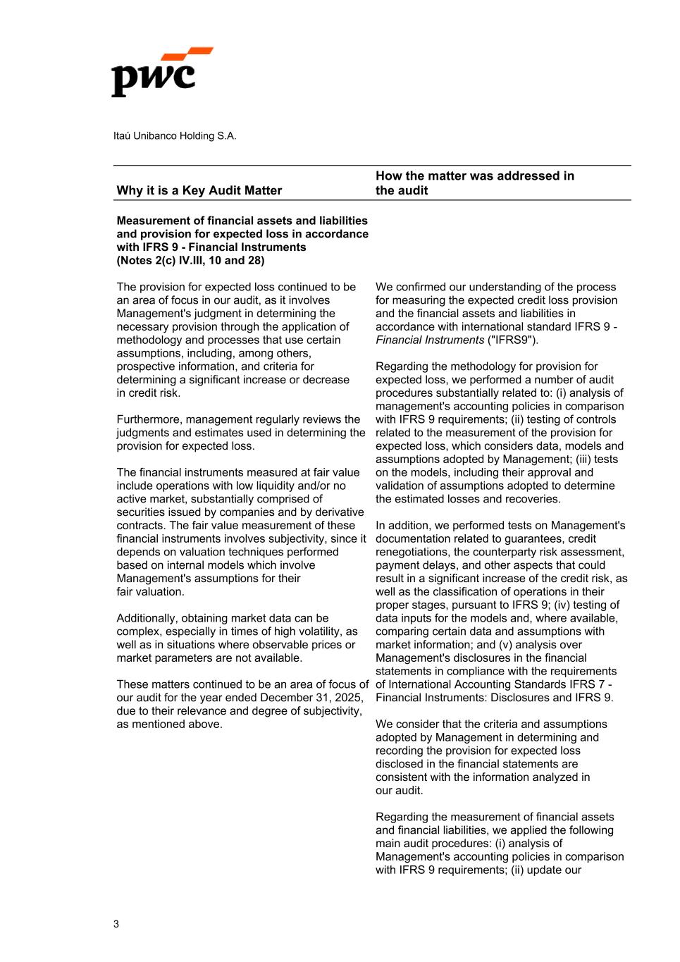 Itaú Unibanco Holding S.A. 3 Why it is a Key Audit Matter How the matter was addressed in the audit Measurement of financial assets and liabilities and provision for expected loss in accordance with IFRS 9 - Financial Instruments (Notes 2(c) IV.III, 10 and 28) The provision for expected loss continued to be an area of focus in our audit, as it involves Management's judgment in determining the necessary provision through the application of methodology and processes that use certain assumptions, including, among others, prospective information, and criteria for determining a significant increase or decrease in credit risk. Furthermore, management regularly reviews the judgments and estimates used in determining the provision for expected loss. The financial instruments measured at fair value include operations with low liquidity and/or no active market, substantially comprised of securities issued by companies and by derivative contracts. The fair value measurement of these financial instruments involves subjectivity, since it depends on valuation techniques performed based on internal models which involve Management's assumptions for their fair valuation. Additionally, obtaining market data can be complex, especially in times of high volatility, as well as in situations where observable prices or market parameters are not available. These matters continued to be an area of focus of our audit for the year ended December 31, 2025, due to their relevance and degree of subjectivity, as mentioned above. We confirmed our understanding of the process for measuring the expected credit loss provision and the financial assets and liabilities in accordance with international standard IFRS 9 - Financial Instruments ("IFRS9"). Regarding the methodology for provision for expected loss, we performed a number of audit procedures substantially related to: (i) analysis of management's accounting policies in comparison with IFRS 9 requirements; (ii) testing of controls related to the measurement of the provision for expected loss, which considers data, models and assumptions adopted by Management; (iii) tests on the models, including their approval and validation of assumptions adopted to determine the estimated losses and recoveries. In addition, we performed tests on Management's documentation related to guarantees, credit renegotiations, the counterparty risk assessment, payment delays, and other aspects that could result in a significant increase of the credit risk, as well as the classification of operations in their proper stages, pursuant to IFRS 9; (iv) testing of data inputs for the models and, where available, comparing certain data and assumptions with market information; and (v) analysis over Management's disclosures in the financial statements in compliance with the requirements of International Accounting Standards IFRS 7 - Financial Instruments: Disclosures and IFRS 9. We consider that the criteria and assumptions adopted by Management in determining and recording the provision for expected loss disclosed in the financial statements are consistent with the information analyzed in our audit. Regarding the measurement of financial assets and financial liabilities, we applied the following main audit procedures: (i) analysis of Management's accounting policies in comparison with IFRS 9 requirements; (ii) update our
