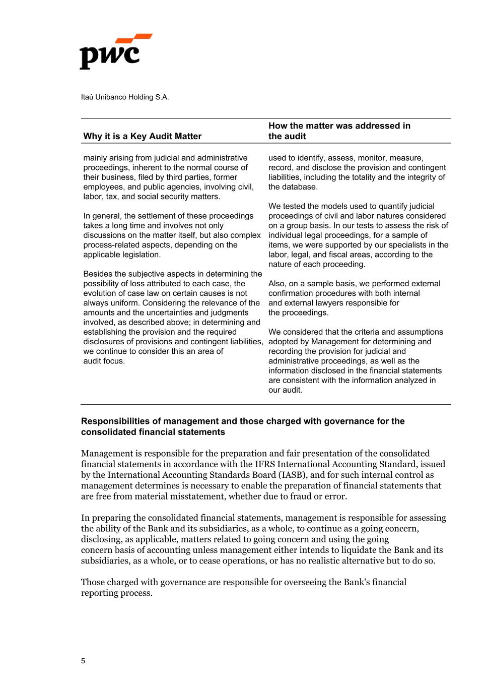Itaú Unibanco Holding S.A. 5 Why it is a Key Audit Matter How the matter was addressed in the audit mainly arising from judicial and administrative proceedings, inherent to the normal course of their business, filed by third parties, former employees, and public agencies, involving civil, labor, tax, and social security matters. In general, the settlement of these proceedings takes a long time and involves not only discussions on the matter itself, but also complex process-related aspects, depending on the applicable legislation. Besides the subjective aspects in determining the possibility of loss attributed to each case, the evolution of case law on certain causes is not always uniform. Considering the relevance of the amounts and the uncertainties and judgments involved, as described above; in determining and establishing the provision and the required disclosures of provisions and contingent liabilities, we continue to consider this an area of audit focus. used to identify, assess, monitor, measure, record, and disclose the provision and contingent liabilities, including the totality and the integrity of the database. We tested the models used to quantify judicial proceedings of civil and labor natures considered on a group basis. In our tests to assess the risk of individual legal proceedings, for a sample of items, we were supported by our specialists in the labor, legal, and fiscal areas, according to the nature of each proceeding. Also, on a sample basis, we performed external confirmation procedures with both internal and external lawyers responsible for the proceedings. We considered that the criteria and assumptions adopted by Management for determining and recording the provision for judicial and administrative proceedings, as well as the information disclosed in the financial statements are consistent with the information analyzed in our audit. Responsibilities of management and those charged with governance for the consolidated financial statements Management is responsible for the preparation and fair presentation of the consolidated financial statements in accordance with the IFRS International Accounting Standard, issued by the International Accounting Standards Board (IASB), and for such internal control as management determines is necessary to enable the preparation of financial statements that are free from material misstatement, whether due to fraud or error. In preparing the consolidated financial statements, management is responsible for assessing the ability of the Bank and its subsidiaries, as a whole, to continue as a going concern, disclosing, as applicable, matters related to going concern and using the going concern basis of accounting unless management either intends to liquidate the Bank and its subsidiaries, as a whole, or to cease operations, or has no realistic alternative but to do so. Those charged with governance are responsible for overseeing the Bank's financial reporting process.