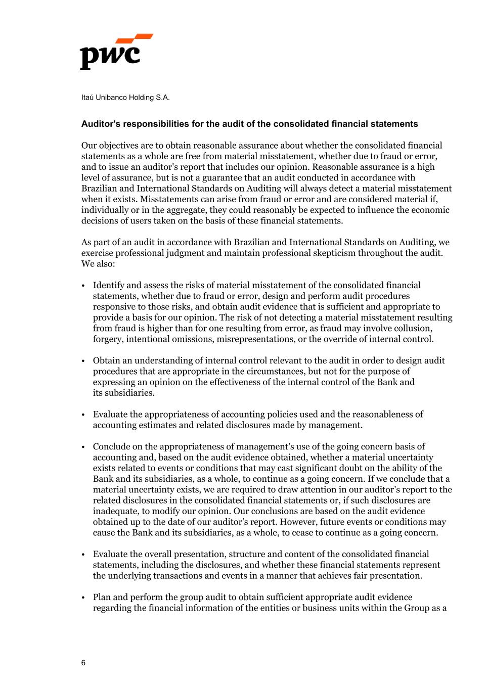 Itaú Unibanco Holding S.A. 6 Auditor's responsibilities for the audit of the consolidated financial statements Our objectives are to obtain reasonable assurance about whether the consolidated financial statements as a whole are free from material misstatement, whether due to fraud or error, and to issue an auditor's report that includes our opinion. Reasonable assurance is a high level of assurance, but is not a guarantee that an audit conducted in accordance with Brazilian and International Standards on Auditing will always detect a material misstatement when it exists. Misstatements can arise from fraud or error and are considered material if, individually or in the aggregate, they could reasonably be expected to influence the economic decisions of users taken on the basis of these financial statements. As part of an audit in accordance with Brazilian and International Standards on Auditing, we exercise professional judgment and maintain professional skepticism throughout the audit. We also: • Identify and assess the risks of material misstatement of the consolidated financial statements, whether due to fraud or error, design and perform audit procedures responsive to those risks, and obtain audit evidence that is sufficient and appropriate to provide a basis for our opinion. The risk of not detecting a material misstatement resulting from fraud is higher than for one resulting from error, as fraud may involve collusion, forgery, intentional omissions, misrepresentations, or the override of internal control. • Obtain an understanding of internal control relevant to the audit in order to design audit procedures that are appropriate in the circumstances, but not for the purpose of expressing an opinion on the effectiveness of the internal control of the Bank and its subsidiaries. • Evaluate the appropriateness of accounting policies used and the reasonableness of accounting estimates and related disclosures made by management. • Conclude on the appropriateness of management's use of the going concern basis of accounting and, based on the audit evidence obtained, whether a material uncertainty exists related to events or conditions that may cast significant doubt on the ability of the Bank and its subsidiaries, as a whole, to continue as a going concern. If we conclude that a material uncertainty exists, we are required to draw attention in our auditor's report to the related disclosures in the consolidated financial statements or, if such disclosures are inadequate, to modify our opinion. Our conclusions are based on the audit evidence obtained up to the date of our auditor's report. However, future events or conditions may cause the Bank and its subsidiaries, as a whole, to cease to continue as a going concern. • Evaluate the overall presentation, structure and content of the consolidated financial statements, including the disclosures, and whether these financial statements represent the underlying transactions and events in a manner that achieves fair presentation. • Plan and perform the group audit to obtain sufficient appropriate audit evidence regarding the financial information of the entities or business units within the Group as a
