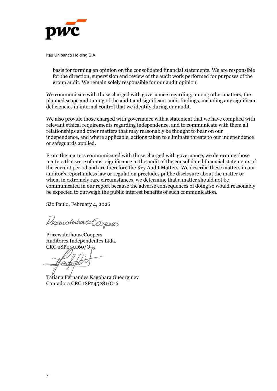 Itaú Unibanco Holding S.A. 7 basis for forming an opinion on the consolidated financial statements. We are responsible for the direction, supervision and review of the audit work performed for purposes of the group audit. We remain solely responsible for our audit opinion. We communicate with those charged with governance regarding, among other matters, the planned scope and timing of the audit and significant audit findings, including any significant deficiencies in internal control that we identify during our audit. We also provide those charged with governance with a statement that we have complied with relevant ethical requirements regarding independence, and to communicate with them all relationships and other matters that may reasonably be thought to bear on our independence, and where applicable, actions taken to eliminate threats to our independence or safeguards applied. From the matters communicated with those charged with governance, we determine those matters that were of most significance in the audit of the consolidated financial statements of the current period and are therefore the Key Audit Matters. We describe these matters in our auditor's report unless law or regulation precludes public disclosure about the matter or when, in extremely rare circumstances, we determine that a matter should not be communicated in our report because the adverse consequences of doing so would reasonably be expected to outweigh the public interest benefits of such communication. São Paulo, February 4, 2026 PricewaterhouseCoopers Auditores Independentes Ltda. CRC 2SP000160/O-5 Tatiana Fernandes Kagohara Gueorguiev Contadora CRC 1SP245281/O-6