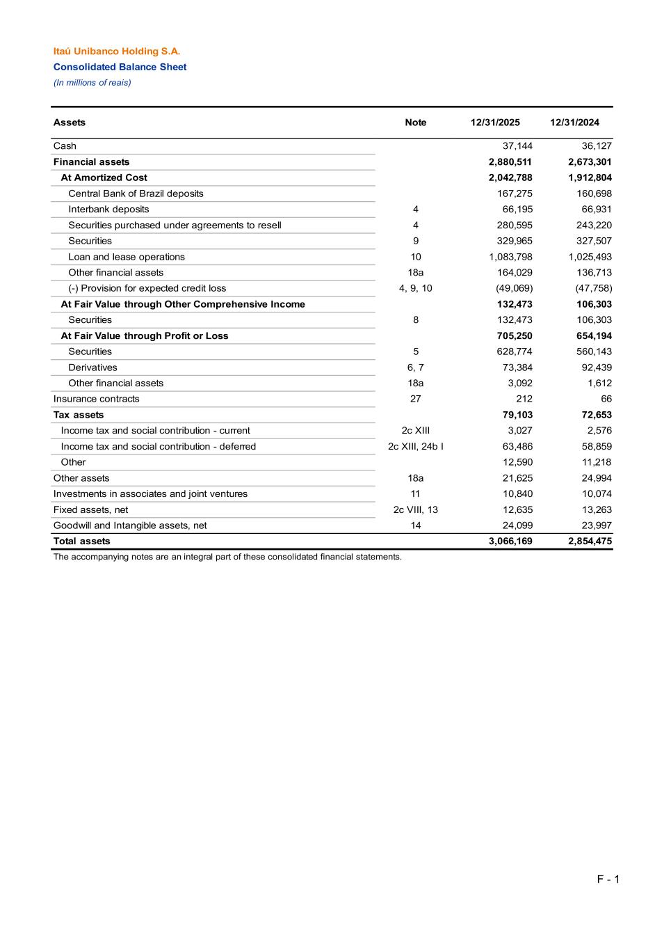F - 1 Itaú Unibanco Holding S.A. Consolidated Balance Sheet (In millions of reais) Assets Note 12/31/2025 12/31/2024 Cash 37,144 36,127 Financial assets 2,880,511 2,673,301 At Amortized Cost 2,042,788 1,912,804 Central Bank of Brazil deposits 167,275 160,698 Interbank deposits 4 66,195 66,931 Securities purchased under agreements to resell 4 280,595 243,220 Securities 9 329,965 327,507 Loan and lease operations 10 1,083,798 1,025,493 Other financial assets 18a 164,029 136,713 (-) Provision for expected credit loss 4, 9, 10 (49,069) (47,758) At Fair Value through Other Comprehensive Income 132,473 106,303 Securities 8 132,473 106,303 At Fair Value through Profit or Loss 705,250 654,194 Securities 5 628,774 560,143 Derivatives 6, 7 73,384 92,439 Other financial assets 18a 3,092 1,612 Insurance contracts 27 212 66 Tax assets 79,103 72,653 Income tax and social contribution - current 2c XIII 3,027 2,576 Income tax and social contribution - deferred 2c XIII, 24b I 63,486 58,859 Other 12,590 11,218 Other assets 18a 21,625 24,994 Investments in associates and joint ventures 11 10,840 10,074 Fixed assets, net 2c VIII, 13 12,635 13,263 Goodwill and Intangible assets, net 14 24,099 23,997 Total assets 3,066,169 2,854,475 The accompanying notes are an integral part of these consolidated financial statements.