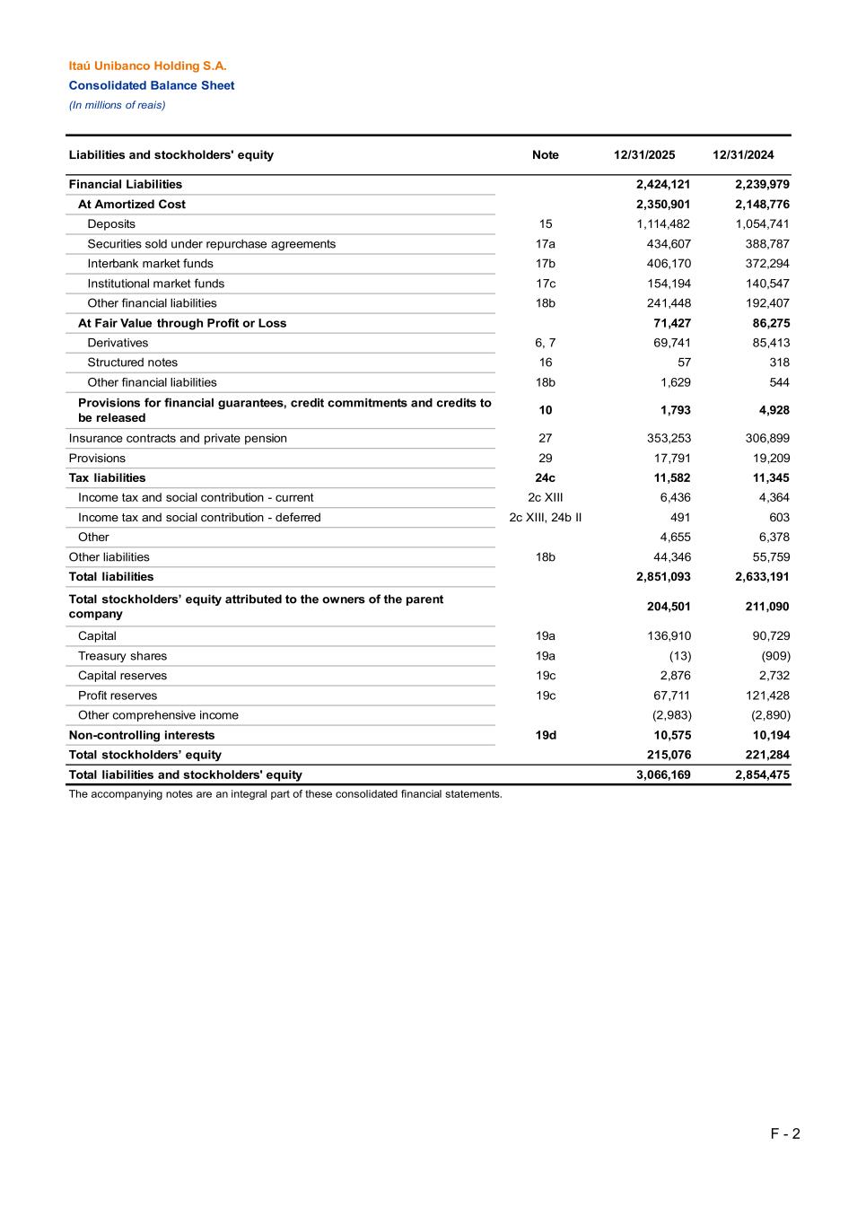 F - 2 Itaú Unibanco Holding S.A. Consolidated Balance Sheet (In millions of reais) Liabilities and stockholders' equity Note 12/31/2025 12/31/2024 Financial Liabilities 2,424,121 2,239,979 At Amortized Cost 2,350,901 2,148,776 Deposits 15 1,114,482 1,054,741 Securities sold under repurchase agreements 17a 434,607 388,787 Interbank market funds 17b 406,170 372,294 Institutional market funds 17c 154,194 140,547 Other financial liabilities 18b 241,448 192,407 At Fair Value through Profit or Loss 71,427 86,275 Derivatives 6, 7 69,741 85,413 Structured notes 16 57 318 Other financial liabilities 18b 1,629 544 Provisions for financial guarantees, credit commitments and credits to be released 10 1,793 4,928 Insurance contracts and private pension 27 353,253 306,899 Provisions 29 17,791 19,209 Tax liabilities 24c 11,582 11,345 Income tax and social contribution - current 2c XIII 6,436 4,364 Income tax and social contribution - deferred 2c XIII, 24b II 491 603 Other 4,655 6,378 Other liabilities 18b 44,346 55,759 Total liabilities 2,851,093 2,633,191 Total stockholders’ equity attributed to the owners of the parent company 204,501 211,090 Capital 19a 136,910 90,729 Treasury shares 19a (13) (909) Capital reserves 19c 2,876 2,732 Profit reserves 19c 67,711 121,428 Other comprehensive income (2,983) (2,890) Non-controlling interests 19d 10,575 10,194 Total stockholders’ equity 215,076 221,284 Total liabilities and stockholders' equity 3,066,169 2,854,475 The accompanying notes are an integral part of these consolidated financial statements.
