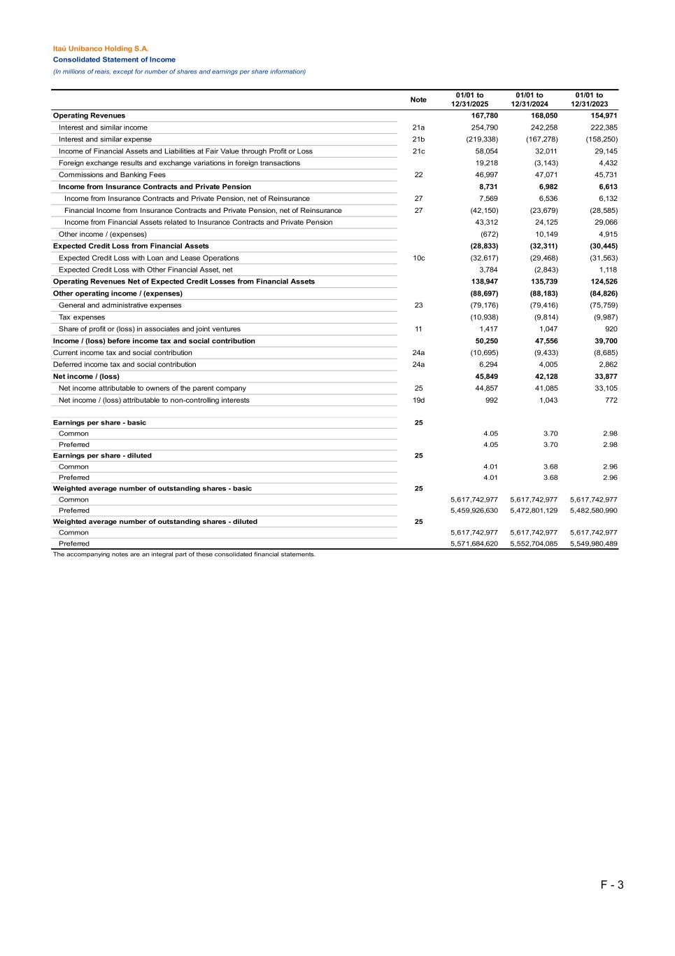 F - 3 Itaú Unibanco Holding S.A. Consolidated Statement of Income (In millions of reais, except for number of shares and earnings per share information) Note 01/01 to 12/31/2025 01/01 to 12/31/2024 01/01 to 12/31/2023 Operating Revenues 167,780 168,050 154,971 Interest and similar income 21a 254,790 242,258 222,385 Interest and similar expense 21b (219,338) (167,278) (158,250) Income of Financial Assets and Liabilities at Fair Value through Profit or Loss 21c 58,054 32,011 29,145 Foreign exchange results and exchange variations in foreign transactions 19,218 (3,143) 4,432 Commissions and Banking Fees 22 46,997 47,071 45,731 Income from Insurance Contracts and Private Pension 8,731 6,982 6,613 Income from Insurance Contracts and Private Pension, net of Reinsurance 27 7,569 6,536 6,132 Financial Income from Insurance Contracts and Private Pension, net of Reinsurance 27 (42,150) (23,679) (28,585) Income from Financial Assets related to Insurance Contracts and Private Pension 43,312 24,125 29,066 Other income / (expenses) (672) 10,149 4,915 Expected Credit Loss from Financial Assets (28,833) (32,311) (30,445) Expected Credit Loss with Loan and Lease Operations 10c (32,617) (29,468) (31,563) Expected Credit Loss with Other Financial Asset, net 3,784 (2,843) 1,118 Operating Revenues Net of Expected Credit Losses from Financial Assets 138,947 135,739 124,526 Other operating income / (expenses) (88,697) (88,183) (84,826) General and administrative expenses 23 (79,176) (79,416) (75,759) Tax expenses (10,938) (9,814) (9,987) Share of profit or (loss) in associates and joint ventures 11 1,417 1,047 920 Income / (loss) before income tax and social contribution 50,250 47,556 39,700 Current income tax and social contribution 24a (10,695) (9,433) (8,685) Deferred income tax and social contribution 24a 6,294 4,005 2,862 Net income / (loss) 45,849 42,128 33,877 Net income attributable to owners of the parent company 25 44,857 41,085 33,105 Net income / (loss) attributable to non-controlling interests 19d 992 1,043 772 Earnings per share - basic 25 Common 4.05 3.70 2.98 Preferred 4.05 3.70 2.98 Earnings per share - diluted 25 Common 4.01 3.68 2.96 Preferred 4.01 3.68 2.96 Weighted average number of outstanding shares - basic 25 Common 5,617,742,977 5,617,742,977 5,617,742,977 Preferred 5,459,926,630 5,472,801,129 5,482,580,990 Weighted average number of outstanding shares - diluted 25 Common 5,617,742,977 5,617,742,977 5,617,742,977 Preferred 5,571,684,620 5,552,704,085 5,549,980,489 The accompanying notes are an integral part of these consolidated financial statements.