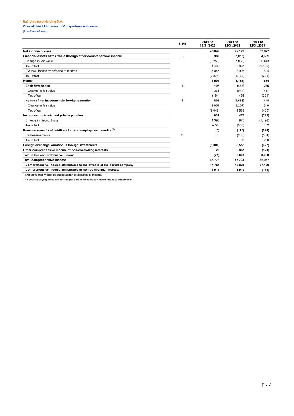 F - 4 Itaú Unibanco Holding S.A. Consolidated Statement of Comprehensive Income (In millions of reais) Note 01/01 to 12/31/2025 01/01 to 12/31/2024 01/01 to 12/31/2023 Net income / (loss) 45,849 42,128 33,877 Financial assets at fair value through other comprehensive income 8 980 (2,015) 4,681 Change in fair value (3,259) (7,030) 5,443 Tax effect 1,463 2,867 (1,105) (Gains) / losses transferred to income 5,047 3,905 624 Tax effect (2,271) (1,757) (281) Hedge 1,002 (2,156) 684 Cash flow hedge 7 197 (488) 236 Change in fair value 361 (941) 457 Tax effect (164) 453 (221) Hedge of net investment in foreign operation 7 805 (1,668) 448 Change in fair value 2,854 (3,207) 848 Tax effect (2,049) 1,539 (400) Insurance contracts and private pension 938 470 (710) Change in discount rate 1,390 976 (1,192) Tax effect (452) (506) 482 Remeasurements of liabilities for post-employment benefits (1) (5) (115) (324) Remeasurements 26 (8) (205) (584) Tax effect 3 90 260 Foreign exchange variation in foreign investments (3,008) 8,552 (327) Other comprehensive income of non-controlling interests 22 867 (924) Total other comprehensive income (71) 5,603 3,080 Total comprehensive income 45,778 47,731 36,957 Comprehensive income attributable to the owners of the parent company 44,764 45,821 37,109 Comprehensive income attributable to non-controlling interests 1,014 1,910 (152) 1) Amounts that will not be subsequently reclassified to income. The accompanying notes are an integral part of these consolidated financial statements.