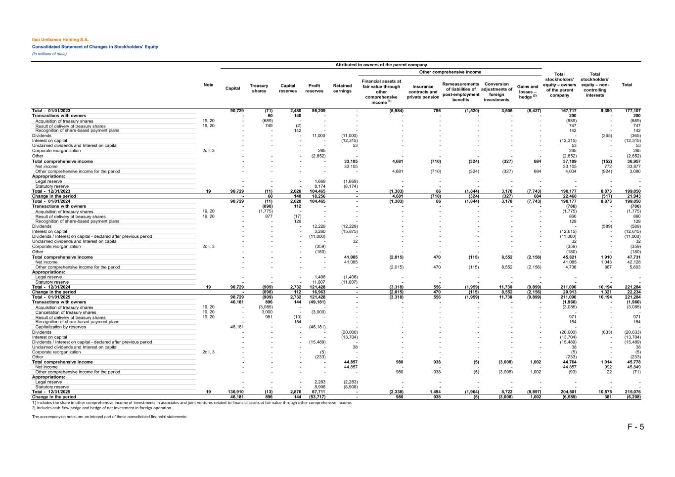 F - 5 Itaú Unibanco Holding S.A. Consolidated Statement of Changes in Stockholders’ Equity (In millions of reais) Note Attributed to owners of the parent company Total stockholders’ equity – owners of the parent company Total stockholders’ equity – non- controlling interests Total Capital Treasury shares Capital reserves Profit reserves Retained earnings Other comprehensive income Financial assets at fair value through other comprehensive income (1) Insurance contracts and private pension Remeasurements of liabilities of post-employment benefits Conversion adjustments of foreign investments Gains and losses – hedge (2) Total - 01/01/2023 90,729 (71) 2,480 86,209 - (5,984) 796 (1,520) 3,505 (8,427) 167,717 9,390 177,107 Transactions with owners - 60 140 - - - - - - - 200 - 200 Acquisition of treasury shares 19, 20 - (689) - - - - - - - - (689) - (689) Result of delivery of treasury shares 19, 20 - 749 (2) - - - - - - - 747 - 747 Recognition of share-based payment plans - - 142 - - - - - - - 142 - 142 Dividends - - - 11,000 (11,000) - - - - - - (365) (365) Interest on capital - - - - (12,315) - - - - - (12,315) - (12,315) Unclaimed dividends and Interest on capital - - - - 53 - - - - - 53 - 53 Corporate reorganization 2c I, 3 - - - 265 - - - - - - 265 - 265 Other - - - (2,852) - - - - - - (2,852) - (2,852) Total comprehensive income - - - - 33,105 4,681 (710) (324) (327) 684 37,109 (152) 36,957 Net income - - - - 33,105 - - - - - 33,105 772 33,877 Other comprehensive income for the period - - - - - 4,681 (710) (324) (327) 684 4,004 (924) 3,080 Appropriations: Legal reserve - - - 1,669 (1,669) - - - - - - - - Statutory reserve - - - 8,174 (8,174) - - - - - - - - Total - 12/31/2023 19 90,729 (11) 2,620 104,465 - (1,303) 86 (1,844) 3,178 (7,743) 190,177 8,873 199,050 Change in the period - 60 140 18,256 - 4,681 (710) (324) (327) 684 22,460 (517) 21,943 Total - 01/01/2024 90,729 (11) 2,620 104,465 - (1,303) 86 (1,844) 3,178 (7,743) 190,177 8,873 199,050 Transactions with owners - (898) 112 - - - - - - - (786) - (786) Acquisition of treasury shares 19, 20 - (1,775) - - - - - - - - (1,775) - (1,775) Result of delivery of treasury shares 19, 20 - 877 (17) - - - - - - - 860 - 860 Recognition of share-based payment plans - - 129 - - - - - - - 129 - 129 Dividends - - - 12,229 (12,229) - - - - - - (589) (589) Interest on capital - - - 3,260 (15,875) - - - - - (12,615) - (12,615) Dividends / Interest on capital - declared after previous period - - - (11,000) - - - - - - (11,000) - (11,000) Unclaimed dividends and Interest on capital - - - - 32 - - - - - 32 - 32 Corporate reorganization 2c I, 3 - - - (359) - - - - - - (359) - (359) Other - - - (180) - - - - - - (180) - (180) Total comprehensive income - - - - 41,085 (2,015) 470 (115) 8,552 (2,156) 45,821 1,910 47,731 Net income - - - - 41,085 - - - - - 41,085 1,043 42,128 Other comprehensive income for the period - - - - - (2,015) 470 (115) 8,552 (2,156) 4,736 867 5,603 Appropriations: Legal reserve - - - 1,406 (1,406) - - - - - - - - Statutory reserve - - - 11,607 (11,607) - - - - - - - - Total - 12/31/2024 19 90,729 (909) 2,732 121,428 - (3,318) 556 (1,959) 11,730 (9,899) 211,090 10,194 221,284 Change in the period - (898) 112 16,963 - (2,015) 470 (115) 8,552 (2,156) 20,913 1,321 22,234 Total - 01/01/2025 90,729 (909) 2,732 121,428 - (3,318) 556 (1,959) 11,730 (9,899) 211,090 10,194 221,284 Transactions with owners 46,181 896 144 (49,181) - - - - - - (1,960) - (1,960) Acquisition of treasury shares 19, 20 - (3,085) - - - - - - - - (3,085) - (3,085) Cancellation of treasury shares 19, 20 - 3,000 - (3,000) - - - - - - - - - Result of delivery of treasury shares 19, 20 - 981 (10) - - - - - - - 971 - 971 Recognition of share-based payment plans - - 154 - - - - - - - 154 - 154 Capitalization by reserves 46,181 - - (46,181) - - - - - - - - - Dividends - - - - (20,000) - - - - - (20,000) (633) (20,633) Interest on capital - - - - (13,704) - - - - - (13,704) - (13,704) Dividends / Interest on capital - declared after previous period - - - (15,489) - - - - - - (15,489) - (15,489) Unclaimed dividends and Interest on capital - - - - 38 - - - - - 38 - 38 Corporate reorganization 2c I, 3 - - - (5) - - - - - - (5) - (5) Other - - - (233) - - - - - - (233) - (233) Total comprehensive income - - - - 44,857 980 938 (5) (3,008) 1,002 44,764 1,014 45,778 Net income - - - - 44,857 - - - - - 44,857 992 45,849 Other comprehensive income for the period - - - - - 980 938 (5) (3,008) 1,002 (93) 22 (71) Appropriations: Legal reserve - - - 2,283 (2,283) - - - - - - - - Statutory reserve - - - 8,908 (8,908) - - - - - - - - Total - 12/31/2025 19 136,910 (13) 2,876 67,711 - (2,338) 1,494 (1,964) 8,722 (8,897) 204,501 10,575 215,076 Change in the period 46,181 896 144 (53,717) - 980 938 (5) (3,008) 1,002 (6,589) 381 (6,208) 1) Includes the share in other comprehensive income of investments in associates and joint ventures related to financial assets at fair value through other comprehensive income. 2) Includes cash flow hedge and hedge of net investment in foreign operation. The accompanying notes are an integral part of these consolidated financial statements.