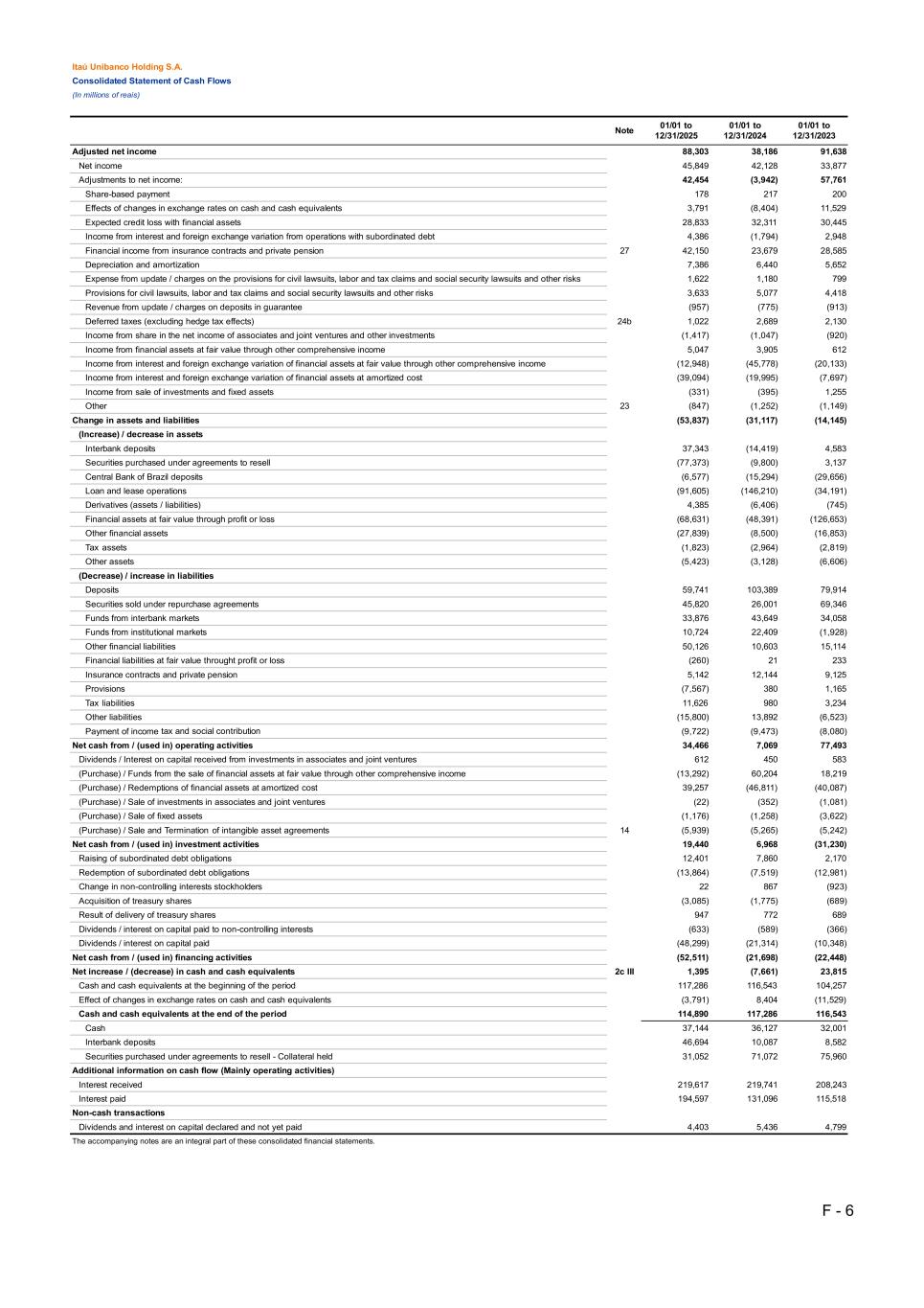 F - 6 Itaú Unibanco Holding S.A. Consolidated Statement of Cash Flows (In millions of reais) Note 01/01 to 12/31/2025 01/01 to 12/31/2024 01/01 to 12/31/2023 Adjusted net income 88,303 38,186 91,638 Net income 45,849 42,128 33,877 Adjustments to net income: 42,454 (3,942) 57,761 Share-based payment 178 217 200 Effects of changes in exchange rates on cash and cash equivalents 3,791 (8,404) 11,529 Expected credit loss with financial assets 28,833 32,311 30,445 Income from interest and foreign exchange variation from operations with subordinated debt 4,386 (1,794) 2,948 Financial income from insurance contracts and private pension 27 42,150 23,679 28,585 Depreciation and amortization 7,386 6,440 5,652 Expense from update / charges on the provisions for civil lawsuits, labor and tax claims and social security lawsuits and other risks 1,622 1,180 799 Provisions for civil lawsuits, labor and tax claims and social security lawsuits and other risks 3,633 5,077 4,418 Revenue from update / charges on deposits in guarantee (957) (775) (913) Deferred taxes (excluding hedge tax effects) 24b 1,022 2,689 2,130 Income from share in the net income of associates and joint ventures and other investments (1,417) (1,047) (920) Income from financial assets at fair value through other comprehensive income 5,047 3,905 612 Income from interest and foreign exchange variation of financial assets at fair value through other comprehensive income (12,948) (45,778) (20,133) Income from interest and foreign exchange variation of financial assets at amortized cost (39,094) (19,995) (7,697) Income from sale of investments and fixed assets (331) (395) 1,255 Other 23 (847) (1,252) (1,149) Change in assets and liabilities (53,837) (31,117) (14,145) (Increase) / decrease in assets Interbank deposits 37,343 (14,419) 4,583 Securities purchased under agreements to resell (77,373) (9,800) 3,137 Central Bank of Brazil deposits (6,577) (15,294) (29,656) Loan and lease operations (91,605) (146,210) (34,191) Derivatives (assets / liabilities) 4,385 (6,406) (745) Financial assets at fair value through profit or loss (68,631) (48,391) (126,653) Other financial assets (27,839) (8,500) (16,853) Tax assets (1,823) (2,964) (2,819) Other assets (5,423) (3,128) (6,606) (Decrease) / increase in liabilities Deposits 59,741 103,389 79,914 Securities sold under repurchase agreements 45,820 26,001 69,346 Funds from interbank markets 33,876 43,649 34,058 Funds from institutional markets 10,724 22,409 (1,928) Other financial liabilities 50,126 10,603 15,114 Financial liabilities at fair value throught profit or loss (260) 21 233 Insurance contracts and private pension 5,142 12,144 9,125 Provisions (7,567) 380 1,165 Tax liabilities 11,626 980 3,234 Other liabilities (15,800) 13,892 (6,523) Payment of income tax and social contribution (9,722) (9,473) (8,080) Net cash from / (used in) operating activities 34,466 7,069 77,493 Dividends / Interest on capital received from investments in associates and joint ventures 612 450 583 (Purchase) / Funds from the sale of financial assets at fair value through other comprehensive income (13,292) 60,204 18,219 (Purchase) / Redemptions of financial assets at amortized cost 39,257 (46,811) (40,087) (Purchase) / Sale of investments in associates and joint ventures (22) (352) (1,081) (Purchase) / Sale of fixed assets (1,176) (1,258) (3,622) (Purchase) / Sale and Termination of intangible asset agreements 14 (5,939) (5,265) (5,242) Net cash from / (used in) investment activities 19,440 6,968 (31,230) Raising of subordinated debt obligations 12,401 7,860 2,170 Redemption of subordinated debt obligations (13,864) (7,519) (12,981) Change in non-controlling interests stockholders 22 867 (923) Acquisition of treasury shares (3,085) (1,775) (689) Result of delivery of treasury shares 947 772 689 Dividends / interest on capital paid to non-controlling interests (633) (589) (366) Dividends / interest on capital paid (48,299) (21,314) (10,348) Net cash from / (used in) financing activities (52,511) (21,698) (22,448) Net increase / (decrease) in cash and cash equivalents 2c III 1,395 (7,661) 23,815 Cash and cash equivalents at the beginning of the period 117,286 116,543 104,257 Effect of changes in exchange rates on cash and cash equivalents (3,791) 8,404 (11,529) Cash and cash equivalents at the end of the period 114,890 117,286 116,543 Cash 37,144 36,127 32,001 Interbank deposits 46,694 10,087 8,582 Securities purchased under agreements to resell - Collateral held 31,052 71,072 75,960 Additional information on cash flow (Mainly operating activities) Interest received 219,617 219,741 208,243 Interest paid 194,597 131,096 115,518 Non-cash transactions Dividends and interest on capital declared and not yet paid 4,403 5,436 4,799 The accompanying notes are an integral part of these consolidated financial statements.