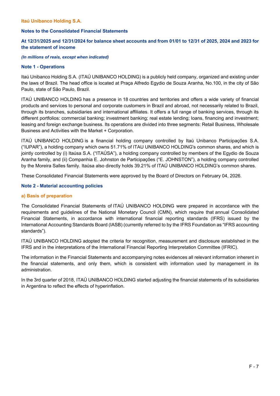 F - 7 Itaú Unibanco Holding S.A. Notes to the Consolidated Financial Statements At 12/31/2025 and 12/31/2024 for balance sheet accounts and from 01/01 to 12/31 of 2025, 2024 and 2023 for the statement of income (In millions of reais, except when indicated) Note 1 - Operations Itaú Unibanco Holding S.A. (ITAÚ UNIBANCO HOLDING) is a publicly held company, organized and existing under the laws of Brazil. The head office is located at Praça Alfredo Egydio de Souza Aranha, No.100, in the city of São Paulo, state of São Paulo, Brazil. ITAÚ UNIBANCO HOLDING has a presence in 18 countries and territories and offers a wide variety of financial products and services to personal and corporate customers in Brazil and abroad, not necessarily related to Brazil, through its branches, subsidiaries and international affiliates. It offers a full range of banking services, through its different portfolios: commercial banking; investment banking; real estate lending; loans, financing and investment; leasing and foreign exchange business. Its operations are divided into three segments: Retail Business, Wholesale Business and Activities with the Market + Corporation. ITAÚ UNIBANCO HOLDING is a financial holding company controlled by Itaú Unibanco Participações S.A. (“IUPAR”), a holding company which owns 51.71% of ITAU UNIBANCO HOLDING's common shares, and which is jointly controlled by (i) Itaúsa S.A. (“ITAÚSA”), a holding company controlled by members of the Egydio de Souza Aranha family, and (ii) Companhia E. Johnston de Participações (“E. JOHNSTON”), a holding company controlled by the Moreira Salles family. Itaúsa also directly holds 39.21% of ITAÚ UNIBANCO HOLDING’s common shares. These Consolidated Financial Statements were approved by the Board of Directors on February 04, 2026. Note 2 - Material accounting policies a) Basis of preparation The Consolidated Financial Statements of ITAÚ UNIBANCO HOLDING were prepared in accordance with the requirements and guidelines of the National Monetary Council (CMN), which require that annual Consolidated Financial Statements, in accordance with international financial reporting standards (IFRS) issued by the International Accounting Standards Board (IASB) (currently referred to by the IFRS Foundation as “IFRS accounting standards”). ITAÚ UNIBANCO HOLDING adopted the criteria for recognition, measurement and disclosure established in the IFRS and in the interpretations of the International Financial Reporting Interpretation Committee (IFRIC). The information in the Financial Statements and accompanying notes evidences all relevant information inherent in the financial statements, and only them, which is consistent with information used by management in its administration. In the 3rd quarter of 2018, ITAÚ UNIBANCO HOLDING started adjusting the financial statements of its subsidiaries in Argentina to reflect the effects of hyperinflation.