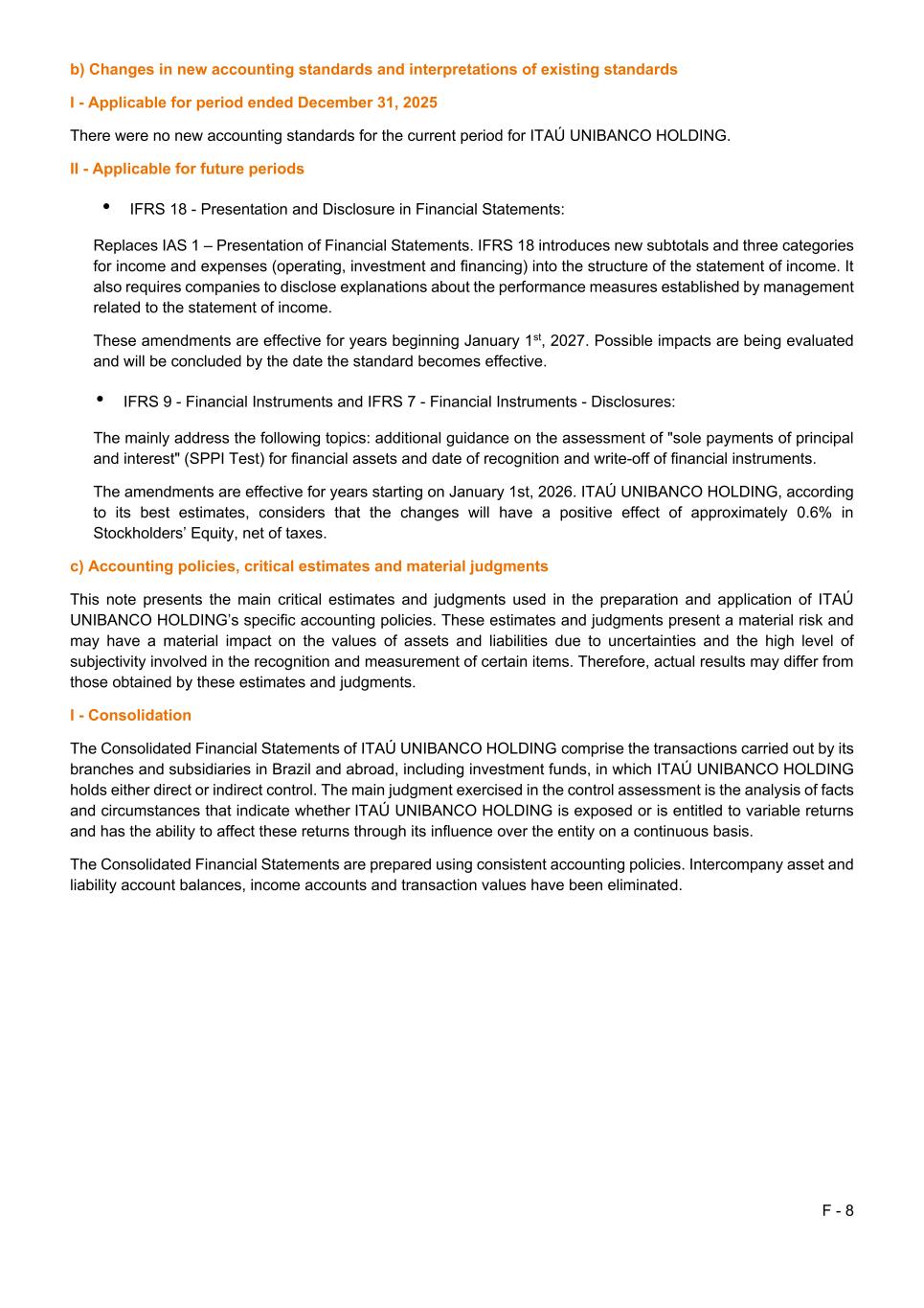 F - 8 b) Changes in new accounting standards and interpretations of existing standards I - Applicable for period ended December 31, 2025 There were no new accounting standards for the current period for ITAÚ UNIBANCO HOLDING. II - Applicable for future periods • IFRS 18 - Presentation and Disclosure in Financial Statements: Replaces IAS 1 – Presentation of Financial Statements. IFRS 18 introduces new subtotals and three categories for income and expenses (operating, investment and financing) into the structure of the statement of income. It also requires companies to disclose explanations about the performance measures established by management related to the statement of income. These amendments are effective for years beginning January 1st, 2027. Possible impacts are being evaluated and will be concluded by the date the standard becomes effective. • IFRS 9 - Financial Instruments and IFRS 7 - Financial Instruments - Disclosures: The mainly address the following topics: additional guidance on the assessment of "sole payments of principal and interest" (SPPI Test) for financial assets and date of recognition and write-off of financial instruments. The amendments are effective for years starting on January 1st, 2026. ITAÚ UNIBANCO HOLDING, according to its best estimates, considers that the changes will have a positive effect of approximately 0.6% in Stockholders’ Equity, net of taxes. c) Accounting policies, critical estimates and material judgments This note presents the main critical estimates and judgments used in the preparation and application of ITAÚ UNIBANCO HOLDING’s specific accounting policies. These estimates and judgments present a material risk and may have a material impact on the values of assets and liabilities due to uncertainties and the high level of subjectivity involved in the recognition and measurement of certain items. Therefore, actual results may differ from those obtained by these estimates and judgments. I - Consolidation The Consolidated Financial Statements of ITAÚ UNIBANCO HOLDING comprise the transactions carried out by its branches and subsidiaries in Brazil and abroad, including investment funds, in which ITAÚ UNIBANCO HOLDING holds either direct or indirect control. The main judgment exercised in the control assessment is the analysis of facts and circumstances that indicate whether ITAÚ UNIBANCO HOLDING is exposed or is entitled to variable returns and has the ability to affect these returns through its influence over the entity on a continuous basis. The Consolidated Financial Statements are prepared using consistent accounting policies. Intercompany asset and liability account balances, income accounts and transaction values have been eliminated.