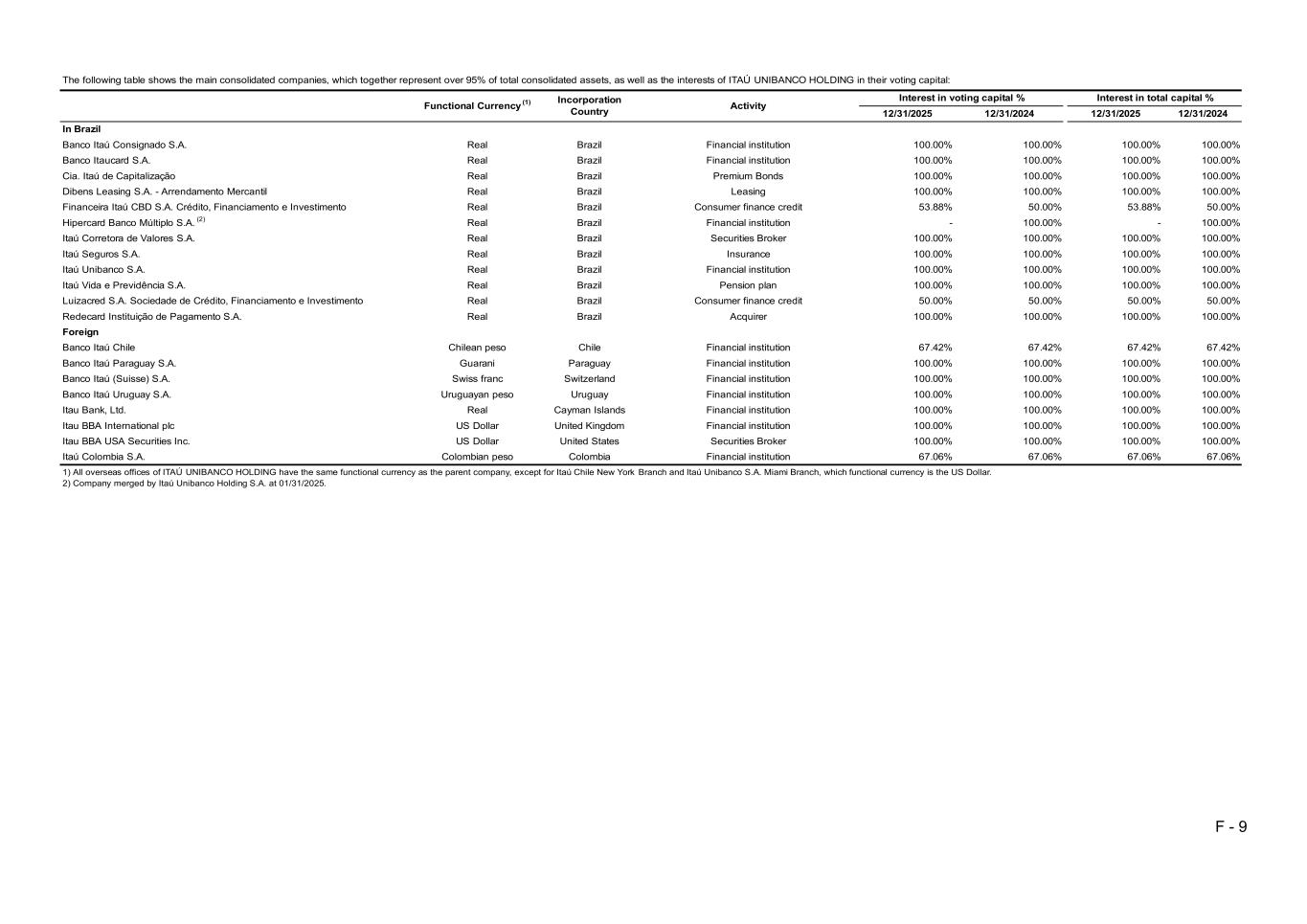 F - 9 The following table shows the main consolidated companies, which together represent over 95% of total consolidated assets, as well as the interests of ITAÚ UNIBANCO HOLDING in their voting capital: Functional Currency (1) Incorporation Country Activity Interest in voting capital % Interest in total capital % 12/31/2025 12/31/2024 12/31/2025 12/31/2024 In Brazil Banco Itaú Consignado S.A. Real Brazil Financial institution 100.00% 100.00% 100.00% 100.00% Banco Itaucard S.A. Real Brazil Financial institution 100.00% 100.00% 100.00% 100.00% Cia. Itaú de Capitalização Real Brazil Premium Bonds 100.00% 100.00% 100.00% 100.00% Dibens Leasing S.A. - Arrendamento Mercantil Real Brazil Leasing 100.00% 100.00% 100.00% 100.00% Financeira Itaú CBD S.A. Crédito, Financiamento e Investimento Real Brazil Consumer finance credit 53.88% 50.00% 53.88% 50.00% Hipercard Banco Múltiplo S.A. (2) Real Brazil Financial institution - 100.00% - 100.00% Itaú Corretora de Valores S.A. Real Brazil Securities Broker 100.00% 100.00% 100.00% 100.00% Itaú Seguros S.A. Real Brazil Insurance 100.00% 100.00% 100.00% 100.00% Itaú Unibanco S.A. Real Brazil Financial institution 100.00% 100.00% 100.00% 100.00% Itaú Vida e Previdência S.A. Real Brazil Pension plan 100.00% 100.00% 100.00% 100.00% Luizacred S.A. Sociedade de Crédito, Financiamento e Investimento Real Brazil Consumer finance credit 50.00% 50.00% 50.00% 50.00% Redecard Instituição de Pagamento S.A. Real Brazil Acquirer 100.00% 100.00% 100.00% 100.00% Foreign Banco Itaú Chile Chilean peso Chile Financial institution 67.42% 67.42% 67.42% 67.42% Banco Itaú Paraguay S.A. Guarani Paraguay Financial institution 100.00% 100.00% 100.00% 100.00% Banco Itaú (Suisse) S.A. Swiss franc Switzerland Financial institution 100.00% 100.00% 100.00% 100.00% Banco Itaú Uruguay S.A. Uruguayan peso Uruguay Financial institution 100.00% 100.00% 100.00% 100.00% Itau Bank, Ltd. Real Cayman Islands Financial institution 100.00% 100.00% 100.00% 100.00% Itau BBA International plc US Dollar United Kingdom Financial institution 100.00% 100.00% 100.00% 100.00% Itau BBA USA Securities Inc. US Dollar United States Securities Broker 100.00% 100.00% 100.00% 100.00% Itaú Colombia S.A. Colombian peso Colombia Financial institution 67.06% 67.06% 67.06% 67.06% 1) All overseas offices of ITAÚ UNIBANCO HOLDING have the same functional currency as the parent company, except for Itaú Chile New York Branch and Itaú Unibanco S.A. Miami Branch, which functional currency is the US Dollar. 2) Company merged by Itaú Unibanco Holding S.A. at 01/31/2025.