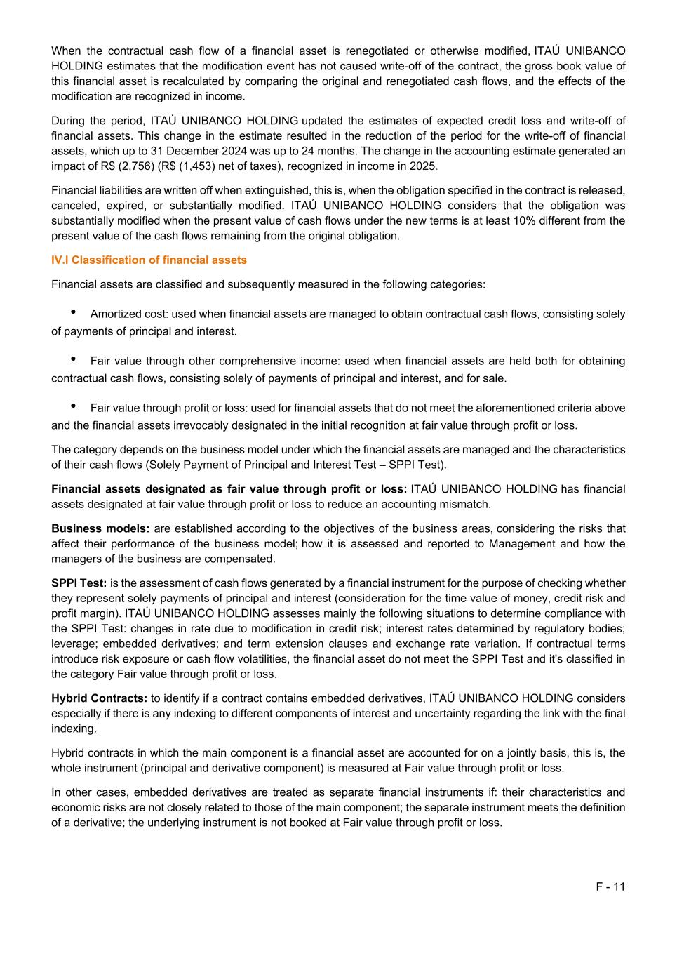 F - 11 When the contractual cash flow of a financial asset is renegotiated or otherwise modified, ITAÚ UNIBANCO HOLDING estimates that the modification event has not caused write-off of the contract, the gross book value of this financial asset is recalculated by comparing the original and renegotiated cash flows, and the effects of the modification are recognized in income. During the period, ITAÚ UNIBANCO HOLDING updated the estimates of expected credit loss and write-off of financial assets. This change in the estimate resulted in the reduction of the period for the write-off of financial assets, which up to 31 December 2024 was up to 24 months. The change in the accounting estimate generated an impact of R$ (2,756) (R$ (1,453) net of taxes), recognized in income in 2025. Financial liabilities are written off when extinguished, this is, when the obligation specified in the contract is released, canceled, expired, or substantially modified. ITAÚ UNIBANCO HOLDING considers that the obligation was substantially modified when the present value of cash flows under the new terms is at least 10% different from the present value of the cash flows remaining from the original obligation. IV.I Classification of financial assets Financial assets are classified and subsequently measured in the following categories: • Amortized cost: used when financial assets are managed to obtain contractual cash flows, consisting solely of payments of principal and interest. • Fair value through other comprehensive income: used when financial assets are held both for obtaining contractual cash flows, consisting solely of payments of principal and interest, and for sale. • Fair value through profit or loss: used for financial assets that do not meet the aforementioned criteria above and the financial assets irrevocably designated in the initial recognition at fair value through profit or loss. The category depends on the business model under which the financial assets are managed and the characteristics of their cash flows (Solely Payment of Principal and Interest Test – SPPI Test). Financial assets designated as fair value through profit or loss: ITAÚ UNIBANCO HOLDING has financial assets designated at fair value through profit or loss to reduce an accounting mismatch. Business models: are established according to the objectives of the business areas, considering the risks that affect their performance of the business model; how it is assessed and reported to Management and how the managers of the business are compensated. SPPI Test: is the assessment of cash flows generated by a financial instrument for the purpose of checking whether they represent solely payments of principal and interest (consideration for the time value of money, credit risk and profit margin). ITAÚ UNIBANCO HOLDING assesses mainly the following situations to determine compliance with the SPPI Test: changes in rate due to modification in credit risk; interest rates determined by regulatory bodies; leverage; embedded derivatives; and term extension clauses and exchange rate variation. If contractual terms introduce risk exposure or cash flow volatilities, the financial asset do not meet the SPPI Test and it's classified in the category Fair value through profit or loss. Hybrid Contracts: to identify if a contract contains embedded derivatives, ITAÚ UNIBANCO HOLDING considers especially if there is any indexing to different components of interest and uncertainty regarding the link with the final indexing. Hybrid contracts in which the main component is a financial asset are accounted for on a jointly basis, this is, the whole instrument (principal and derivative component) is measured at Fair value through profit or loss. In other cases, embedded derivatives are treated as separate financial instruments if: their characteristics and economic risks are not closely related to those of the main component; the separate instrument meets the definition of a derivative; the underlying instrument is not booked at Fair value through profit or loss.