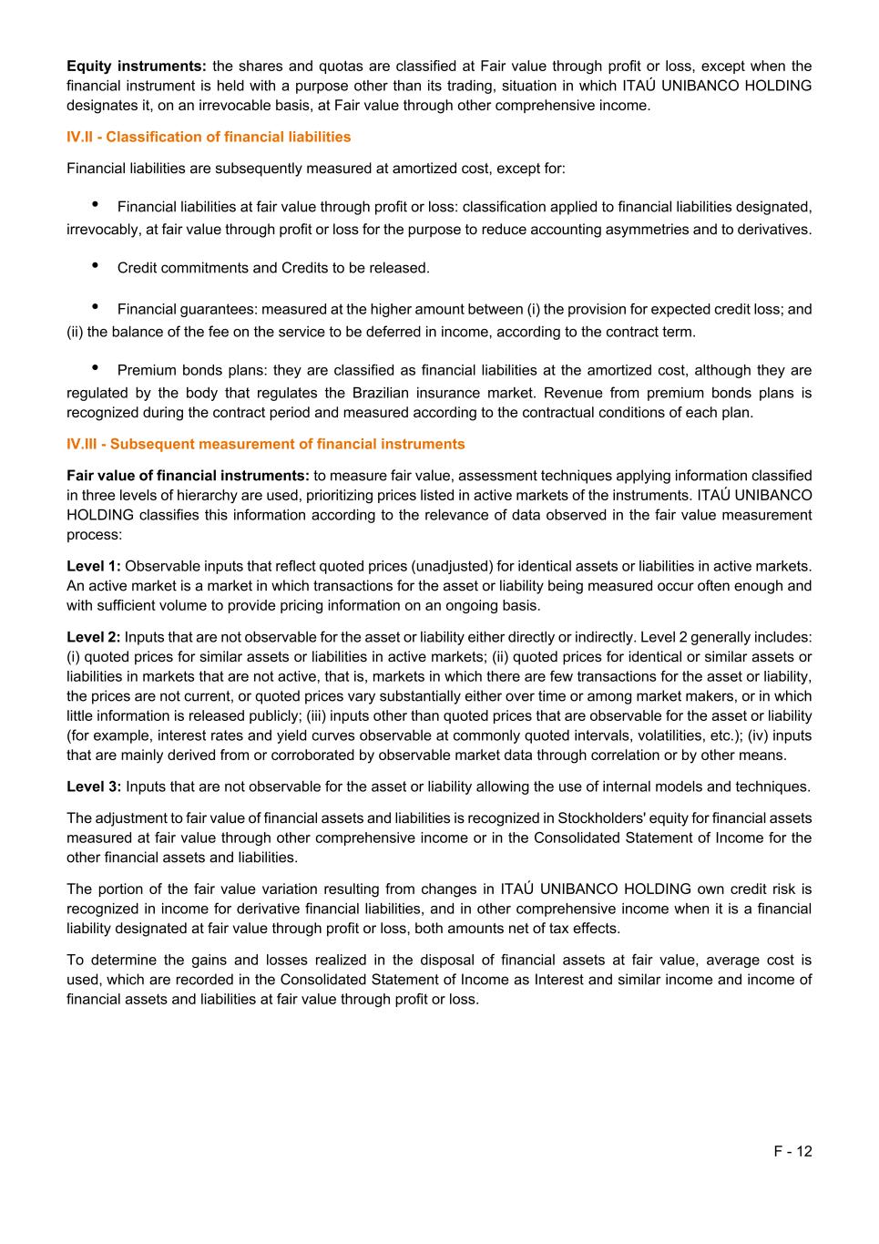 F - 12 Equity instruments: the shares and quotas are classified at Fair value through profit or loss, except when the financial instrument is held with a purpose other than its trading, situation in which ITAÚ UNIBANCO HOLDING designates it, on an irrevocable basis, at Fair value through other comprehensive income. IV.II - Classification of financial liabilities Financial liabilities are subsequently measured at amortized cost, except for: • Financial liabilities at fair value through profit or loss: classification applied to financial liabilities designated, irrevocably, at fair value through profit or loss for the purpose to reduce accounting asymmetries and to derivatives. • Credit commitments and Credits to be released. • Financial guarantees: measured at the higher amount between (i) the provision for expected credit loss; and (ii) the balance of the fee on the service to be deferred in income, according to the contract term. • Premium bonds plans: they are classified as financial liabilities at the amortized cost, although they are regulated by the body that regulates the Brazilian insurance market. Revenue from premium bonds plans is recognized during the contract period and measured according to the contractual conditions of each plan. IV.III - Subsequent measurement of financial instruments Fair value of financial instruments: to measure fair value, assessment techniques applying information classified in three levels of hierarchy are used, prioritizing prices listed in active markets of the instruments. ITAÚ UNIBANCO HOLDING classifies this information according to the relevance of data observed in the fair value measurement process: Level 1: Observable inputs that reflect quoted prices (unadjusted) for identical assets or liabilities in active markets. An active market is a market in which transactions for the asset or liability being measured occur often enough and with sufficient volume to provide pricing information on an ongoing basis. Level 2: Inputs that are not observable for the asset or liability either directly or indirectly. Level 2 generally includes: (i) quoted prices for similar assets or liabilities in active markets; (ii) quoted prices for identical or similar assets or liabilities in markets that are not active, that is, markets in which there are few transactions for the asset or liability, the prices are not current, or quoted prices vary substantially either over time or among market makers, or in which little information is released publicly; (iii) inputs other than quoted prices that are observable for the asset or liability (for example, interest rates and yield curves observable at commonly quoted intervals, volatilities, etc.); (iv) inputs that are mainly derived from or corroborated by observable market data through correlation or by other means. Level 3: Inputs that are not observable for the asset or liability allowing the use of internal models and techniques. The adjustment to fair value of financial assets and liabilities is recognized in Stockholders' equity for financial assets measured at fair value through other comprehensive income or in the Consolidated Statement of Income for the other financial assets and liabilities. The portion of the fair value variation resulting from changes in ITAÚ UNIBANCO HOLDING own credit risk is recognized in income for derivative financial liabilities, and in other comprehensive income when it is a financial liability designated at fair value through profit or loss, both amounts net of tax effects. To determine the gains and losses realized in the disposal of financial assets at fair value, average cost is used, which are recorded in the Consolidated Statement of Income as Interest and similar income and income of financial assets and liabilities at fair value through profit or loss.