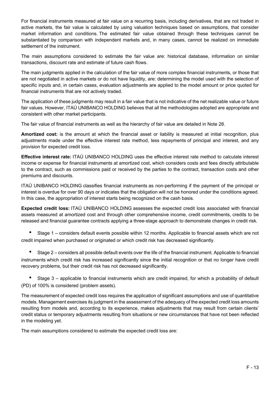 F - 13 For financial instruments measured at fair value on a recurring basis, including derivatives, that are not traded in active markets, the fair value is calculated by using valuation techniques based on assumptions, that consider market information and conditions. The estimated fair value obtained through these techniques cannot be substantiated by comparison with independent markets and, in many cases, cannot be realized on immediate settlement of the instrument. The main assumptions considered to estimate the fair value are: historical database, information on similar transactions, discount rate and estimate of future cash flows. The main judgments applied in the calculation of the fair value of more complex financial instruments, or those that are not negotiated in active markets or do not have liquidity, are: determining the model used with the selection of specific inputs and, in certain cases, evaluation adjustments are applied to the model amount or price quoted for financial instruments that are not actively traded. The application of these judgments may result in a fair value that is not indicative of the net realizable value or future fair values. However, ITAÚ UNIBANCO HOLDING believes that all the methodologies adopted are appropriate and consistent with other market participants. The fair value of financial instruments as well as the hierarchy of fair value are detailed in Note 28. Amortized cost: is the amount at which the financial asset or liability is measured at initial recognition, plus adjustments made under the effective interest rate method, less repayments of principal and interest, and any provision for expected credit loss. Effective interest rate: ITAÚ UNIBANCO HOLDING uses the effective interest rate method to calculate interest income or expense for financial instruments at amortized cost, which considers costs and fees directly attributable to the contract, such as commissions paid or received by the parties to the contract, transaction costs and other premiums and discounts. ITAÚ UNIBANCO HOLDING classifies financial instruments as non-performing if the payment of the principal or interest is overdue for over 90 days or indicates that the obligation will not be honored under the conditions agreed. In this case, the appropriation of interest starts being recognized on the cash basis. Expected credit loss: ITAÚ UNIBANCO HOLDING assesses the expected credit loss associated with financial assets measured at amortized cost and through other comprehensive income, credit commitments, credits to be released and financial guarantee contracts applying a three-stage approach to demonstrate changes in credit risk. • Stage 1 – considers default events possible within 12 months. Applicable to financial assets which are not credit impaired when purchased or originated or which credit risk has decreased significantly. • Stage 2 – considers all possible default events over the life of the financial instrument. Applicable to financial instruments which credit risk has increased significantly since the initial recognition or that no longer have credit recovery problems, but their credit risk has not decreased significantly. • Stage 3 – applicable to financial instruments which are credit impaired, for which a probability of default (PD) of 100% is considered (problem assets). The measurement of expected credit loss requires the application of significant assumptions and use of quantitative models. Management exercises its judgment in the assessment of the adequacy of the expected credit loss amounts resulting from models and, according to its experience, makes adjustments that may result from certain clients’ credit status or temporary adjustments resulting from situations or new circumstances that have not been reflected in the modeling yet. The main assumptions considered to estimate the expected credit loss are: