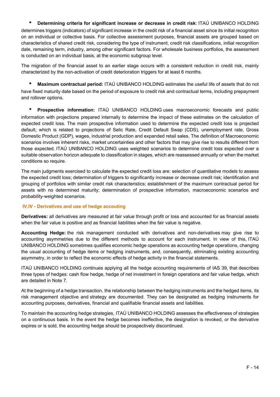 F - 14 • Determining criteria for significant increase or decrease in credit risk: ITAÚ UNIBANCO HOLDING determines triggers (indicators) of significant increase in the credit risk of a financial asset since its initial recognition on an individual or collective basis. For collective assessment purposes, financial assets are grouped based on characteristics of shared credit risk, considering the type of instrument, credit risk classifications, initial recognition date, remaining term, industry, among other significant factors. For wholesale business portfolios, the assessment is conducted on an individual basis, at the economic subgroup level. The migration of the financial asset to an earlier stage occurs with a consistent reduction in credit risk, mainly characterized by the non-activation of credit deterioration triggers for at least 6 months. • Maximum contractual period: ITAÚ UNIBANCO HOLDING estimates the useful life of assets that do not have fixed maturity date based on the period of exposure to credit risk and contractual terms, including prepayment and rollover options. • Prospective information: ITAÚ UNIBANCO HOLDING uses macroeconomic forecasts and public information with projections prepared internally to determine the impact of these estimates on the calculation of expected credit loss. The main prospective information used to determine the expected credit loss is projected default, which is related to projections of Selic Rate, Credit Default Swap (CDS), unemployment rate, Gross Domestic Product (GDP), wages, industrial production and expanded retail sales. The definition of Macroeconomic scenarios involves inherent risks, market uncertainties and other factors that may give rise to results different from those expected. ITAÚ UNIBANCO HOLDING uses weighted scenarios to determine credit loss expected over a suitable observation horizon adequate to classification in stages, which are reassessed annually or when the market conditions so require. The main judgments exercised to calculate the expected credit loss are: selection of quantitative models to assess the expected credit loss; determination of triggers to significantly increase or decrease credit risk; identification and grouping of portfolios with similar credit risk characteristics; establishment of the maximum contractual period for assets with no determined maturity; determination of prospective information, macroeconomic scenarios and probability-weighted scenarios. IV.IV - Derivatives and use of hedge accouting Derivatives: all derivatives are measured at fair value through profit or loss and accounted for as financial assets when the fair value is positive and as financial liabilities when the fair value is negative. Accounting Hedge: the risk management conducted with derivatives and non-derivatives may give rise to accounting asymmetries due to the different methods to account for each instrument. In view of this, ITAÚ UNIBANCO HOLDING sometimes qualifies economic hedge operations as accounting hedge operations, changing the usual accounting of hedge items or hedging instruments, and, consequently, eliminating existing accounting asymmetry, in order to reflect the economic effects of hedge activity in the financial statements. ITAÚ UNIBANCO HOLDING continues applying all the hedge accounting requirements of IAS 39, that describes three types of hedges: cash flow hedge, hedge of net investment in foreign operations and fair value hedge, which are detailed in Note 7. At the beginning of a hedge transaction, the relationship between the hedging instruments and the hedged items, its risk management objective and strategy are documented. They can be designated as hedging instruments for accounting purposes, derivatives, financial and qualifiable financial assets and liabilities. To maintain the accounting hedge strategies, ITAÚ UNIBANCO HOLDING assesses the effectiveness of strategies on a continuous basis. In the event the hedge becomes ineffective, the designation is revoked, or the derivative expires or is sold, the accounting hedge should be prospectively discontinued.