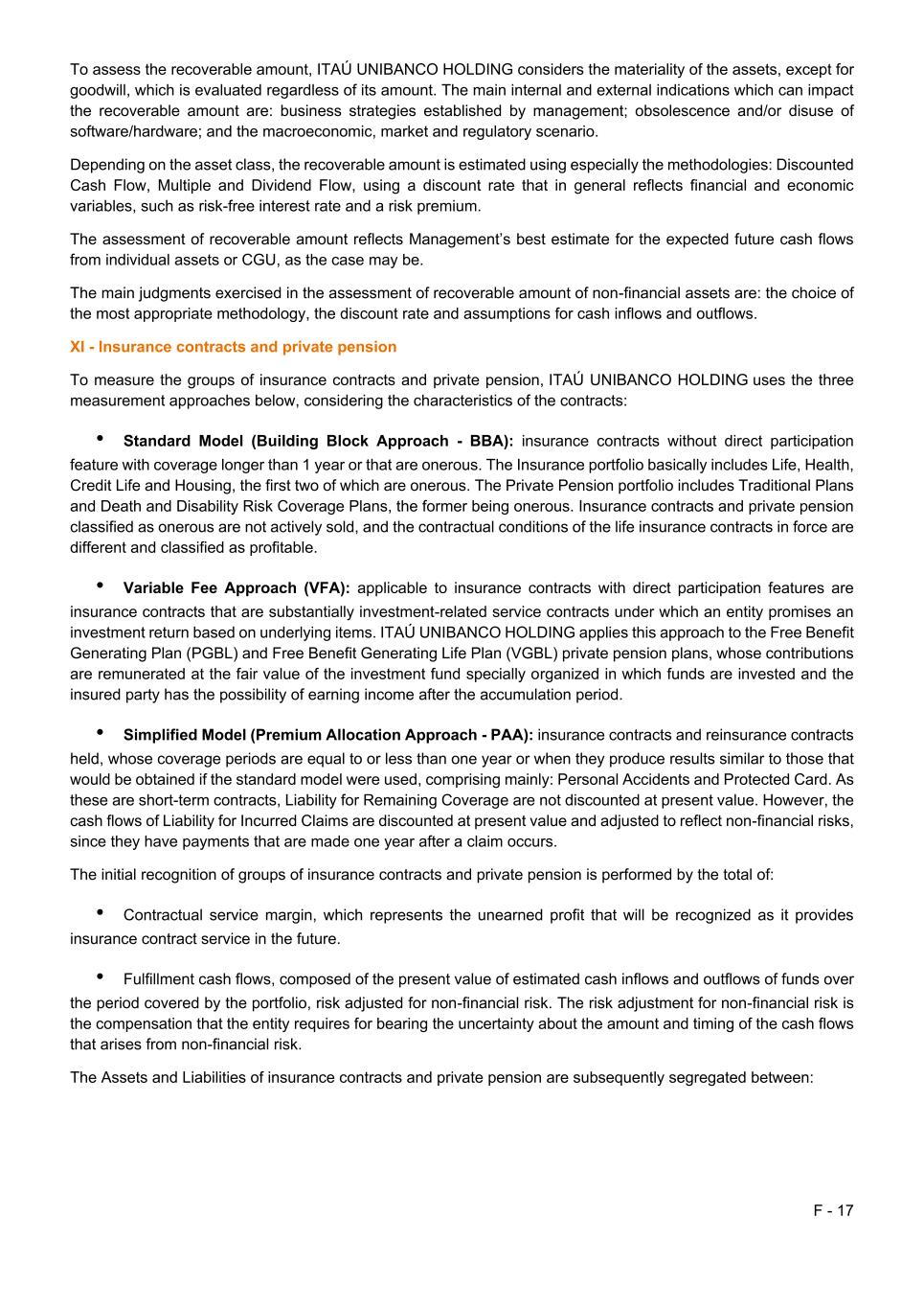 F - 17 To assess the recoverable amount, ITAÚ UNIBANCO HOLDING considers the materiality of the assets, except for goodwill, which is evaluated regardless of its amount. The main internal and external indications which can impact the recoverable amount are: business strategies established by management; obsolescence and/or disuse of software/hardware; and the macroeconomic, market and regulatory scenario. Depending on the asset class, the recoverable amount is estimated using especially the methodologies: Discounted Cash Flow, Multiple and Dividend Flow, using a discount rate that in general reflects financial and economic variables, such as risk-free interest rate and a risk premium. The assessment of recoverable amount reflects Management’s best estimate for the expected future cash flows from individual assets or CGU, as the case may be. The main judgments exercised in the assessment of recoverable amount of non-financial assets are: the choice of the most appropriate methodology, the discount rate and assumptions for cash inflows and outflows. XI - Insurance contracts and private pension To measure the groups of insurance contracts and private pension, ITAÚ UNIBANCO HOLDING uses the three measurement approaches below, considering the characteristics of the contracts: • Standard Model (Building Block Approach - BBA): insurance contracts without direct participation feature with coverage longer than 1 year or that are onerous. The Insurance portfolio basically includes Life, Health, Credit Life and Housing, the first two of which are onerous. The Private Pension portfolio includes Traditional Plans and Death and Disability Risk Coverage Plans, the former being onerous. Insurance contracts and private pension classified as onerous are not actively sold, and the contractual conditions of the life insurance contracts in force are different and classified as profitable. • Variable Fee Approach (VFA): applicable to insurance contracts with direct participation features are insurance contracts that are substantially investment-related service contracts under which an entity promises an investment return based on underlying items. ITAÚ UNIBANCO HOLDING applies this approach to the Free Benefit Generating Plan (PGBL) and Free Benefit Generating Life Plan (VGBL) private pension plans, whose contributions are remunerated at the fair value of the investment fund specially organized in which funds are invested and the insured party has the possibility of earning income after the accumulation period. • Simplified Model (Premium Allocation Approach - PAA): insurance contracts and reinsurance contracts held, whose coverage periods are equal to or less than one year or when they produce results similar to those that would be obtained if the standard model were used, comprising mainly: Personal Accidents and Protected Card. As these are short-term contracts, Liability for Remaining Coverage are not discounted at present value. However, the cash flows of Liability for Incurred Claims are discounted at present value and adjusted to reflect non-financial risks, since they have payments that are made one year after a claim occurs. The initial recognition of groups of insurance contracts and private pension is performed by the total of: • Contractual service margin, which represents the unearned profit that will be recognized as it provides insurance contract service in the future. • Fulfillment cash flows, composed of the present value of estimated cash inflows and outflows of funds over the period covered by the portfolio, risk adjusted for non-financial risk. The risk adjustment for non-financial risk is the compensation that the entity requires for bearing the uncertainty about the amount and timing of the cash flows that arises from non-financial risk. The Assets and Liabilities of insurance contracts and private pension are subsequently segregated between: