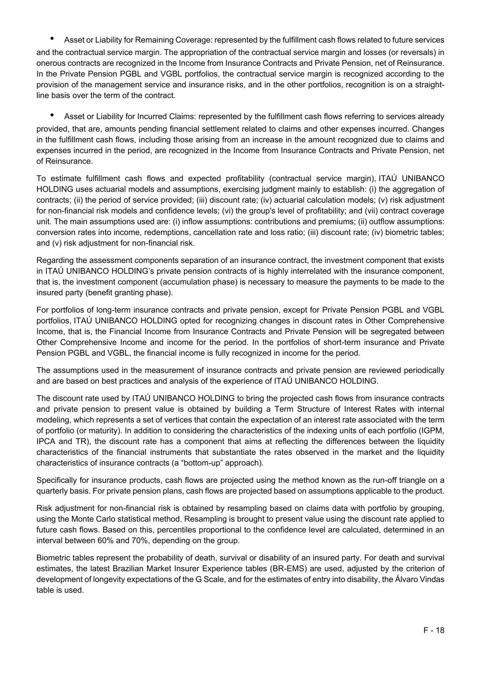 F - 18 • Asset or Liability for Remaining Coverage: represented by the fulfillment cash flows related to future services and the contractual service margin. The appropriation of the contractual service margin and losses (or reversals) in onerous contracts are recognized in the Income from Insurance Contracts and Private Pension, net of Reinsurance. In the Private Pension PGBL and VGBL portfolios, the contractual service margin is recognized according to the provision of the management service and insurance risks, and in the other portfolios, recognition is on a straight- line basis over the term of the contract. • Asset or Liability for Incurred Claims: represented by the fulfillment cash flows referring to services already provided, that are, amounts pending financial settlement related to claims and other expenses incurred. Changes in the fulfillment cash flows, including those arising from an increase in the amount recognized due to claims and expenses incurred in the period, are recognized in the Income from Insurance Contracts and Private Pension, net of Reinsurance. To estimate fulfillment cash flows and expected profitability (contractual service margin), ITAÚ UNIBANCO HOLDING uses actuarial models and assumptions, exercising judgment mainly to establish: (i) the aggregation of contracts; (ii) the period of service provided; (iii) discount rate; (iv) actuarial calculation models; (v) risk adjustment for non-financial risk models and confidence levels; (vi) the group's level of profitability; and (vii) contract coverage unit. The main assumptions used are: (i) inflow assumptions: contributions and premiums; (ii) outflow assumptions: conversion rates into income, redemptions, cancellation rate and loss ratio; (iii) discount rate; (iv) biometric tables; and (v) risk adjustment for non-financial risk. Regarding the assessment components separation of an insurance contract, the investment component that exists in ITAÚ UNIBANCO HOLDING’s private pension contracts of is highly interrelated with the insurance component, that is, the investment component (accumulation phase) is necessary to measure the payments to be made to the insured party (benefit granting phase). For portfolios of long-term insurance contracts and private pension, except for Private Pension PGBL and VGBL portfolios, ITAÚ UNIBANCO HOLDING opted for recognizing changes in discount rates in Other Comprehensive Income, that is, the Financial Income from Insurance Contracts and Private Pension will be segregated between Other Comprehensive Income and income for the period. In the portfolios of short-term insurance and Private Pension PGBL and VGBL, the financial income is fully recognized in income for the period. The assumptions used in the measurement of insurance contracts and private pension are reviewed periodically and are based on best practices and analysis of the experience of ITAÚ UNIBANCO HOLDING. The discount rate used by ITAÚ UNIBANCO HOLDING to bring the projected cash flows from insurance contracts and private pension to present value is obtained by building a Term Structure of Interest Rates with internal modeling, which represents a set of vertices that contain the expectation of an interest rate associated with the term of portfolio (or maturity). In addition to considering the characteristics of the indexing units of each portfolio (IGPM, IPCA and TR), the discount rate has a component that aims at reflecting the differences between the liquidity characteristics of the financial instruments that substantiate the rates observed in the market and the liquidity characteristics of insurance contracts (a “bottom-up” approach). Specifically for insurance products, cash flows are projected using the method known as the run-off triangle on a quarterly basis. For private pension plans, cash flows are projected based on assumptions applicable to the product. Risk adjustment for non-financial risk is obtained by resampling based on claims data with portfolio by grouping, using the Monte Carlo statistical method. Resampling is brought to present value using the discount rate applied to future cash flows. Based on this, percentiles proportional to the confidence level are calculated, determined in an interval between 60% and 70%, depending on the group. Biometric tables represent the probability of death, survival or disability of an insured party. For death and survival estimates, the latest Brazilian Market Insurer Experience tables (BR-EMS) are used, adjusted by the criterion of development of longevity expectations of the G Scale, and for the estimates of entry into disability, the Álvaro Vindas table is used.