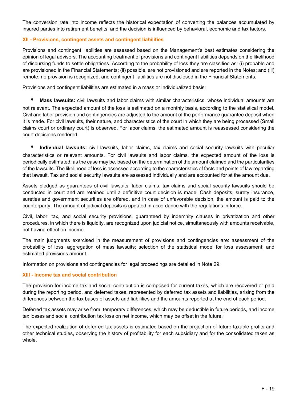 F - 19 The conversion rate into income reflects the historical expectation of converting the balances accumulated by insured parties into retirement benefits, and the decision is influenced by behavioral, economic and tax factors. XII - Provisions, contingent assets and contingent liabilities Provisions and contingent liabilities are assessed based on the Management’s best estimates considering the opinion of legal advisors. The accounting treatment of provisions and contingent liabilities depends on the likelihood of disbursing funds to settle obligations. According to the probability of loss they are classified as: (i) probable and are provisioned in the Financial Statements; (ii) possible, are not provisioned and are reported in the Notes; and (iii) remote: no provision is recognized, and contingent liabilities are not disclosed in the Financial Statements. Provisions and contingent liabilities are estimated in a mass or individualized basis: • Mass lawsuits: civil lawsuits and labor claims with similar characteristics, whose individual amounts are not relevant. The expected amount of the loss is estimated on a monthly basis, according to the statistical model. Civil and labor provision and contingencies are adjusted to the amount of the performance guarantee deposit when it is made. For civil lawsuits, their nature, and characteristics of the court in which they are being processed (Small claims court or ordinary court) is observed. For labor claims, the estimated amount is reassessed considering the court decisions rendered. • Individual lawsuits: civil lawsuits, labor claims, tax claims and social security lawsuits with peculiar characteristics or relevant amounts. For civil lawsuits and labor claims, the expected amount of the loss is periodically estimated, as the case may be, based on the determination of the amount claimed and the particularities of the lawsuits. The likelihood of loss is assessed according to the characteristics of facts and points of law regarding that lawsuit. Tax and social security lawsuits are assessed individually and are accounted for at the amount due. Assets pledged as guarantees of civil lawsuits, labor claims, tax claims and social security lawsuits should be conducted in court and are retained until a definitive court decision is made. Cash deposits, surety insurance, sureties and government securities are offered, and in case of unfavorable decision, the amount is paid to the counterparty. The amount of judicial deposits is updated in accordance with the regulations in force. Civil, labor, tax, and social security provisions, guaranteed by indemnity clauses in privatization and other procedures, in which there is liquidity, are recognized upon judicial notice, simultaneously with amounts receivable, not having effect on income. The main judgments exercised in the measurement of provisions and contingencies are: assessment of the probability of loss; aggregation of mass lawsuits; selection of the statistical model for loss assessment; and estimated provisions amount. Information on provisions and contingencies for legal proceedings are detailed in Note 29. XIII - Income tax and social contribution The provision for income tax and social contribution is composed for current taxes, which are recovered or paid during the reporting period, and deferred taxes, represented by deferred tax assets and liabilities, arising from the differences between the tax bases of assets and liabilities and the amounts reported at the end of each period. Deferred tax assets may arise from: temporary differences, which may be deductible in future periods, and income tax losses and social contribution tax loss on net income, which may be offset in the future. The expected realization of deferred tax assets is estimated based on the projection of future taxable profits and other technical studies, observing the history of profitability for each subsidiary and for the consolidated taken as whole.