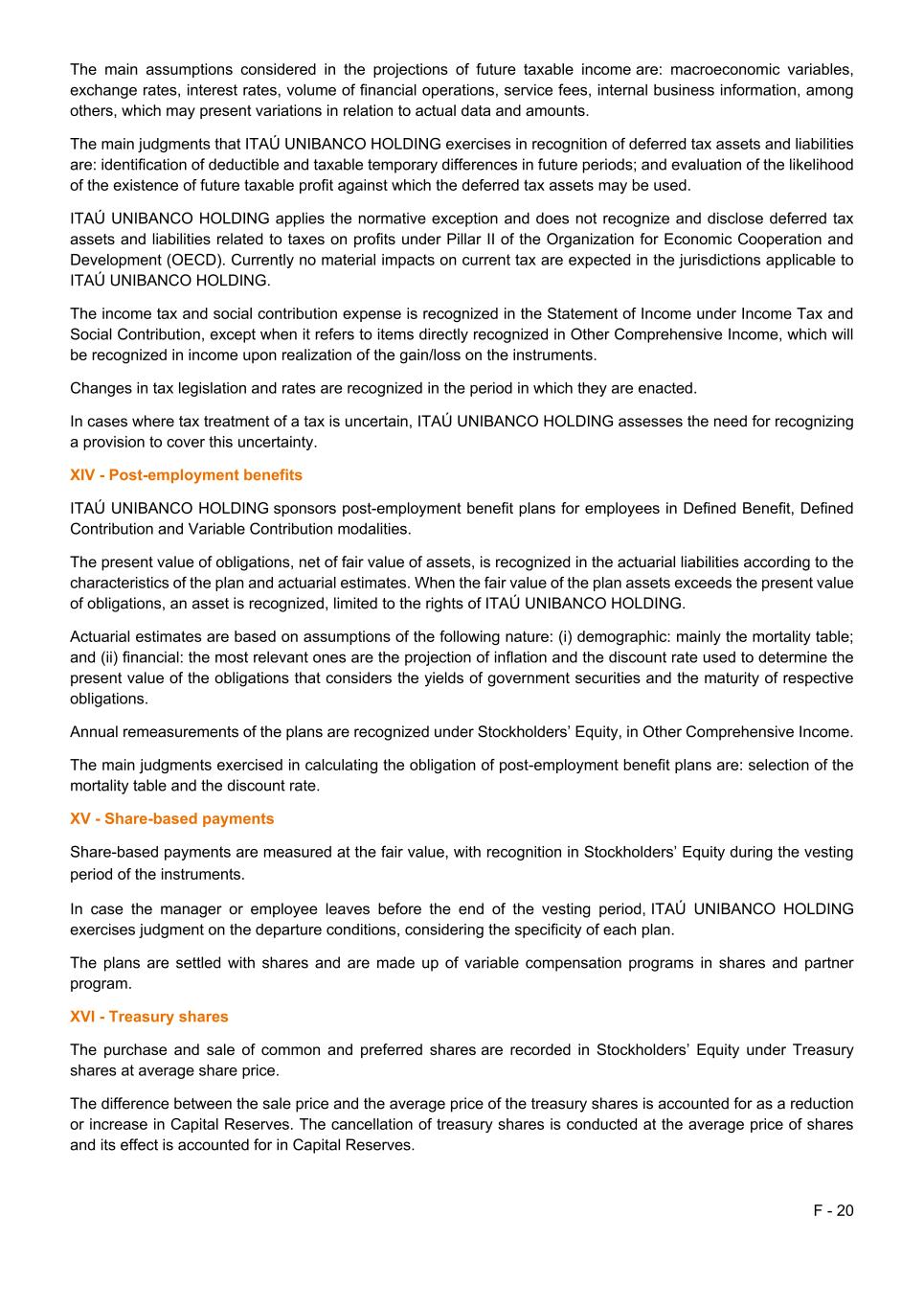 F - 20 The main assumptions considered in the projections of future taxable income are: macroeconomic variables, exchange rates, interest rates, volume of financial operations, service fees, internal business information, among others, which may present variations in relation to actual data and amounts. The main judgments that ITAÚ UNIBANCO HOLDING exercises in recognition of deferred tax assets and liabilities are: identification of deductible and taxable temporary differences in future periods; and evaluation of the likelihood of the existence of future taxable profit against which the deferred tax assets may be used. ITAÚ UNIBANCO HOLDING applies the normative exception and does not recognize and disclose deferred tax assets and liabilities related to taxes on profits under Pillar II of the Organization for Economic Cooperation and Development (OECD). Currently no material impacts on current tax are expected in the jurisdictions applicable to ITAÚ UNIBANCO HOLDING. The income tax and social contribution expense is recognized in the Statement of Income under Income Tax and Social Contribution, except when it refers to items directly recognized in Other Comprehensive Income, which will be recognized in income upon realization of the gain/loss on the instruments. Changes in tax legislation and rates are recognized in the period in which they are enacted. In cases where tax treatment of a tax is uncertain, ITAÚ UNIBANCO HOLDING assesses the need for recognizing a provision to cover this uncertainty. XIV - Post-employment benefits ITAÚ UNIBANCO HOLDING sponsors post-employment benefit plans for employees in Defined Benefit, Defined Contribution and Variable Contribution modalities. The present value of obligations, net of fair value of assets, is recognized in the actuarial liabilities according to the characteristics of the plan and actuarial estimates. When the fair value of the plan assets exceeds the present value of obligations, an asset is recognized, limited to the rights of ITAÚ UNIBANCO HOLDING. Actuarial estimates are based on assumptions of the following nature: (i) demographic: mainly the mortality table; and (ii) financial: the most relevant ones are the projection of inflation and the discount rate used to determine the present value of the obligations that considers the yields of government securities and the maturity of respective obligations. Annual remeasurements of the plans are recognized under Stockholders’ Equity, in Other Comprehensive Income. The main judgments exercised in calculating the obligation of post-employment benefit plans are: selection of the mortality table and the discount rate. XV - Share-based payments Share-based payments are measured at the fair value, with recognition in Stockholders’ Equity during the vesting period of the instruments. In case the manager or employee leaves before the end of the vesting period, ITAÚ UNIBANCO HOLDING exercises judgment on the departure conditions, considering the specificity of each plan. The plans are settled with shares and are made up of variable compensation programs in shares and partner program. XVI - Treasury shares The purchase and sale of common and preferred shares are recorded in Stockholders’ Equity under Treasury shares at average share price. The difference between the sale price and the average price of the treasury shares is accounted for as a reduction or increase in Capital Reserves. The cancellation of treasury shares is conducted at the average price of shares and its effect is accounted for in Capital Reserves.