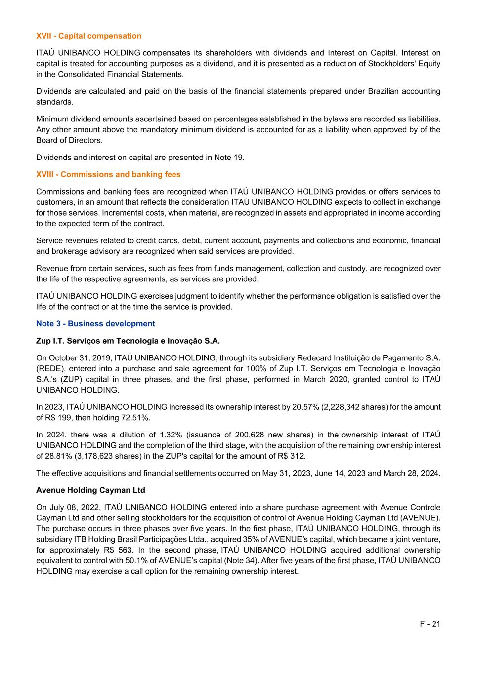 F - 21 XVII - Capital compensation ITAÚ UNIBANCO HOLDING compensates its shareholders with dividends and Interest on Capital. Interest on capital is treated for accounting purposes as a dividend, and it is presented as a reduction of Stockholders' Equity in the Consolidated Financial Statements. Dividends are calculated and paid on the basis of the financial statements prepared under Brazilian accounting standards. Minimum dividend amounts ascertained based on percentages established in the bylaws are recorded as liabilities. Any other amount above the mandatory minimum dividend is accounted for as a liability when approved by of the Board of Directors. Dividends and interest on capital are presented in Note 19. XVIII - Commissions and banking fees Commissions and banking fees are recognized when ITAÚ UNIBANCO HOLDING provides or offers services to customers, in an amount that reflects the consideration ITAÚ UNIBANCO HOLDING expects to collect in exchange for those services. Incremental costs, when material, are recognized in assets and appropriated in income according to the expected term of the contract. Service revenues related to credit cards, debit, current account, payments and collections and economic, financial and brokerage advisory are recognized when said services are provided. Revenue from certain services, such as fees from funds management, collection and custody, are recognized over the life of the respective agreements, as services are provided. ITAÚ UNIBANCO HOLDING exercises judgment to identify whether the performance obligation is satisfied over the life of the contract or at the time the service is provided. Note 3 - Business development Zup I.T. Serviços em Tecnologia e Inovação S.A. On October 31, 2019, ITAÚ UNIBANCO HOLDING, through its subsidiary Redecard Instituição de Pagamento S.A. (REDE), entered into a purchase and sale agreement for 100% of Zup I.T. Serviços em Tecnologia e Inovação S.A.'s (ZUP) capital in three phases, and the first phase, performed in March 2020, granted control to ITAÚ UNIBANCO HOLDING. In 2023, ITAÚ UNIBANCO HOLDING increased its ownership interest by 20.57% (2,228,342 shares) for the amount of R$ 199, then holding 72.51%. In 2024, there was a dilution of 1.32% (issuance of 200,628 new shares) in the ownership interest of ITAÚ UNIBANCO HOLDING and the completion of the third stage, with the acquisition of the remaining ownership interest of 28.81% (3,178,623 shares) in the ZUP's capital for the amount of R$ 312. The effective acquisitions and financial settlements occurred on May 31, 2023, June 14, 2023 and March 28, 2024. Avenue Holding Cayman Ltd On July 08, 2022, ITAÚ UNIBANCO HOLDING entered into a share purchase agreement with Avenue Controle Cayman Ltd and other selling stockholders for the acquisition of control of Avenue Holding Cayman Ltd (AVENUE). The purchase occurs in three phases over five years. In the first phase, ITAÚ UNIBANCO HOLDING, through its subsidiary ITB Holding Brasil Participações Ltda., acquired 35% of AVENUE’s capital, which became a joint venture, for approximately R$ 563. In the second phase, ITAÚ UNIBANCO HOLDING acquired additional ownership equivalent to control with 50.1% of AVENUE’s capital (Note 34). After five years of the first phase, ITAÚ UNIBANCO HOLDING may exercise a call option for the remaining ownership interest.