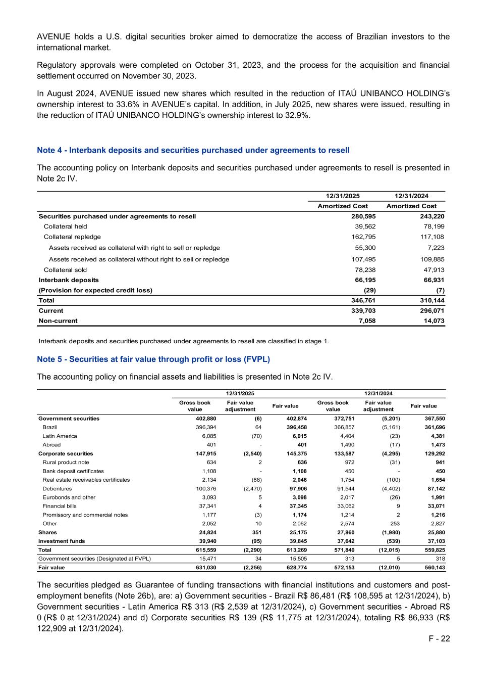 F - 22 AVENUE holds a U.S. digital securities broker aimed to democratize the access of Brazilian investors to the international market. Regulatory approvals were completed on October 31, 2023, and the process for the acquisition and financial settlement occurred on November 30, 2023. In August 2024, AVENUE issued new shares which resulted in the reduction of ITAÚ UNIBANCO HOLDING’s ownership interest to 33.6% in AVENUE’s capital. In addition, in July 2025, new shares were issued, resulting in the reduction of ITAÚ UNIBANCO HOLDING’s ownership interest to 32.9%. Note 4 - Interbank deposits and securities purchased under agreements to resell The accounting policy on Interbank deposits and securities purchased under agreements to resell is presented in Note 2c IV. 12/31/2025 12/31/2024 Amortized Cost Amortized Cost Securities purchased under agreements to resell 280,595 243,220 Collateral held 39,562 78,199 Collateral repledge 162,795 117,108 Assets received as collateral with right to sell or repledge 55,300 7,223 Assets received as collateral without right to sell or repledge 107,495 109,885 Collateral sold 78,238 47,913 Interbank deposits 66,195 66,931 (Provision for expected credit loss) (29) (7) Total 346,761 310,144 Current 339,703 296,071 Non-current 7,058 14,073 Interbank deposits and securities purchased under agreements to resell are classified in stage 1. Note 5 - Securities at fair value through profit or loss (FVPL) The accounting policy on financial assets and liabilities is presented in Note 2c IV. 12/31/2025 12/31/2024 Gross book value Fair value adjustment Fair value Gross book value Fair value adjustment Fair value Government securities 402,880 (6) 402,874 372,751 (5,201) 367,550 Brazil 396,394 64 396,458 366,857 (5,161) 361,696 Latin America 6,085 (70) 6,015 4,404 (23) 4,381 Abroad 401 - 401 1,490 (17) 1,473 Corporate securities 147,915 (2,540) 145,375 133,587 (4,295) 129,292 Rural product note 634 2 636 972 (31) 941 Bank deposit certificates 1,108 - 1,108 450 - 450 Real estate receivables certificates 2,134 (88) 2,046 1,754 (100) 1,654 Debentures 100,376 (2,470) 97,906 91,544 (4,402) 87,142 Eurobonds and other 3,093 5 3,098 2,017 (26) 1,991 Financial bills 37,341 4 37,345 33,062 9 33,071 Promissory and commercial notes 1,177 (3) 1,174 1,214 2 1,216 Other 2,052 10 2,062 2,574 253 2,827 Shares 24,824 351 25,175 27,860 (1,980) 25,880 Investment funds 39,940 (95) 39,845 37,642 (539) 37,103 Total 615,559 (2,290) 613,269 571,840 (12,015) 559,825 Government securities (Designated at FVPL) 15,471 34 15,505 313 5 318 Fair value 631,030 (2,256) 628,774 572,153 (12,010) 560,143 The securities pledged as Guarantee of funding transactions with financial institutions and customers and post- employment benefits (Note 26b), are: a) Government securities - Brazil R$ 86,481 (R$ 108,595 at 12/31/2024), b) Government securities - Latin America R$ 313 (R$ 2,539 at 12/31/2024), c) Government securities - Abroad R$ 0 (R$ 0 at 12/31/2024) and d) Corporate securities R$ 139 (R$ 11,775 at 12/31/2024), totaling R$ 86,933 (R$ 122,909 at 12/31/2024).