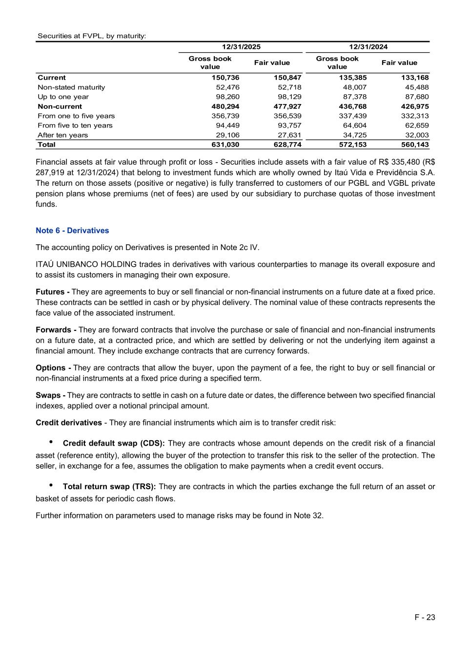 F - 23 Securities at FVPL, by maturity: 12/31/2025 12/31/2024 Gross book value Fair value Gross book value Fair value Current 150,736 150,847 135,385 133,168 Non-stated maturity 52,476 52,718 48,007 45,488 Up to one year 98,260 98,129 87,378 87,680 Non-current 480,294 477,927 436,768 426,975 From one to five years 356,739 356,539 337,439 332,313 From five to ten years 94,449 93,757 64,604 62,659 After ten years 29,106 27,631 34,725 32,003 Total 631,030 628,774 572,153 560,143 Financial assets at fair value through profit or loss - Securities include assets with a fair value of R$ 335,480 (R$ 287,919 at 12/31/2024) that belong to investment funds which are wholly owned by Itaú Vida e Previdência S.A. The return on those assets (positive or negative) is fully transferred to customers of our PGBL and VGBL private pension plans whose premiums (net of fees) are used by our subsidiary to purchase quotas of those investment funds. Note 6 - Derivatives The accounting policy on Derivatives is presented in Note 2c IV. ITAÚ UNIBANCO HOLDING trades in derivatives with various counterparties to manage its overall exposure and to assist its customers in managing their own exposure. Futures - They are agreements to buy or sell financial or non-financial instruments on a future date at a fixed price. These contracts can be settled in cash or by physical delivery. The nominal value of these contracts represents the face value of the associated instrument. Forwards - They are forward contracts that involve the purchase or sale of financial and non-financial instruments on a future date, at a contracted price, and which are settled by delivering or not the underlying item against a financial amount. They include exchange contracts that are currency forwards. Options - They are contracts that allow the buyer, upon the payment of a fee, the right to buy or sell financial or non-financial instruments at a fixed price during a specified term. Swaps - They are contracts to settle in cash on a future date or dates, the difference between two specified financial indexes, applied over a notional principal amount. Credit derivatives - They are financial instruments which aim is to transfer credit risk: • Credit default swap (CDS): They are contracts whose amount depends on the credit risk of a financial asset (reference entity), allowing the buyer of the protection to transfer this risk to the seller of the protection. The seller, in exchange for a fee, assumes the obligation to make payments when a credit event occurs. • Total return swap (TRS): They are contracts in which the parties exchange the full return of an asset or basket of assets for periodic cash flows. Further information on parameters used to manage risks may be found in Note 32.