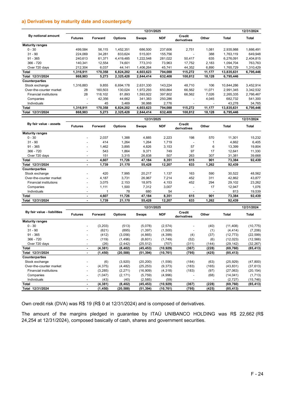 F - 24 a) Derivatives by maturity date and counterparty By notional amount 12/31/2025 12/31/2024 Futures Forward Options Swaps NDF Credit derivatives Other Total Total Maturity ranges 0 - 30 499,584 56,115 1,452,351 686,500 237,606 2,751 1,081 2,935,988 1,666,491 31 - 90 224,069 34,281 833,624 515,001 155,756 - 388 1,763,119 649,948 91 - 365 240,613 61,371 4,419,485 1,222,548 281,022 50,417 635 6,276,091 2,404,815 366 - 720 140,341 12,554 74,601 773,310 73,963 17,752 2,183 1,094,704 763,763 Over 720 days 212,304 6,037 44,141 1,406,264 45,741 44,352 6,890 1,765,729 1,310,429 Total 1,316,911 170,358 6,824,202 4,603,623 794,088 115,272 11,177 13,835,631 6,795,446 Total 12/31/2024 868,983 5,273 2,325,428 2,844,414 632,408 100,812 18,128 6,795,446 Counterparties Stock exchange 1,316,883 9,855 6,694,178 2,631,330 143,224 48,710 106 10,844,286 3,452,914 Over-the-counter market 28 160,503 130,024 1,972,293 650,864 66,562 11,071 2,991,345 3,342,532 Financial institutions 28 118,102 81,893 1,593,922 397,802 66,562 7,026 2,265,335 2,766,467 Companies - 42,356 44,662 341,383 250,286 - 4,045 682,732 541,300 Individuals - 45 3,469 36,988 2,776 - - 43,278 34,765 Total 1,316,911 170,358 6,824,202 4,603,623 794,088 115,272 11,177 13,835,631 6,795,446 Total 12/31/2024 868,983 5,273 2,325,428 2,844,414 632,408 100,812 18,128 6,795,446 By fair value - assets 12/31/2025 12/31/2024 Futures Forward Options Swaps NDF Credit derivatives Other Total Total Maturity ranges 0 - 30 - 2,037 1,388 4,885 2,223 198 570 11,301 15,232 31 - 90 - 414 1,264 1,264 1,719 - 1 4,662 6,405 91 - 365 - 1,462 3,895 4,826 3,153 57 6 13,399 19,804 366 - 720 - 543 1,864 9,371 749 97 17 12,641 11,330 Over 720 days - 151 3,315 26,838 507 263 307 31,381 39,668 Total - 4,607 11,726 47,184 8,351 615 901 73,384 92,439 Total 12/31/2024 - 1,739 21,170 55,428 12,207 633 1,262 92,439 Counterparties Stock exchange - 420 7,995 20,217 1,137 163 590 30,522 48,562 Over-the-counter market - 4,187 3,731 26,967 7,214 452 311 42,862 43,877 Financial institutions - 3,075 2,153 18,975 4,153 452 294 29,102 23,262 Companies - 1,111 1,500 7,312 3,007 - 17 12,947 1,076 Individuals - 1 78 680 54 - - 813 19,539 Total - 4,607 11,726 47,184 8,351 615 901 73,384 92,439 Total 12/31/2024 - 1,739 21,170 55,428 12,207 633 1,262 92,439 By fair value - liabilities 12/31/2025 12/31/2024 Futures Forward Options Swaps NDF Credit derivatives Other Total Total Maturity ranges 0 - 30 - (3,203) (513) (5,078) (2,574) - (40) (11,408) (10,775) 31 - 90 - (621) (895) (1,397) (1,500) - (1) (4,414) (7,206) 91 - 365 - (412) (3,056) (4,865) (4,399) (4) (37) (12,773) (22,599) 366 - 720 - (119) (1,496) (8,601) (1,749) (52) (6) (12,023) (12,566) Over 720 days - (26) (2,442) (25,512) (707) (311) (144) (29,142) (32,267) Total - (4,381) (8,402) (45,453) (10,929) (367) (228) (69,760) (85,413) Total 12/31/2024 - (1,450) (20,588) (51,394) (10,761) (795) (425) (85,413) Counterparties Stock exchange - (6) (3,920) (20,200) (1,556) (184) (63) (25,929) (47,800) Over-the-counter market - (4,375) (4,482) (25,253) (9,373) (183) (165) (43,831) (37,613) Financial institutions - (3,285) (2,271) (16,909) (4,318) (183) (97) (27,063) (20,154) Companies - (1,047) (2,171) (5,759) (4,996) - (68) (14,041) (1,713) Individuals - (43) (40) (2,585) (59) - - (2,727) (15,746) Total - (4,381) (8,402) (45,453) (10,929) (367) (228) (69,760) (85,413) Total 12/31/2024 - (1,450) (20,588) (51,394) (10,761) (795) (425) (85,413) Own credit risk (DVA) was R$ 19 (R$ 0 at 12/31/2024) and is composed of derivatives. The amount of the margins pledged in guarantee by ITAÚ UNIBANCO HOLDING was R$ 22,662 (R$ 24,254 at 12/31/2024), composed basically of cash, shares and government securities.