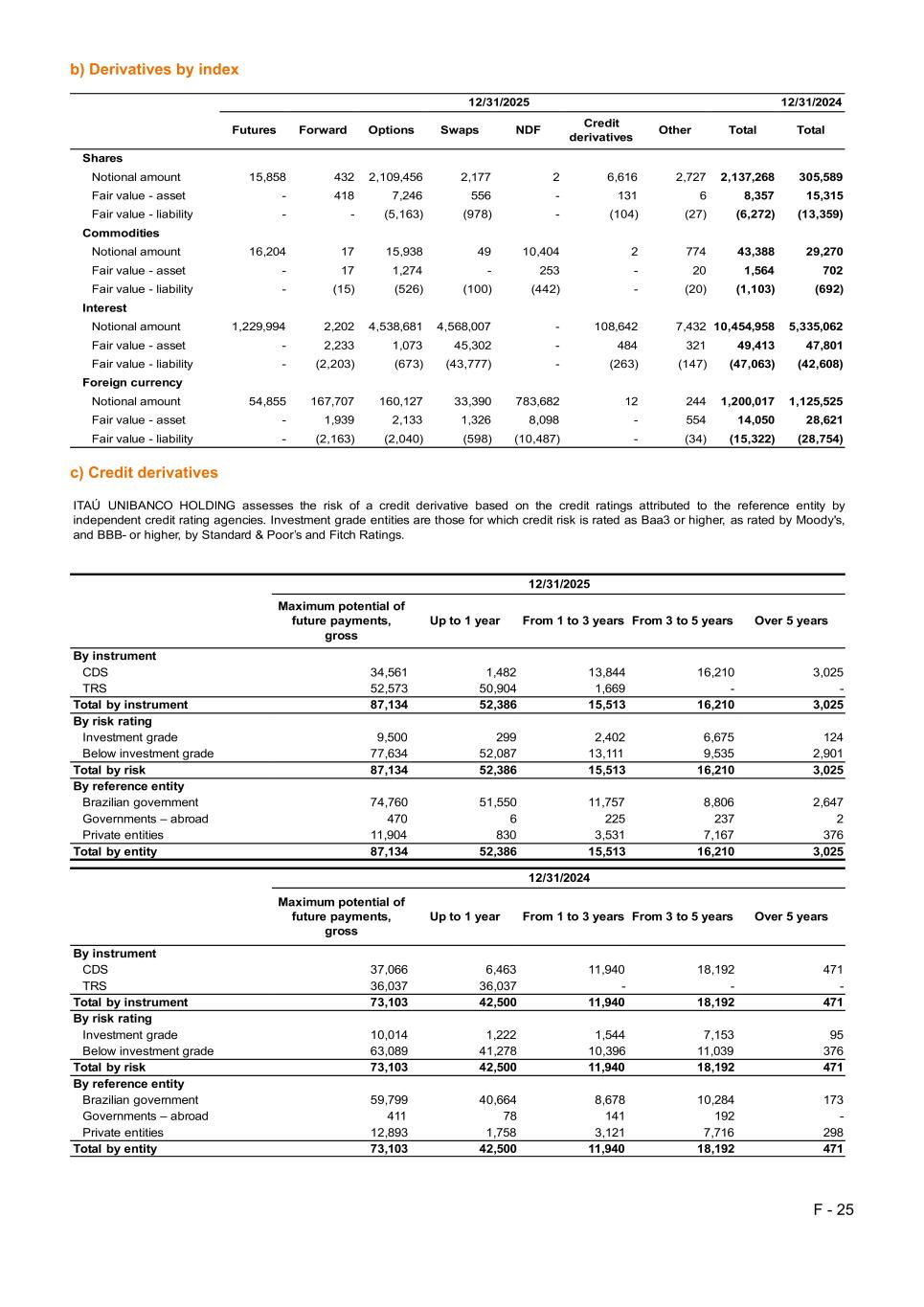 F - 25 b) Derivatives by index 12/31/2025 12/31/2024 Futures Forward Options Swaps NDF Credit derivatives Other Total Total Shares Notional amount 15,858 432 2,109,456 2,177 2 6,616 2,727 2,137,268 305,589 Fair value - asset - 418 7,246 556 - 131 6 8,357 15,315 Fair value - liability - - (5,163) (978) - (104) (27) (6,272) (13,359) Commodities Notional amount 16,204 17 15,938 49 10,404 2 774 43,388 29,270 Fair value - asset - 17 1,274 - 253 - 20 1,564 702 Fair value - liability - (15) (526) (100) (442) - (20) (1,103) (692) Interest Notional amount 1,229,994 2,202 4,538,681 4,568,007 - 108,642 7,432 10,454,958 5,335,062 Fair value - asset - 2,233 1,073 45,302 - 484 321 49,413 47,801 Fair value - liability - (2,203) (673) (43,777) - (263) (147) (47,063) (42,608) Foreign currency Notional amount 54,855 167,707 160,127 33,390 783,682 12 244 1,200,017 1,125,525 Fair value - asset - 1,939 2,133 1,326 8,098 - 554 14,050 28,621 Fair value - liability - (2,163) (2,040) (598) (10,487) - (34) (15,322) (28,754) c) Credit derivatives ITAÚ UNIBANCO HOLDING assesses the risk of a credit derivative based on the credit ratings attributed to the reference entity by independent credit rating agencies. Investment grade entities are those for which credit risk is rated as Baa3 or higher, as rated by Moody's, and BBB- or higher, by Standard & Poor’s and Fitch Ratings. 12/31/2025 Maximum potential of future payments, gross Up to 1 year From 1 to 3 years From 3 to 5 years Over 5 years By instrument CDS 34,561 1,482 13,844 16,210 3,025 TRS 52,573 50,904 1,669 - - Total by instrument 87,134 52,386 15,513 16,210 3,025 By risk rating Investment grade 9,500 299 2,402 6,675 124 Below investment grade 77,634 52,087 13,111 9,535 2,901 Total by risk 87,134 52,386 15,513 16,210 3,025 By reference entity Brazilian government 74,760 51,550 11,757 8,806 2,647 Governments – abroad 470 6 225 237 2 Private entities 11,904 830 3,531 7,167 376 Total by entity 87,134 52,386 15,513 16,210 3,025 12/31/2024 Maximum potential of future payments, gross Up to 1 year From 1 to 3 years From 3 to 5 years Over 5 years By instrument CDS 37,066 6,463 11,940 18,192 471 TRS 36,037 36,037 - - - Total by instrument 73,103 42,500 11,940 18,192 471 By risk rating Investment grade 10,014 1,222 1,544 7,153 95 Below investment grade 63,089 41,278 10,396 11,039 376 Total by risk 73,103 42,500 11,940 18,192 471 By reference entity Brazilian government 59,799 40,664 8,678 10,284 173 Governments – abroad 411 78 141 192 - Private entities 12,893 1,758 3,121 7,716 298 Total by entity 73,103 42,500 11,940 18,192 471