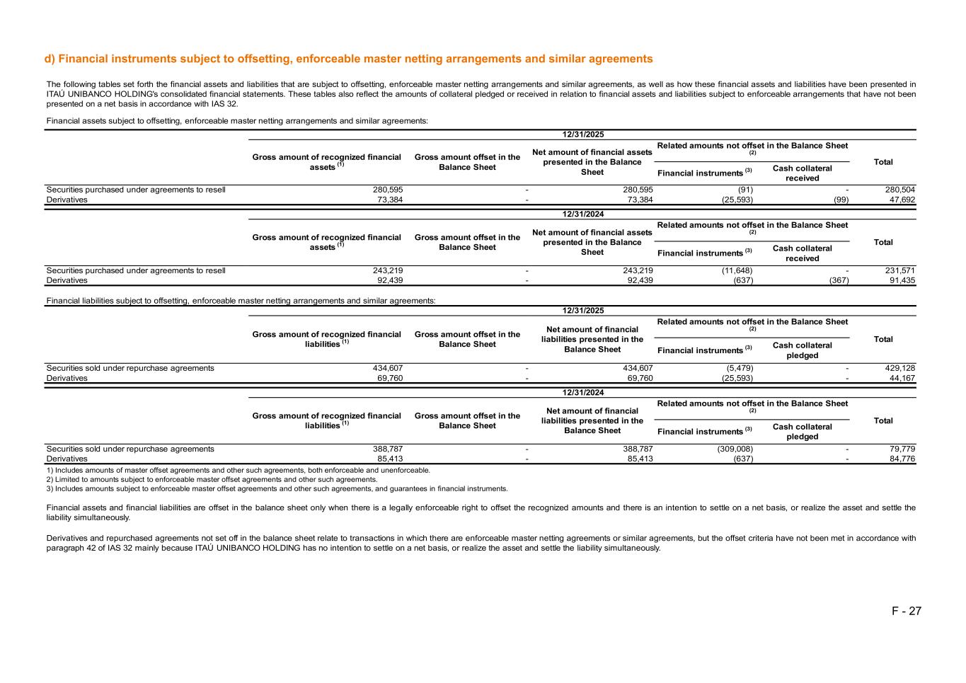 F - 27 d) Financial instruments subject to offsetting, enforceable master netting arrangements and similar agreements The following tables set forth the financial assets and liabilities that are subject to offsetting, enforceable master netting arrangements and similar agreements, as well as how these financial assets and liabilities have been presented in ITAÚ UNIBANCO HOLDING's consolidated financial statements. These tables also reflect the amounts of collateral pledged or received in relation to financial assets and liabilities subject to enforceable arrangements that have not been presented on a net basis in accordance with IAS 32. Financial assets subject to offsetting, enforceable master netting arrangements and similar agreements: 12/31/2025 Gross amount of recognized financial assets (1) Gross amount offset in the Balance Sheet Net amount of financial assets presented in the Balance Sheet Related amounts not offset in the Balance Sheet (2) Total Financial instruments (3) Cash collateral received Securities purchased under agreements to resell 280,595 - 280,595 (91) - 280,504 Derivatives 73,384 - 73,384 (25,593) (99) 47,692 12/31/2024 Gross amount of recognized financial assets (1) Gross amount offset in the Balance Sheet Net amount of financial assets presented in the Balance Sheet Related amounts not offset in the Balance Sheet (2) Total Financial instruments (3) Cash collateral received Securities purchased under agreements to resell 243,219 - 243,219 (11,648) - 231,571 Derivatives 92,439 - 92,439 (637) (367) 91,435 Financial liabilities subject to offsetting, enforceable master netting arrangements and similar agreements: 12/31/2025 Gross amount of recognized financial liabilities (1) Gross amount offset in the Balance Sheet Net amount of financial liabilities presented in the Balance Sheet Related amounts not offset in the Balance Sheet (2) Total Financial instruments (3) Cash collateral pledged Securities sold under repurchase agreements 434,607 - 434,607 (5,479) - 429,128 Derivatives 69,760 - 69,760 (25,593) - 44,167 12/31/2024 Gross amount of recognized financial liabilities (1) Gross amount offset in the Balance Sheet Net amount of financial liabilities presented in the Balance Sheet Related amounts not offset in the Balance Sheet (2) Total Financial instruments (3) Cash collateral pledged Securities sold under repurchase agreements 388,787 - 388,787 (309,008) - 79,779 Derivatives 85,413 - 85,413 (637) - 84,776 1) Includes amounts of master offset agreements and other such agreements, both enforceable and unenforceable. 2) Limited to amounts subject to enforceable master offset agreements and other such agreements. 3) Includes amounts subject to enforceable master offset agreements and other such agreements, and guarantees in financial instruments. Financial assets and financial liabilities are offset in the balance sheet only when there is a legally enforceable right to offset the recognized amounts and there is an intention to settle on a net basis, or realize the asset and settle the liability simultaneously. Derivatives and repurchased agreements not set off in the balance sheet relate to transactions in which there are enforceable master netting agreements or similar agreements, but the offset criteria have not been met in accordance with paragraph 42 of IAS 32 mainly because ITAÚ UNIBANCO HOLDING has no intention to settle on a net basis, or realize the asset and settle the liability simultaneously.