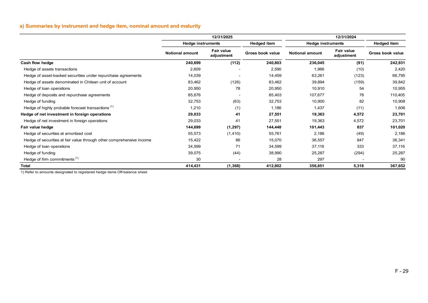 F - 29 a) Summaries by instrument and hedge item, nominal amount and maturity 12/31/2025 12/31/2024 Hedge instruments Hedged item Hedge instruments Hedged item Notional amount Fair value adjustment Gross book value Notional amount Fair value adjustment Gross book value Cash flow hedge 240,699 (112) 240,803 236,045 (91) 242,931 Hedge of assets transactions 2,609 - 2,590 1,966 (10) 2,420 Hedge of asset-backed securities under repurchase agreements 14,039 - 14,459 63,261 (123) 66,795 Hedge of assets denominated in Chilean unit of account 83,462 (126) 83,462 39,894 (159) 39,842 Hedge of loan operations 20,950 78 20,950 10,910 54 10,955 Hedge of deposits and repurchase agreements 85,676 - 85,403 107,677 76 110,405 Hedge of funding 32,753 (63) 32,753 10,900 82 10,908 Hedge of highly probable forecast transactions (1) 1,210 (1) 1,186 1,437 (11) 1,606 Hedge of net investment in foreign operations 29,033 41 27,551 19,363 4,572 23,701 Hedge of net investment in foreign operations 29,033 41 27,551 19,363 4,572 23,701 Fair value hedge 144,699 (1,297) 144,448 101,443 837 101,020 Hedge of securities at amortized cost 55,573 (1,410) 55,761 2,186 (49) 2,186 Hedge of securities at fair value through other comprehensive income 15,422 86 15,070 36,557 847 36,341 Hedge of loan operations 34,599 71 34,599 37,116 333 37,116 Hedge of funding 39,075 (44) 38,990 25,287 (294) 25,287 Hedge of firm commitments (1) 30 - 28 297 - 90 Total 414,431 (1,368) 412,802 356,851 5,318 367,652 1) Refer to amounts designated to registered hedge items Off-balance sheet.
