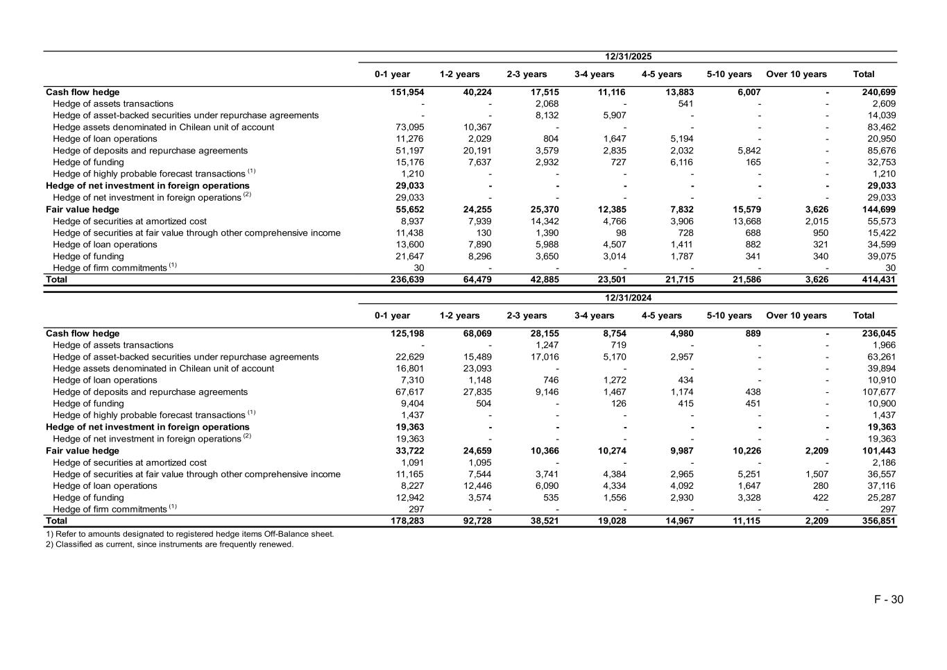 F - 30 12/31/2025 0-1 year 1-2 years 2-3 years 3-4 years 4-5 years 5-10 years Over 10 years Total Cash flow hedge 151,954 40,224 17,515 11,116 13,883 6,007 - 240,699 Hedge of assets transactions - - 2,068 - 541 - - 2,609 Hedge of asset-backed securities under repurchase agreements - - 8,132 5,907 - - - 14,039 Hedge assets denominated in Chilean unit of account 73,095 10,367 - - - - - 83,462 Hedge of loan operations 11,276 2,029 804 1,647 5,194 - - 20,950 Hedge of deposits and repurchase agreements 51,197 20,191 3,579 2,835 2,032 5,842 - 85,676 Hedge of funding 15,176 7,637 2,932 727 6,116 165 - 32,753 Hedge of highly probable forecast transactions (1) 1,210 - - - - - - 1,210 Hedge of net investment in foreign operations 29,033 - - - - - - 29,033 Hedge of net investment in foreign operations (2) 29,033 - - - - - - 29,033 Fair value hedge 55,652 24,255 25,370 12,385 7,832 15,579 3,626 144,699 Hedge of securities at amortized cost 8,937 7,939 14,342 4,766 3,906 13,668 2,015 55,573 Hedge of securities at fair value through other comprehensive income 11,438 130 1,390 98 728 688 950 15,422 Hedge of loan operations 13,600 7,890 5,988 4,507 1,411 882 321 34,599 Hedge of funding 21,647 8,296 3,650 3,014 1,787 341 340 39,075 Hedge of firm commitments (1) 30 - - - - - - 30 Total 236,639 64,479 42,885 23,501 21,715 21,586 3,626 414,431 12/31/2024 0-1 year 1-2 years 2-3 years 3-4 years 4-5 years 5-10 years Over 10 years Total Cash flow hedge 125,198 68,069 28,155 8,754 4,980 889 - 236,045 Hedge of assets transactions - - 1,247 719 - - - 1,966 Hedge of asset-backed securities under repurchase agreements 22,629 15,489 17,016 5,170 2,957 - - 63,261 Hedge assets denominated in Chilean unit of account 16,801 23,093 - - - - - 39,894 Hedge of loan operations 7,310 1,148 746 1,272 434 - - 10,910 Hedge of deposits and repurchase agreements 67,617 27,835 9,146 1,467 1,174 438 - 107,677 Hedge of funding 9,404 504 - 126 415 451 - 10,900 Hedge of highly probable forecast transactions (1) 1,437 - - - - - - 1,437 Hedge of net investment in foreign operations 19,363 - - - - - - 19,363 Hedge of net investment in foreign operations (2) 19,363 - - - - - - 19,363 Fair value hedge 33,722 24,659 10,366 10,274 9,987 10,226 2,209 101,443 Hedge of securities at amortized cost 1,091 1,095 - - - - - 2,186 Hedge of securities at fair value through other comprehensive income 11,165 7,544 3,741 4,384 2,965 5,251 1,507 36,557 Hedge of loan operations 8,227 12,446 6,090 4,334 4,092 1,647 280 37,116 Hedge of funding 12,942 3,574 535 1,556 2,930 3,328 422 25,287 Hedge of firm commitments (1) 297 - - - - - - 297 Total 178,283 92,728 38,521 19,028 14,967 11,115 2,209 356,851 1) Refer to amounts designated to registered hedge items Off-Balance sheet. 2) Classified as current, since instruments are frequently renewed.