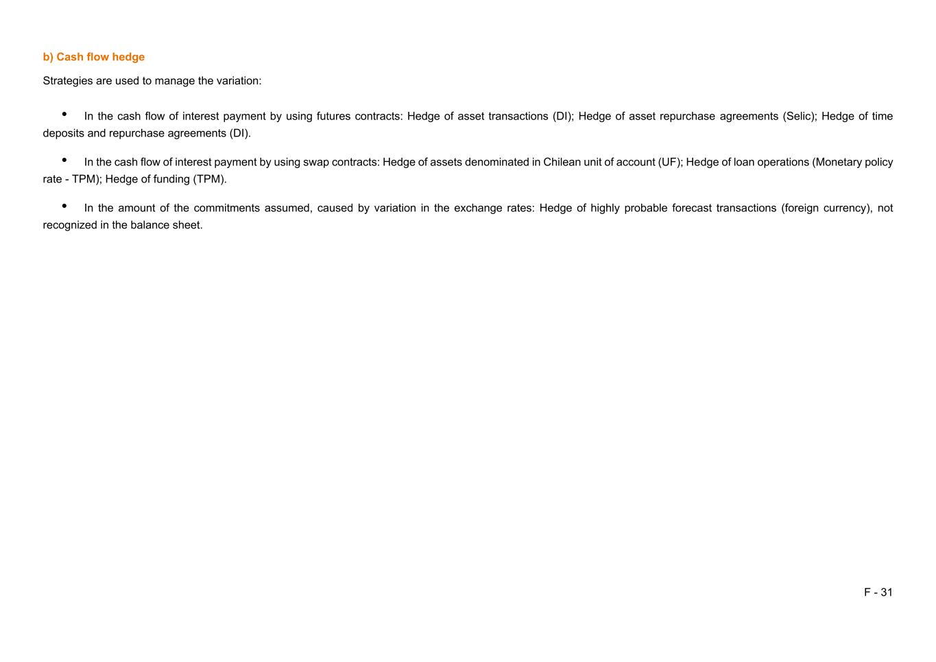 F - 31 b) Cash flow hedge Strategies are used to manage the variation: • In the cash flow of interest payment by using futures contracts: Hedge of asset transactions (DI); Hedge of asset repurchase agreements (Selic); Hedge of time deposits and repurchase agreements (DI). • In the cash flow of interest payment by using swap contracts: Hedge of assets denominated in Chilean unit of account (UF); Hedge of loan operations (Monetary policy rate - TPM); Hedge of funding (TPM). • In the amount of the commitments assumed, caused by variation in the exchange rates: Hedge of highly probable forecast transactions (foreign currency), not recognized in the balance sheet.