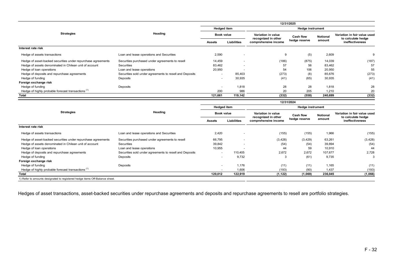 F - 32 Strategies Heading 12/31/2025 Hedged item Hedge instrument Book value Variation in value recognized in other comprehensive income Cash flow hedge reserve Notional amount Variation in fair value used to calculate hedge ineffectivenessAssets Liabilities Interest rate risk Hedge of assets transactions Loan and lease operations and Securities 2,590 - 9 (5) 2,609 9 Hedge of asset-backed securities under repurchase agreements Securities purchased under agreements to resell 14,459 - (186) (875) 14,039 (187) Hedge of assets denominated in Chilean unit of account Securities 83,462 - 57 56 83,462 57 Hedge of loan operations Loan and lease operations 20,950 - 54 106 20,950 55 Hedge of deposits and repurchase agreements Securities sold under agreements to resell and Deposits - 85,403 (273) (8) 85,676 (273) Hedge of funding Deposits - 30,935 (41) (65) 30,935 (41) Foreign exchange risk Hedge of funding Deposits - 1,818 28 28 1,818 28 Hedge of highly probable forecast transactions (1) 200 986 20 205 1,210 20 Total 121,661 119,142 (332) (558) 240,699 (332) Strategies Heading 12/31/2024 Hedged item Hedge instrument Book value Variation in value recognized in other comprehensive income Cash flow hedge reserve Notional amount Variation in fair value used to calculate hedge ineffectivenessAssets Liabilities Interest rate risk Hedge of assets transactions Loan and lease operations and Securities 2,420 - (155) (155) 1,966 (155) Hedge of asset-backed securities under repurchase agreements Securities purchased under agreements to resell 66,795 - (3,428) (3,429) 63,261 (3,428) Hedge of assets denominated in Chilean unit of account Securities 39,842 - (54) (54) 39,894 (54) Hedge of loan operations Loan and lease operations 10,955 - 44 59 10,910 44 Hedge of deposits and repurchase agreements Securities sold under agreements to resell and Deposits - 110,405 2,672 2,672 107,677 2,728 Hedge of funding Deposits - 9,732 3 (61) 9,735 3 Foreign exchange risk Hedge of funding Deposits - 1,176 (11) (11) 1,165 (11) Hedge of highly probable forecast transactions (1) - 1,606 (193) (90) 1,437 (193) Total 120,012 122,919 (1,122) (1,069) 236,045 (1,066) 1) Refer to amounts designated to registered hedge items Off-Balance sheet. Hedges of asset transactions, asset-backed securities under repurchase agreements and deposits and repurchase agreements to resell are portfolio strategies.