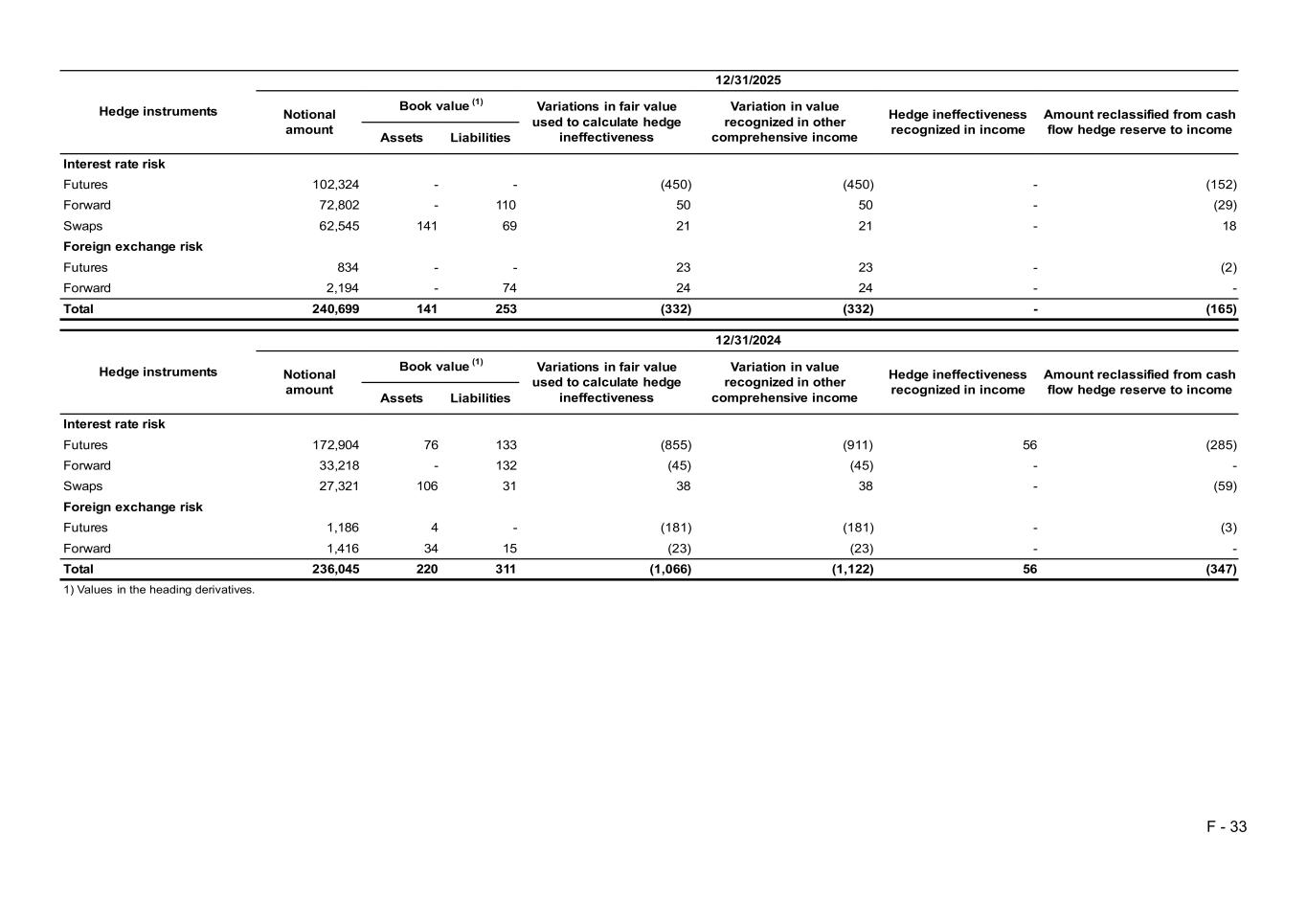 F - 33 Hedge instruments 12/31/2025 Notional amount Book value (1) Variations in fair value used to calculate hedge ineffectiveness Variation in value recognized in other comprehensive income Hedge ineffectiveness recognized in income Amount reclassified from cash flow hedge reserve to income Assets Liabilities Interest rate risk Futures 102,324 - - (450) (450) - (152) Forward 72,802 - 110 50 50 - (29) Swaps 62,545 141 69 21 21 - 18 Foreign exchange risk Futures 834 - - 23 23 - (2) Forward 2,194 - 74 24 24 - - Total 240,699 141 253 (332) (332) - (165) Hedge instruments 12/31/2024 Notional amount Book value (1) Variations in fair value used to calculate hedge ineffectiveness Variation in value recognized in other comprehensive income Hedge ineffectiveness recognized in income Amount reclassified from cash flow hedge reserve to income Assets Liabilities Interest rate risk Futures 172,904 76 133 (855) (911) 56 (285) Forward 33,218 - 132 (45) (45) - - Swaps 27,321 106 31 38 38 - (59) Foreign exchange risk Futures 1,186 4 - (181) (181) - (3) Forward 1,416 34 15 (23) (23) - - Total 236,045 220 311 (1,066) (1,122) 56 (347) 1) Values in the heading derivatives.