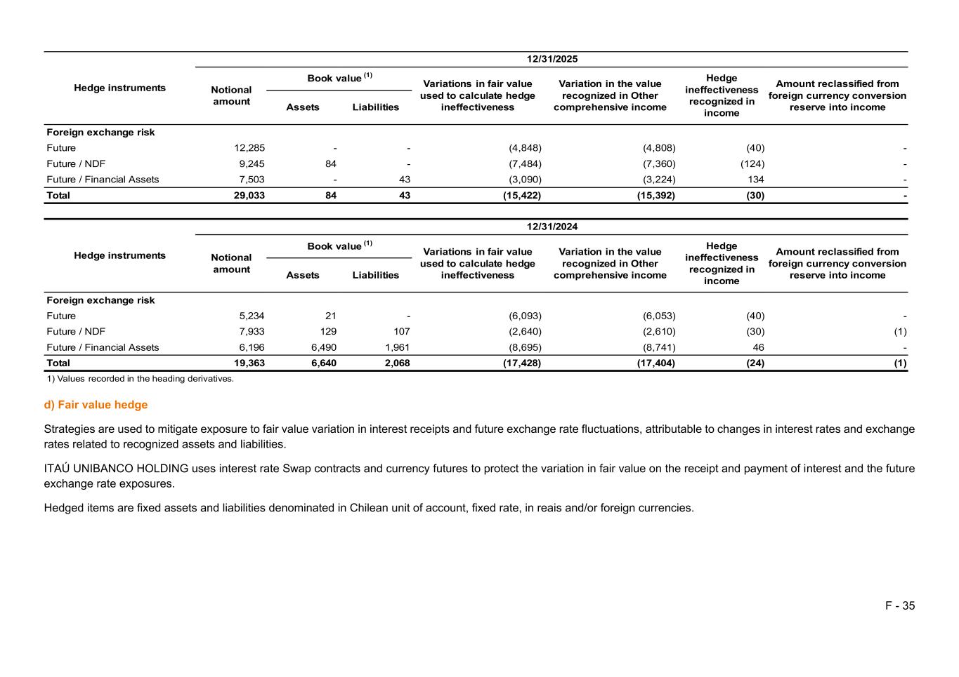 F - 35 Hedge instruments 12/31/2025 Notional amount Book value (1) Variations in fair value used to calculate hedge ineffectiveness Variation in the value recognized in Other comprehensive income Hedge ineffectiveness recognized in income Amount reclassified from foreign currency conversion reserve into incomeAssets Liabilities Foreign exchange risk Future 12,285 - - (4,848) (4,808) (40) - Future / NDF 9,245 84 - (7,484) (7,360) (124) - Future / Financial Assets 7,503 - 43 (3,090) (3,224) 134 - Total 29,033 84 43 (15,422) (15,392) (30) - Hedge instruments 12/31/2024 Notional amount Book value (1) Variations in fair value used to calculate hedge ineffectiveness Variation in the value recognized in Other comprehensive income Hedge ineffectiveness recognized in income Amount reclassified from foreign currency conversion reserve into incomeAssets Liabilities Foreign exchange risk Future 5,234 21 - (6,093) (6,053) (40) - Future / NDF 7,933 129 107 (2,640) (2,610) (30) (1) Future / Financial Assets 6,196 6,490 1,961 (8,695) (8,741) 46 - Total 19,363 6,640 2,068 (17,428) (17,404) (24) (1) 1) Values recorded in the heading derivatives. d) Fair value hedge Strategies are used to mitigate exposure to fair value variation in interest receipts and future exchange rate fluctuations, attributable to changes in interest rates and exchange rates related to recognized assets and liabilities. ITAÚ UNIBANCO HOLDING uses interest rate Swap contracts and currency futures to protect the variation in fair value on the receipt and payment of interest and the future exchange rate exposures. Hedged items are fixed assets and liabilities denominated in Chilean unit of account, fixed rate, in reais and/or foreign currencies.