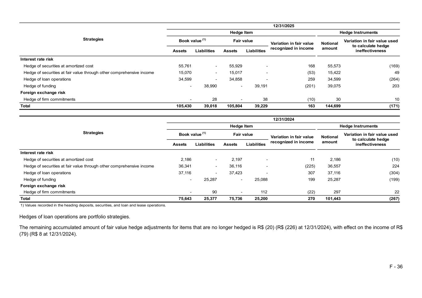 F - 36 Strategies 12/31/2025 Hedge Item Hedge Instruments Book value (1) Fair value Variation in fair value recognized in income Notional amount Variation in fair value used to calculate hedge ineffectivenessAssets Liabilities Assets Liabilities Interest rate risk Hedge of securities at amortized cost 55,761 - 55,929 - 168 55,573 (169) Hedge of securities at fair value through other comprehensive income 15,070 - 15,017 - (53) 15,422 49 Hedge of loan operations 34,599 - 34,858 - 259 34,599 (264) Hedge of funding - 38,990 - 39,191 (201) 39,075 203 Foreign exchange risk Hedge of firm commitments - 28 - 38 (10) 30 10 Total 105,430 39,018 105,804 39,229 163 144,699 (171) Strategies 12/31/2024 Hedge Item Hedge Instruments Book value (1) Fair value Variation in fair value recognized in income Notional amount Variation in fair value used to calculate hedge ineffectivenessAssets Liabilities Assets Liabilities Interest rate risk Hedge of securities at amortized cost 2,186 - 2,197 - 11 2,186 (10) Hedge of securities at fair value through other comprehensive income 36,341 - 36,116 - (225) 36,557 224 Hedge of loan operations 37,116 - 37,423 - 307 37,116 (304) Hedge of funding - 25,287 - 25,088 199 25,287 (199) Foreign exchange risk Hedge of firm commitments - 90 - 112 (22) 297 22 Total 75,643 25,377 75,736 25,200 270 101,443 (267) 1) Values recorded in the heading deposits, securities, and loan and lease operations. Hedges of loan operations are portfolio strategies. The remaining accumulated amount of fair value hedge adjustments for items that are no longer hedged is R$ (20) (R$ (226) at 12/31/2024), with effect on the income of R$ (79) (R$ 8 at 12/31/2024).